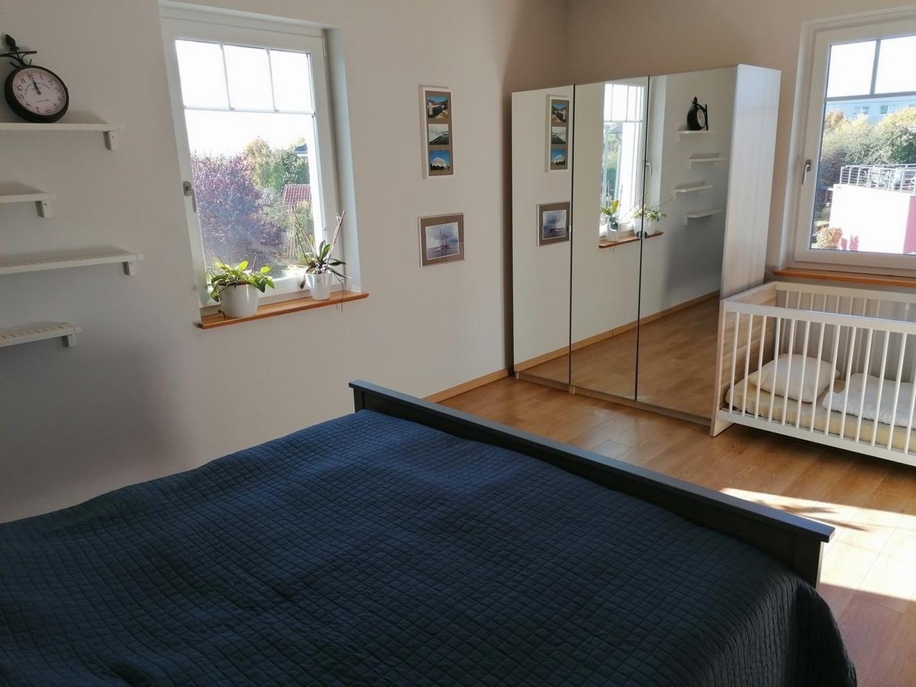 - Schlafzimmer mit Doppelbett, Kinderbett und Kleiderschrank