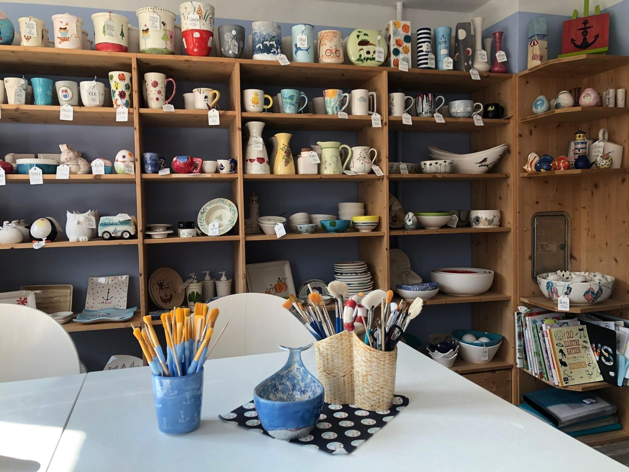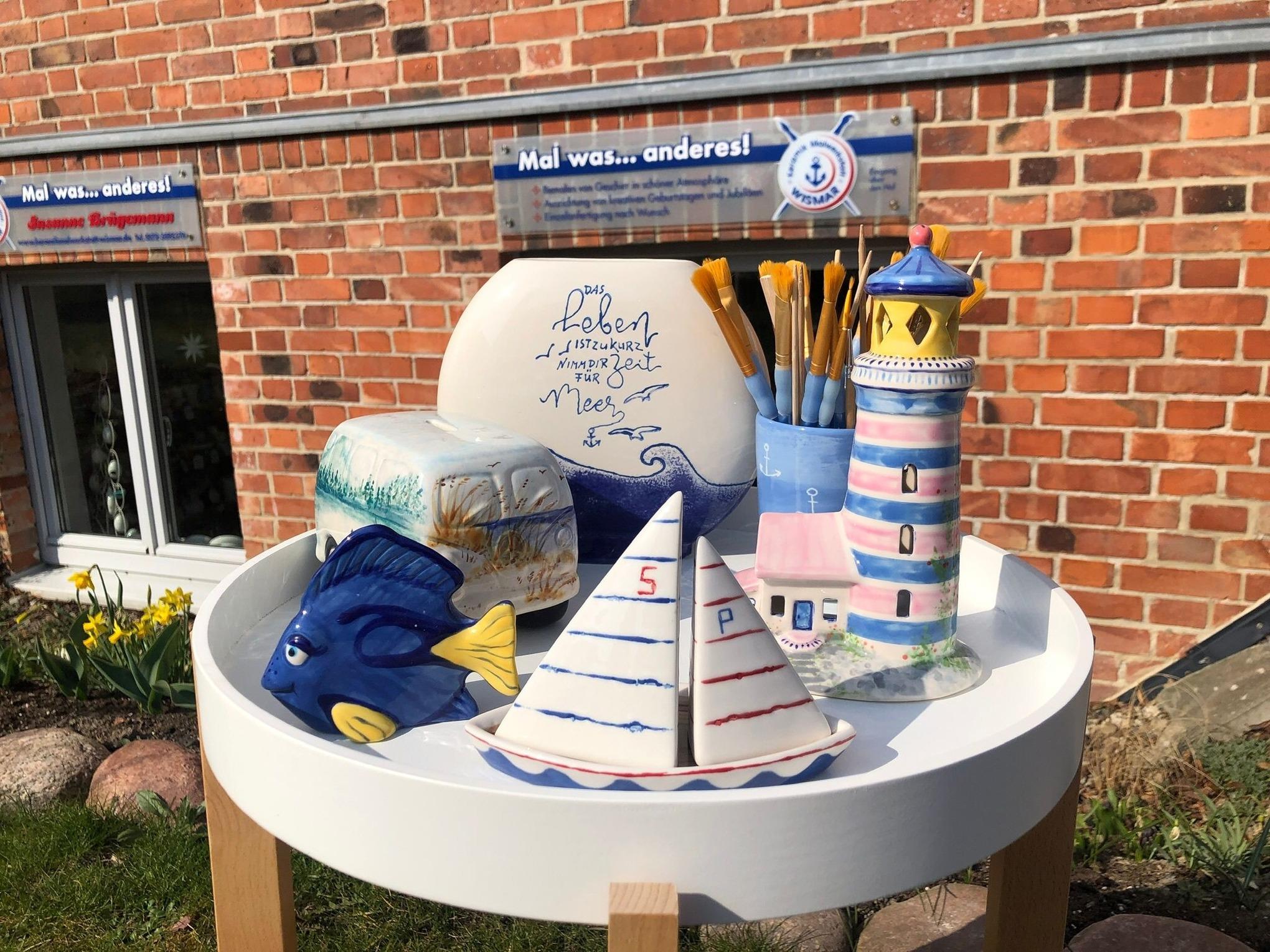 Direkt im Haus, nur eine Treppe tiefer, befindet sich meine KERAMIK-MALWERKSTATT. Hier kann nach Herzenslust Geschirr bemalt werden. Und wer nicht selbst malen möchte, kann sich über eine große Auswahl an fertigen Unikaten freuen. Schöne Erinnerungsstücke für ein selber und Ideale Mitbringsel für Freunde und Familie.