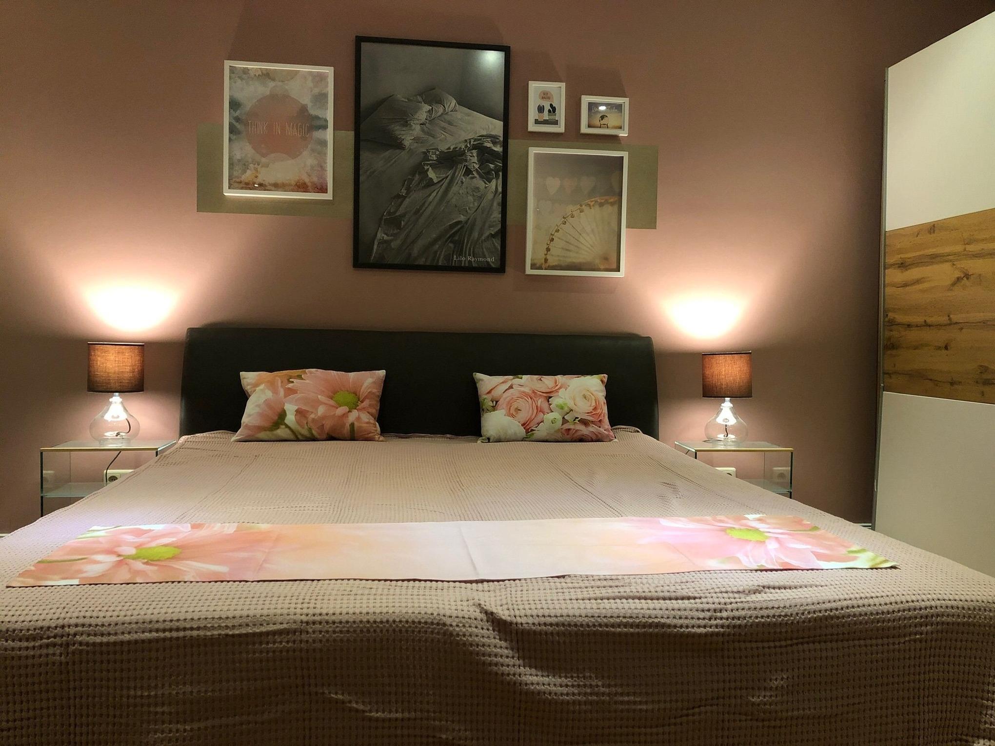 Die Ferienwohnung besteht aus einem großen Schlafzimmer mit Doppelbett (Komforthöhe, Breite 1,8 m), Schrank.