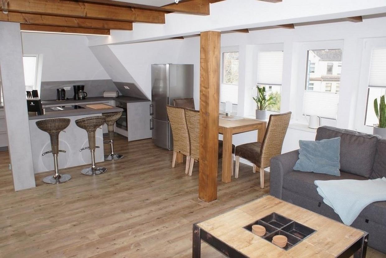 Mittelpunkt unserer Wohnung bildet das großzügige Wohnzimmer mit bequemer Couchlandschaft, großem Flat-TV, gemütlichen Essbereich für 4 Personen und einer modernen offenen Küche.