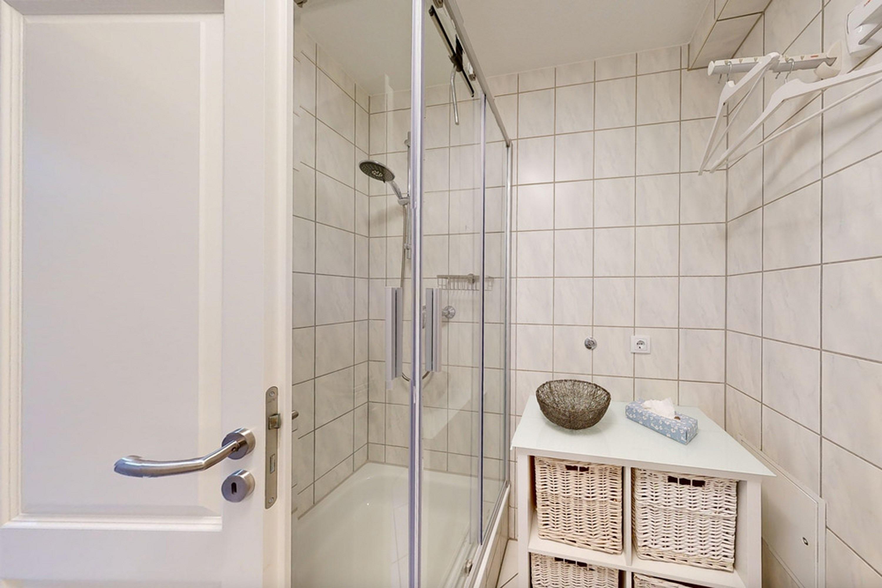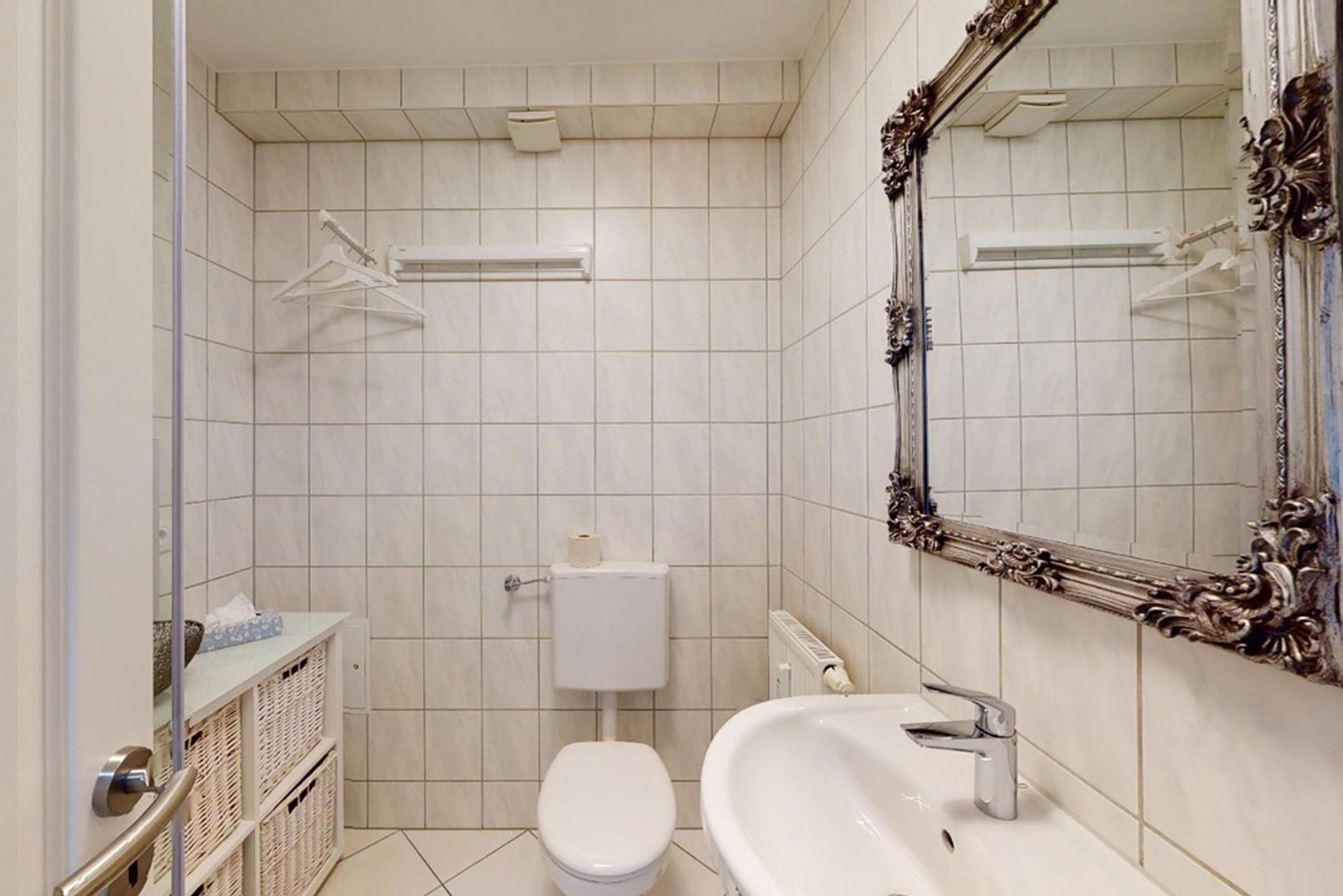 - Badezimmer mit Dusche, Waschtisch und Toilette