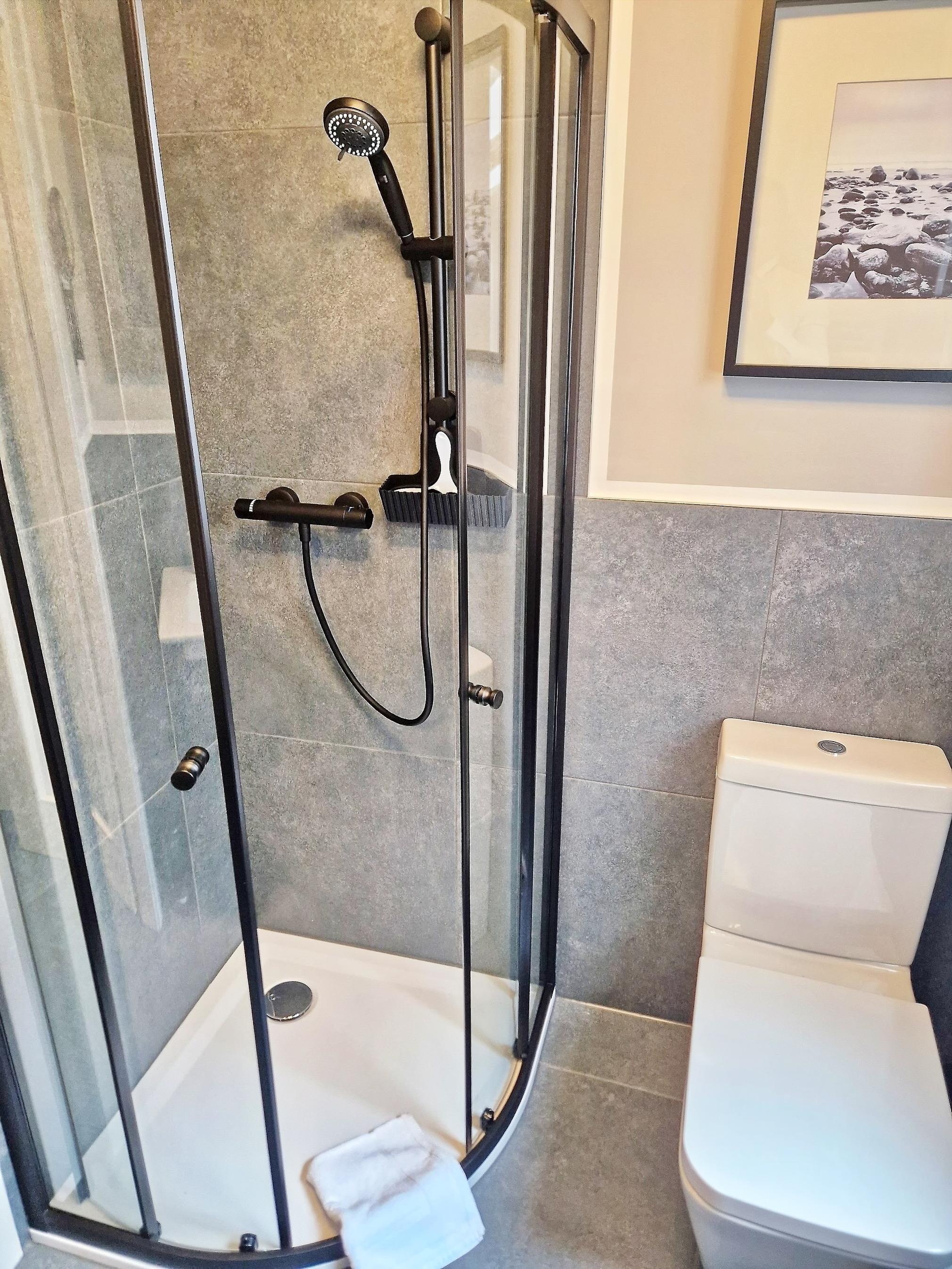 Modernes Duschbad mit ebenerdiger Dusche, hochwertigen Armaturen und Handtuchheizkörper – für einen frischen Start in den Tag.
