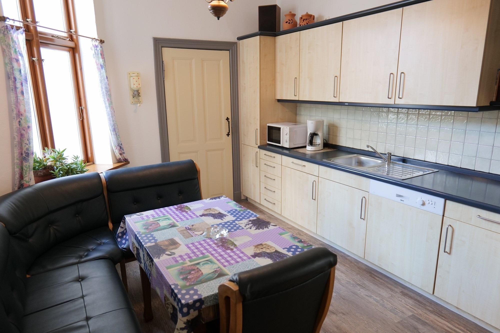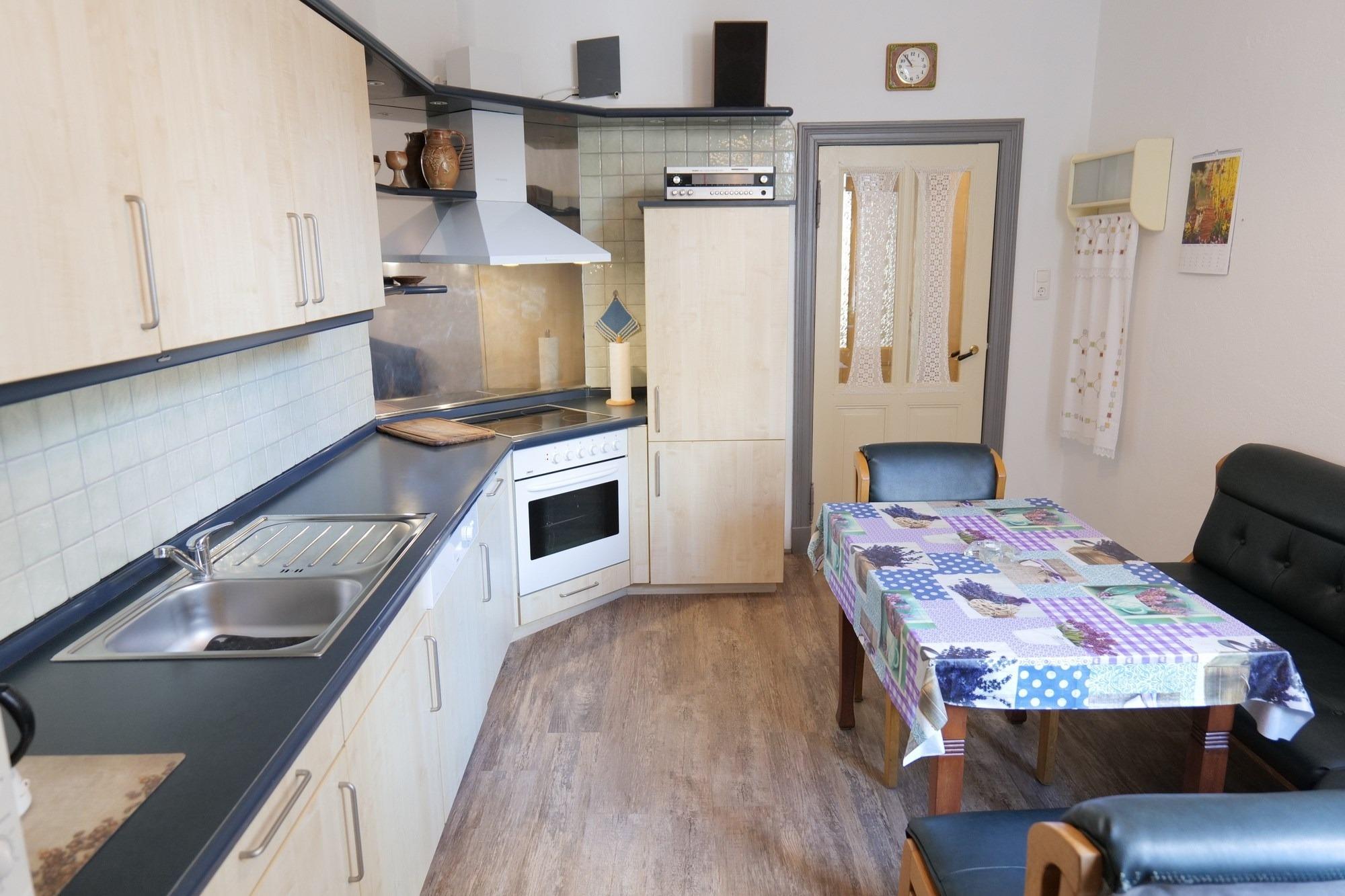 - vollausgestattete Küche mit Essbereich, u.a. mit Geschirrspüler, Ceran-Herd, Backofen, Kühlschrank mit Gefrierteil, Mikrowelle, Kaffeemaschine, Wasserkocher, Toaster, Küchenutensilien, Radio