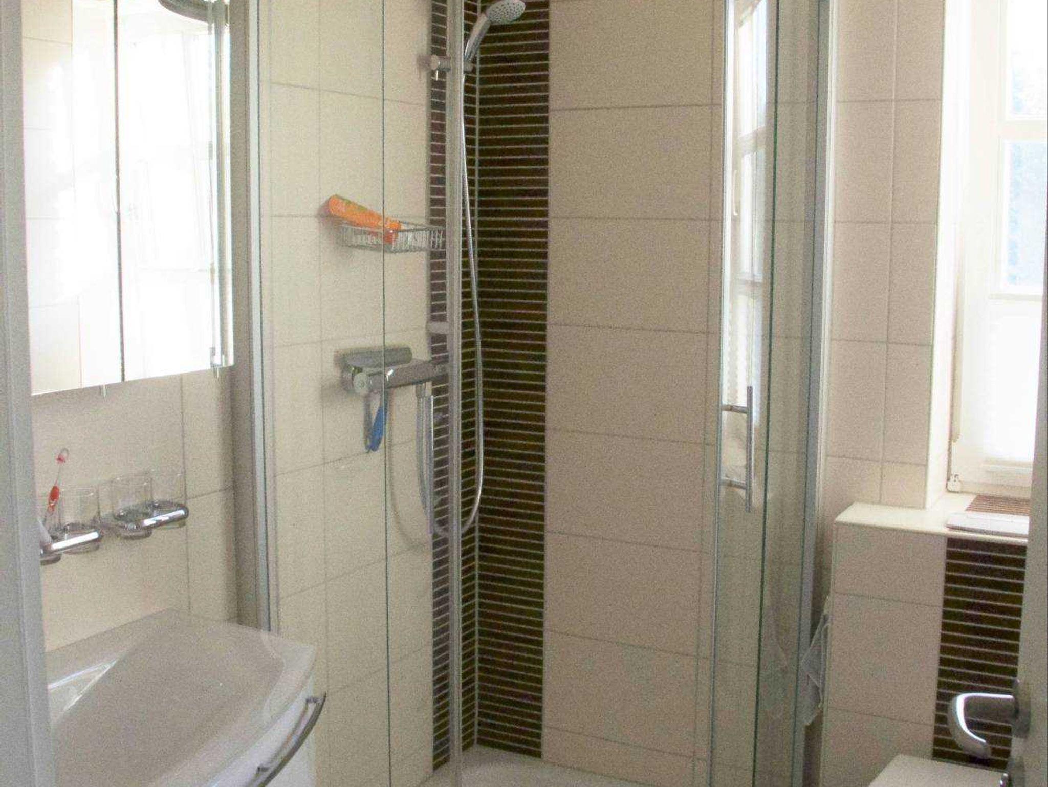 Sanitär: Föhn, Handtuchheizkörper, Schminkspiegel, Walk-In Dusche.