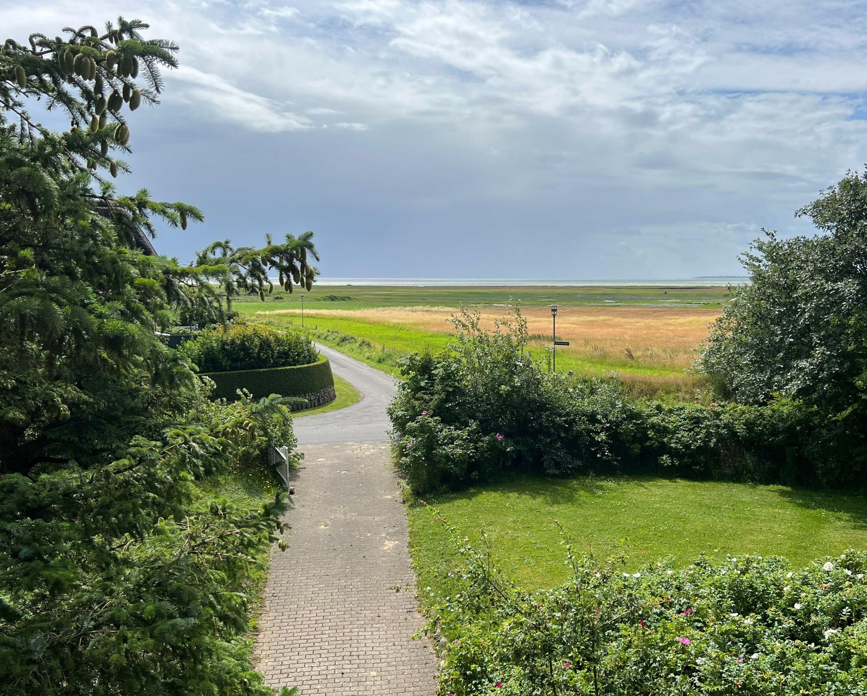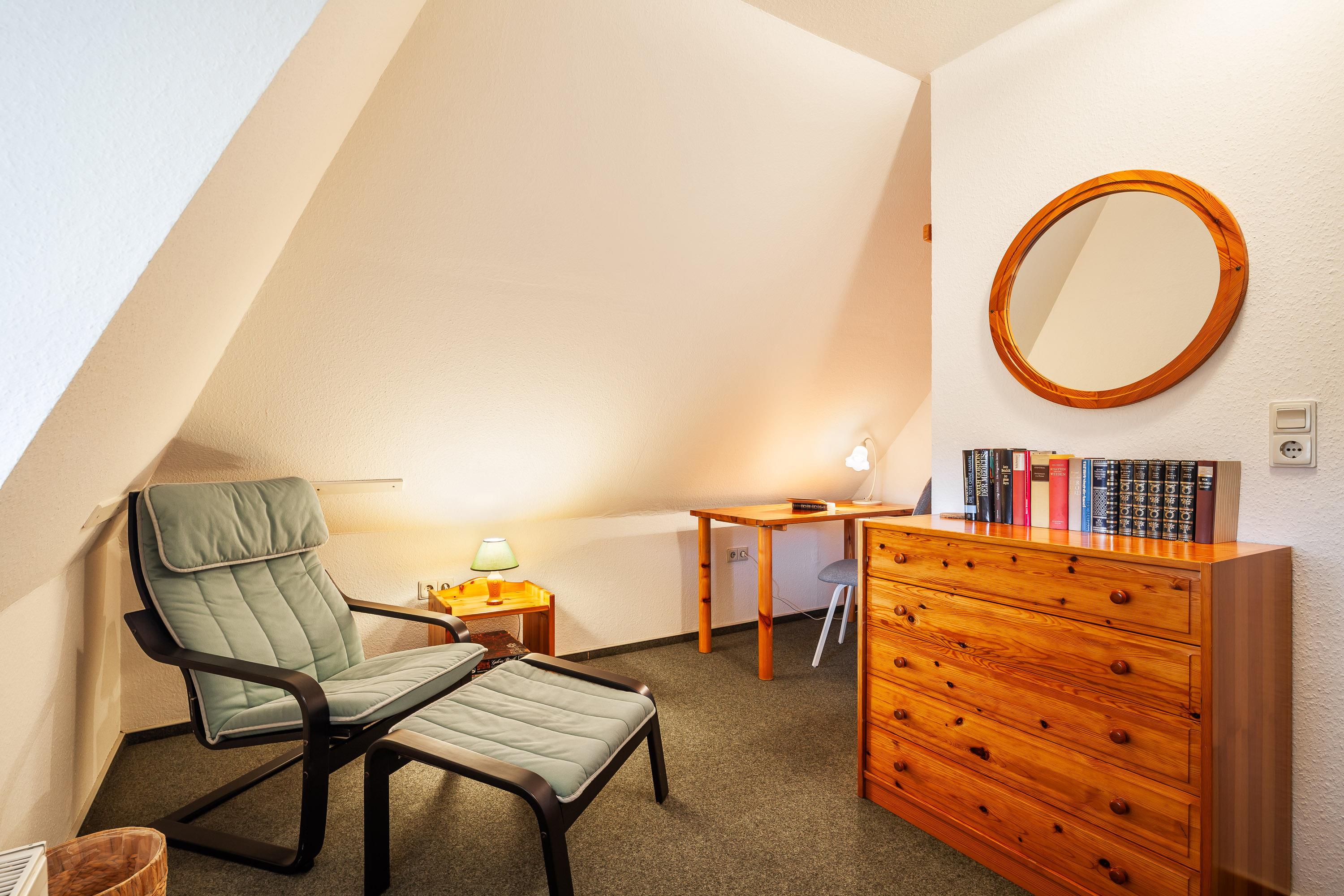 Ein Spitzbodenzimmer bietet Rückzugs- und Spiel- oder Arbeitsmöglichkeit. Von der Terrasse aus haben Sie einen unverbauten Blick über die Salzwiesen zum Wattenmeer und zur Insel Amrum.