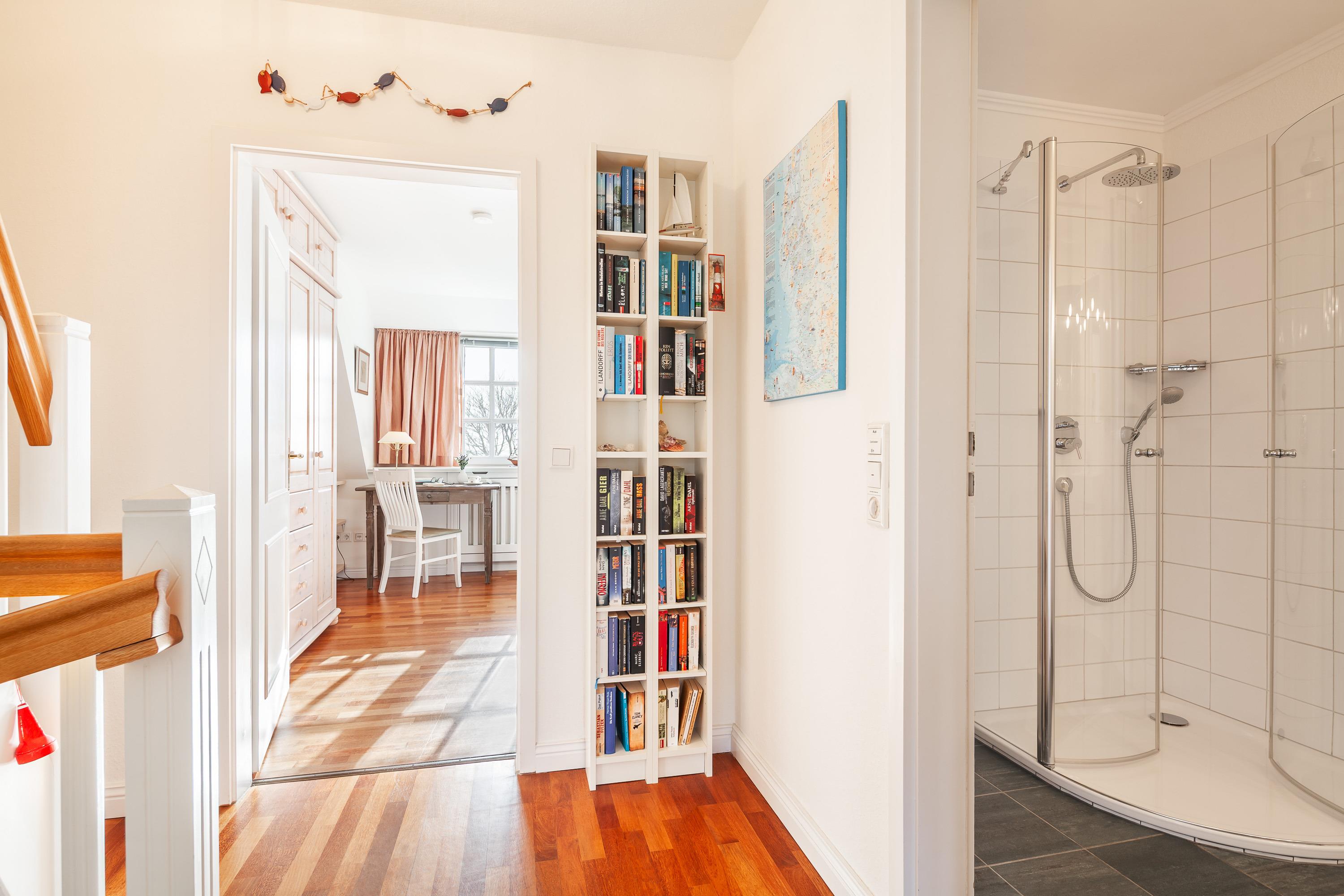 Im Obergeschoss befinden sich zwei geräumige Schlafzimmer einmal mit zwei Einzelbetten und Doppelbett. Auch von hier haben Sie einen herrlichen Meerblick. Außerdem ist auf der Etage ein Duschbad mit WC. Das Haus ist im Obergeschoss mit Parkettboden und im Erdgeschoss mit Fließenboden ausgestattet.