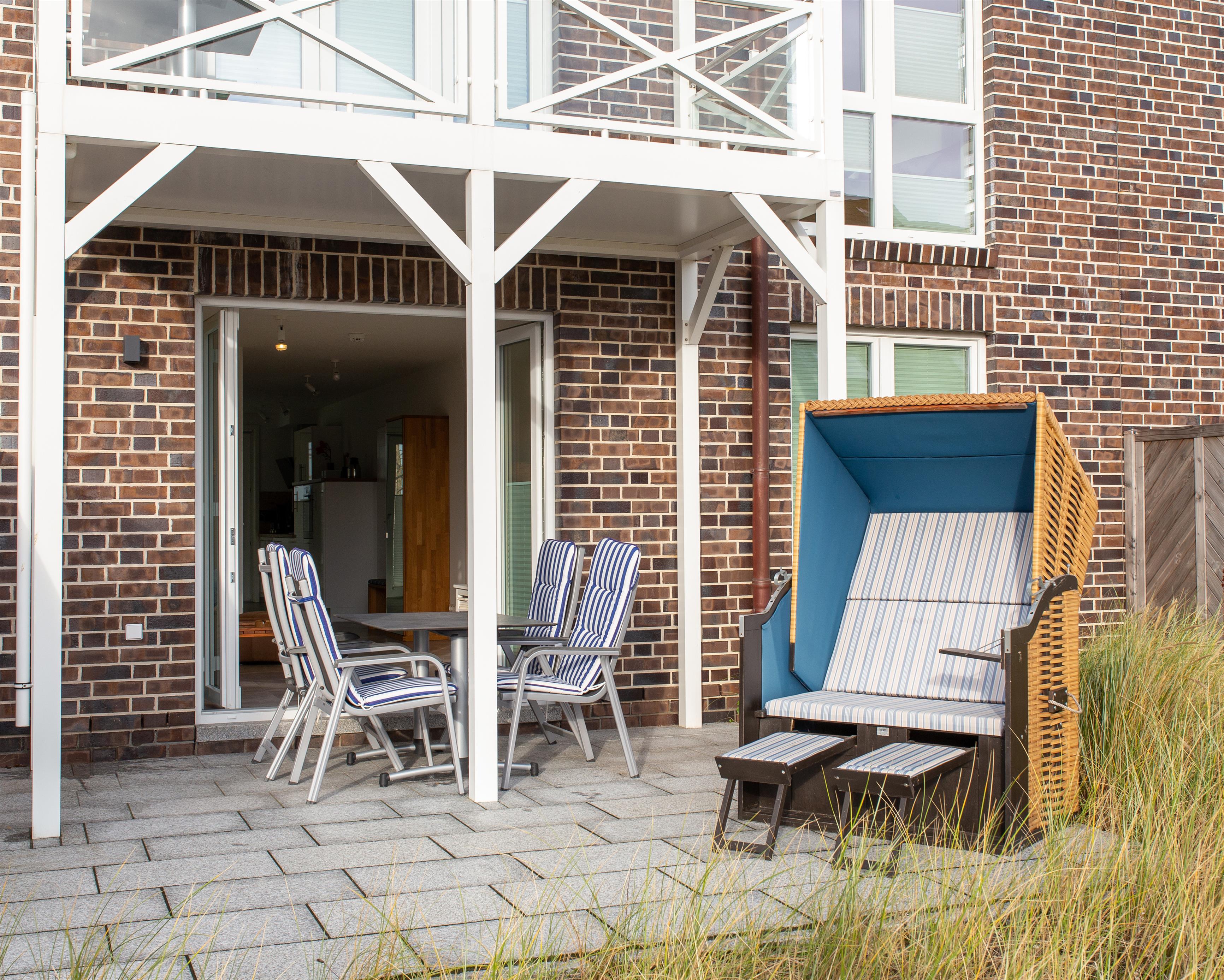 Eine nach Süden ausgerichtete Terrasse ist direkt vom Wohnzimmer aus zu erreichen. Dort finden Sie einen Strandkorb und Gartenmöbel vor. Zudem steht Ihnen auf der nördlichen Seite der Ferienwohnung ein Balkon mit Möbeln und Meerblick zur Verfügung.