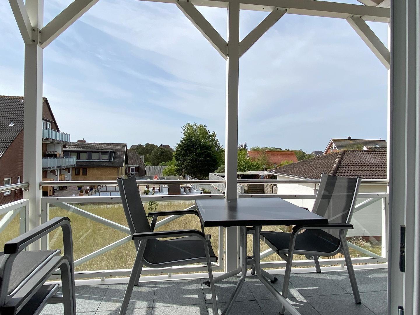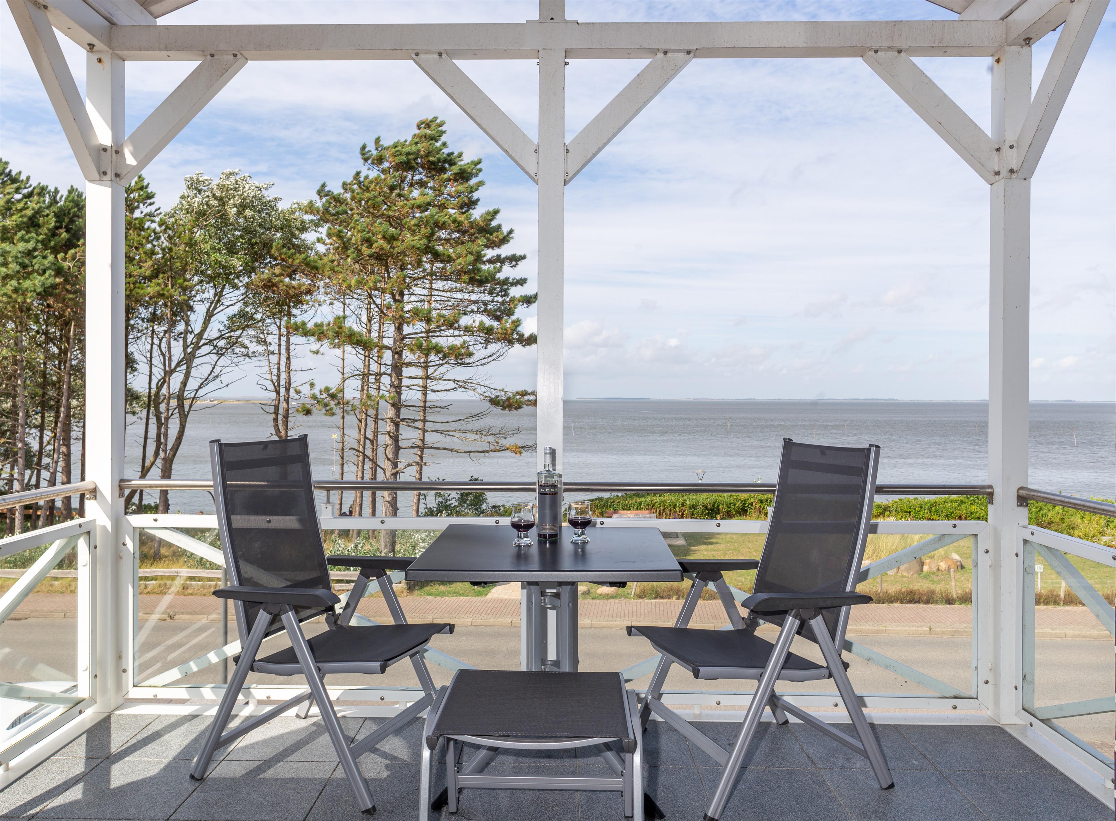 Die Küche mit Essbereich und eigenem Balkon bietet einen herrlichen Blick auf das Wattenmeer und die Gezeiten. Bis nach Steenodde, Norddorf und sogar zu der Nachbarinsel Föhr reicht die unvergessliche Sicht.