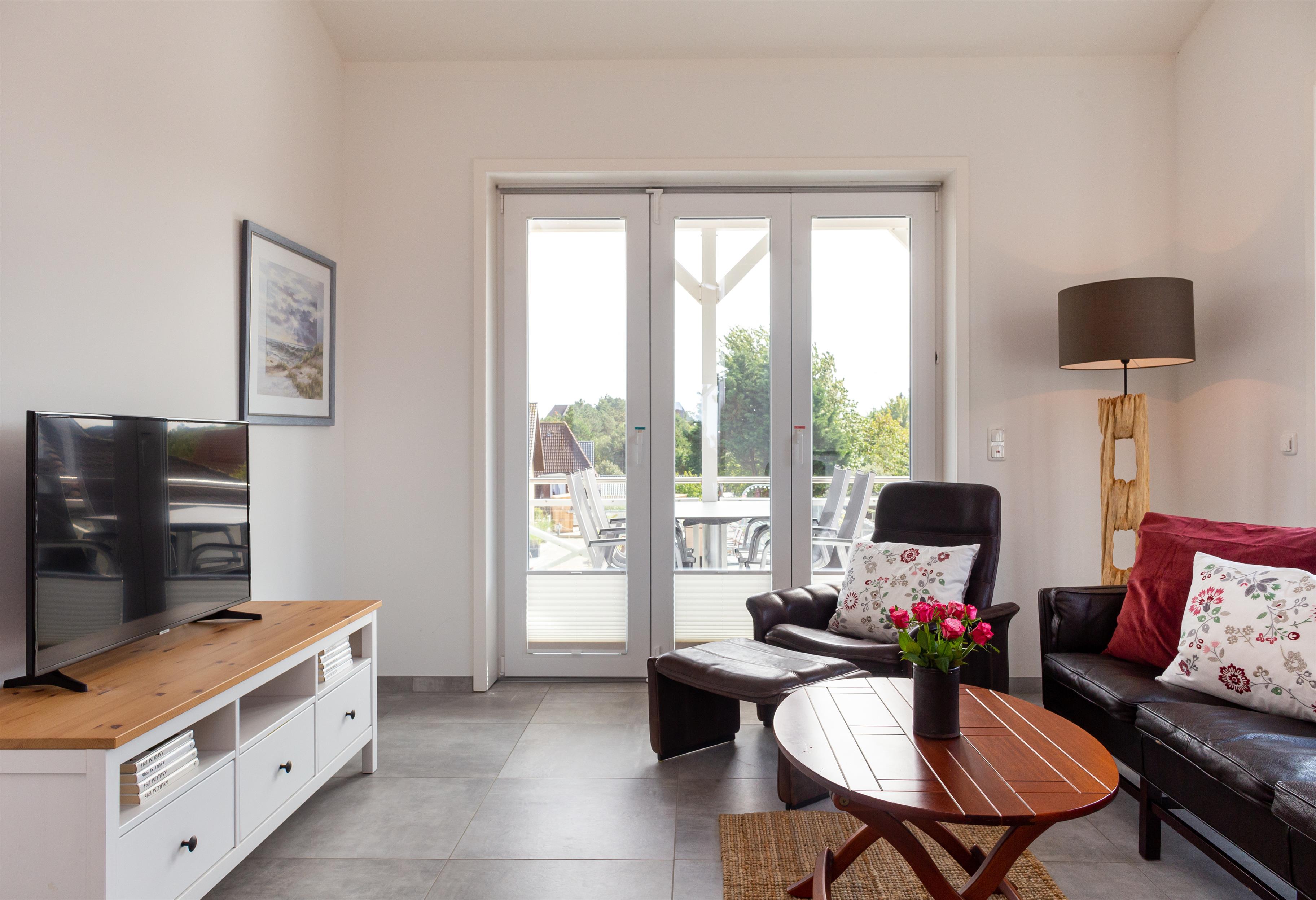 Im Wohnzimmer - mit direktem Zugang zum Balkon - befindet sich ein Sat-TV Gerät, sowie ein Sofa und weitere Sitzmöglichkeiten für bis zu vier Personen.