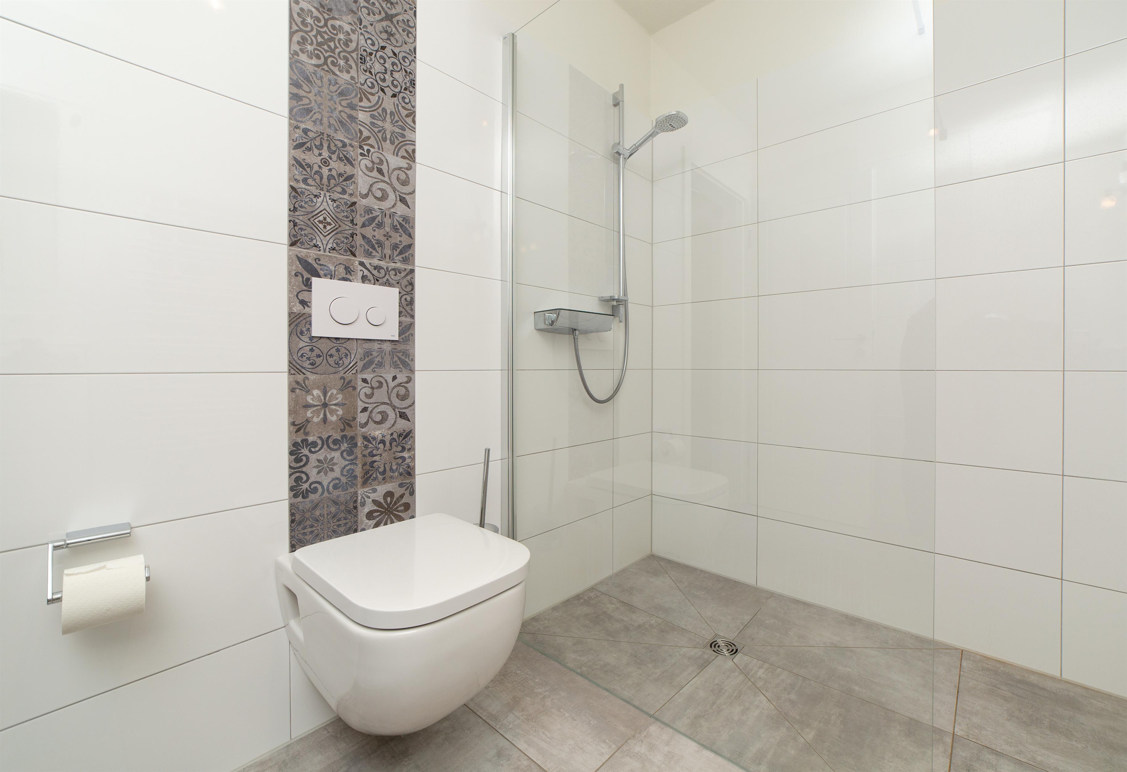 Zudem erwartet sie ein modernes Badezimmer mit ebenerdiger Dusche und WC sowie ein separates Gäste-WC.