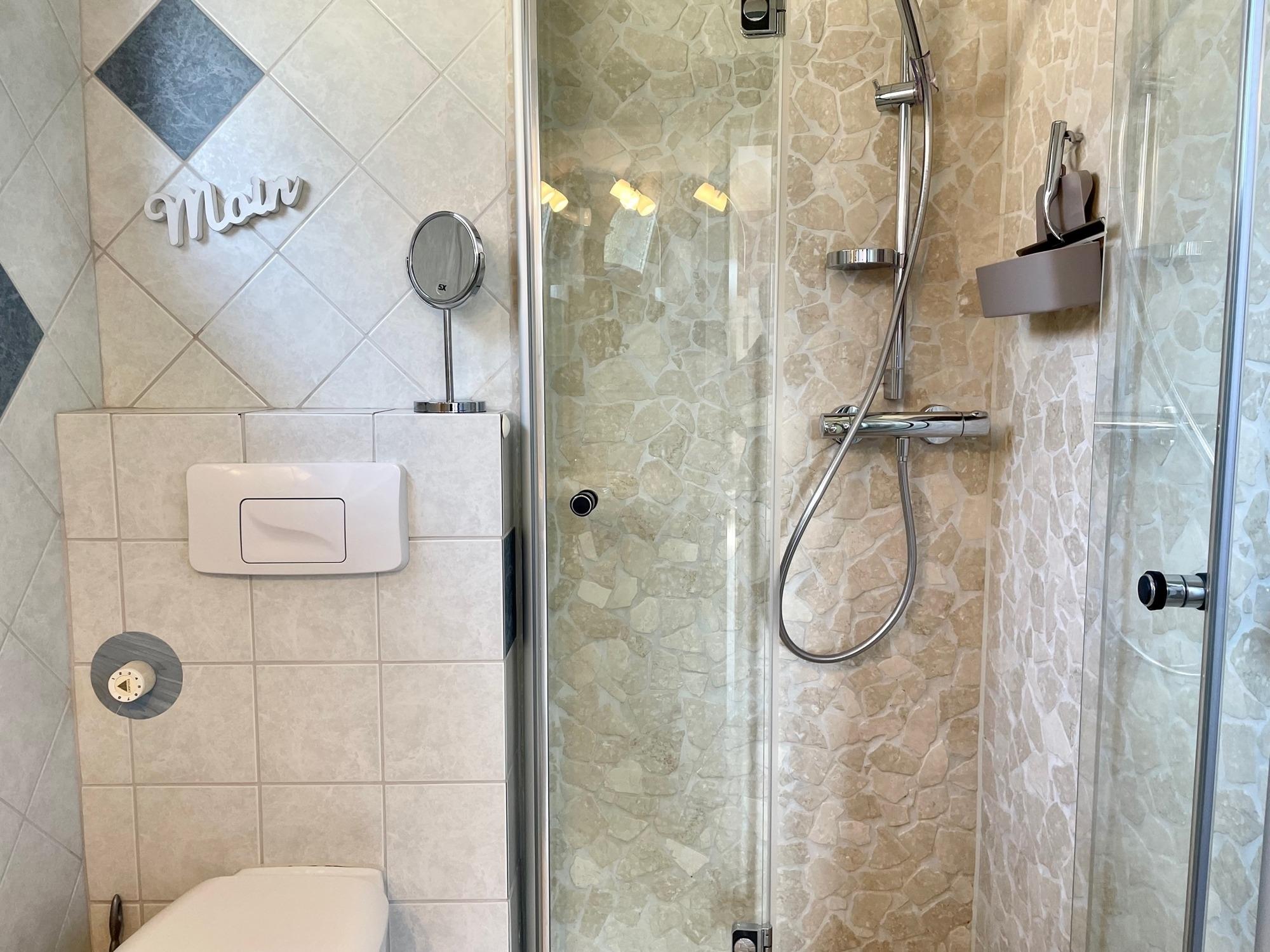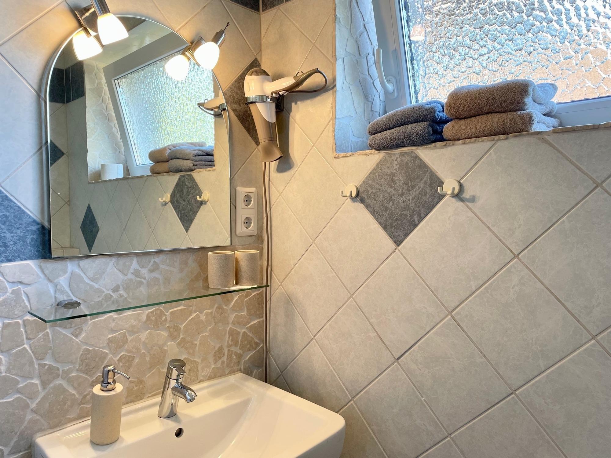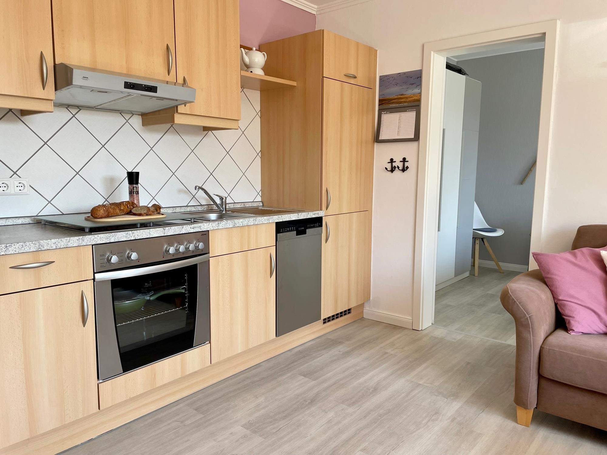 In der Wohnküche, mit nettem Essbereich und gemütlicher Sofaecke, befindet sich ein Flachbild-TV und ein CD-Player mit Radio. Im Duschbad sind Handtücher und Fön vorhanden, der Duschbereich ist ebenerdig und mit Fußbodenheizung ausgestattet.