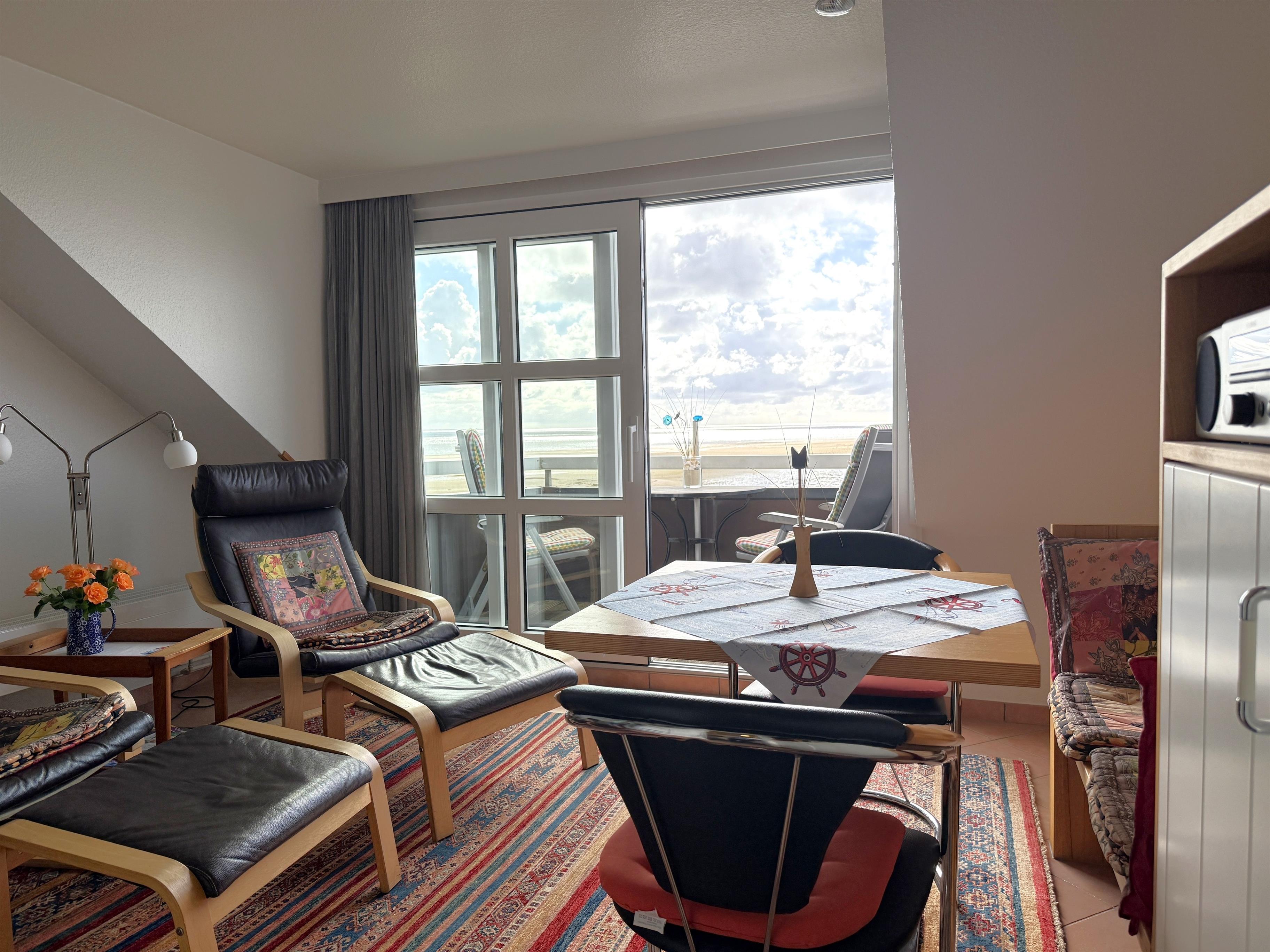 Genießen Sie unverbaute Aussicht auf die Nordsee von Ihrem eigenen Balkon aus oder schmökern Sie im gemütlichen Wohn-/Essbereich in einem Buch.