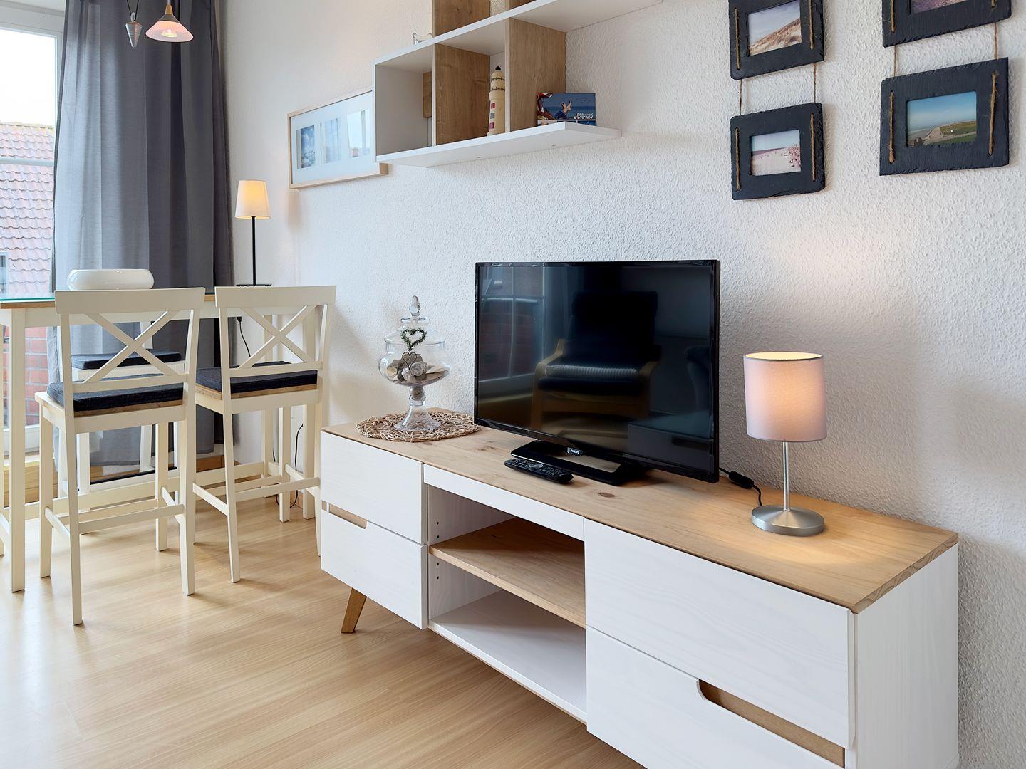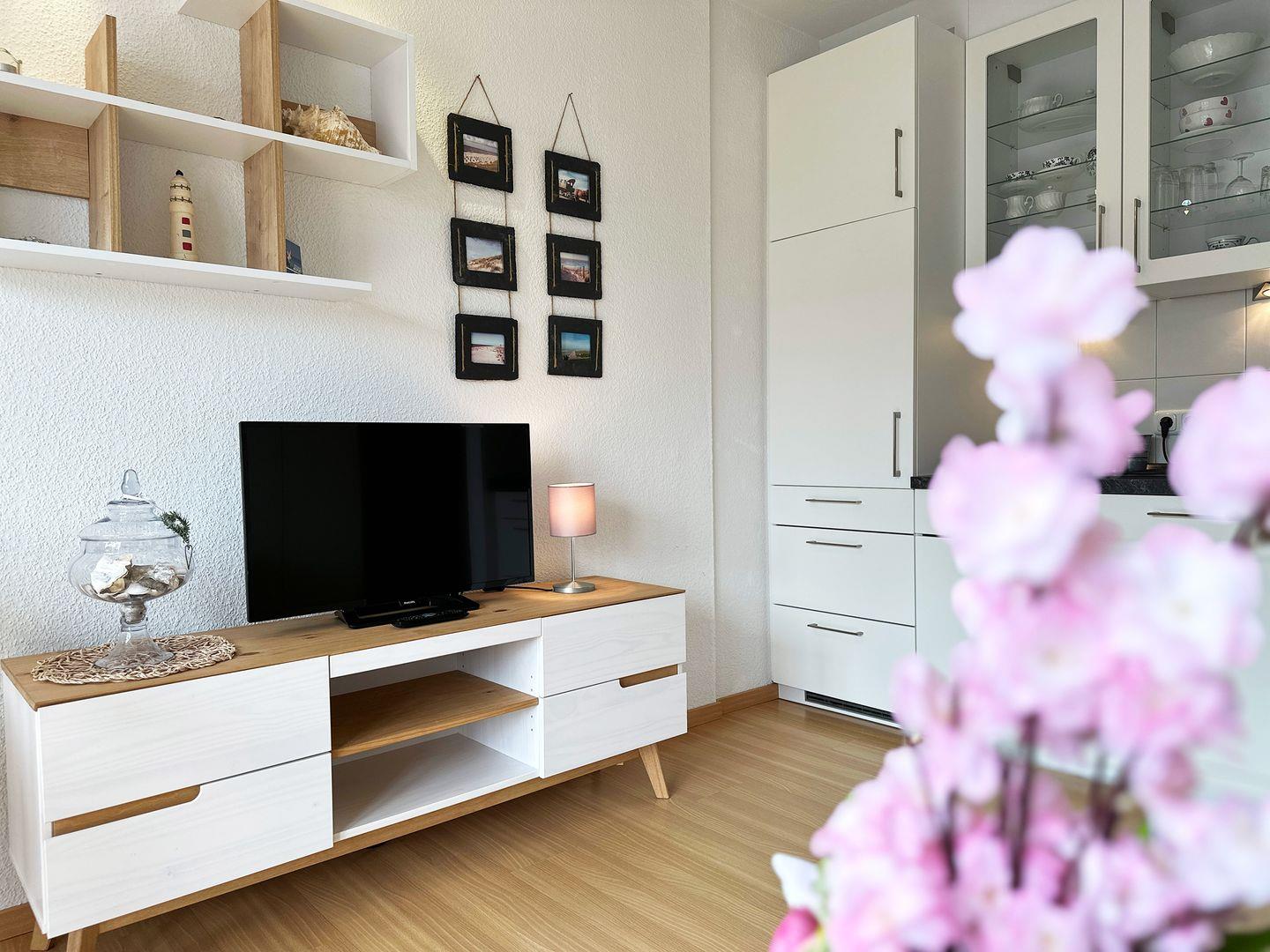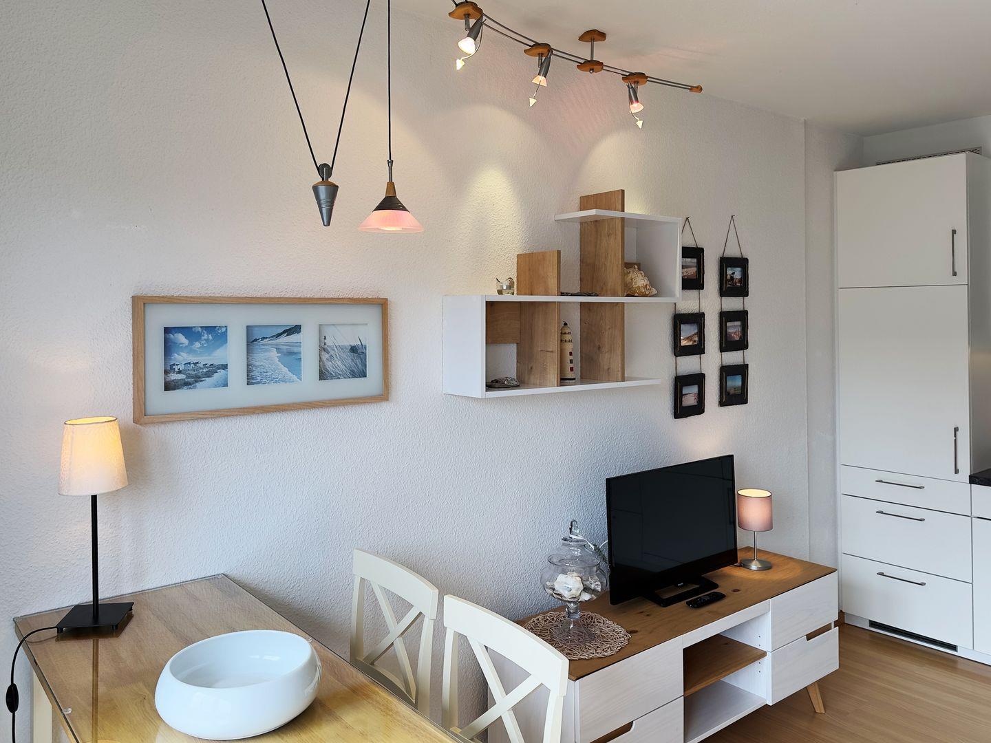 Die Wohnung verfügt über 1 Wohnraum mit WLAN, Sat-TV und offener Küche, 1 Schlafzimmer, 1 Badezimmer mit Dusche und WC; eine Süd-Terrasse mit 2 Stühlen und 1 Tisch (April bis Oktober) und eingeschränktem Meerblick.