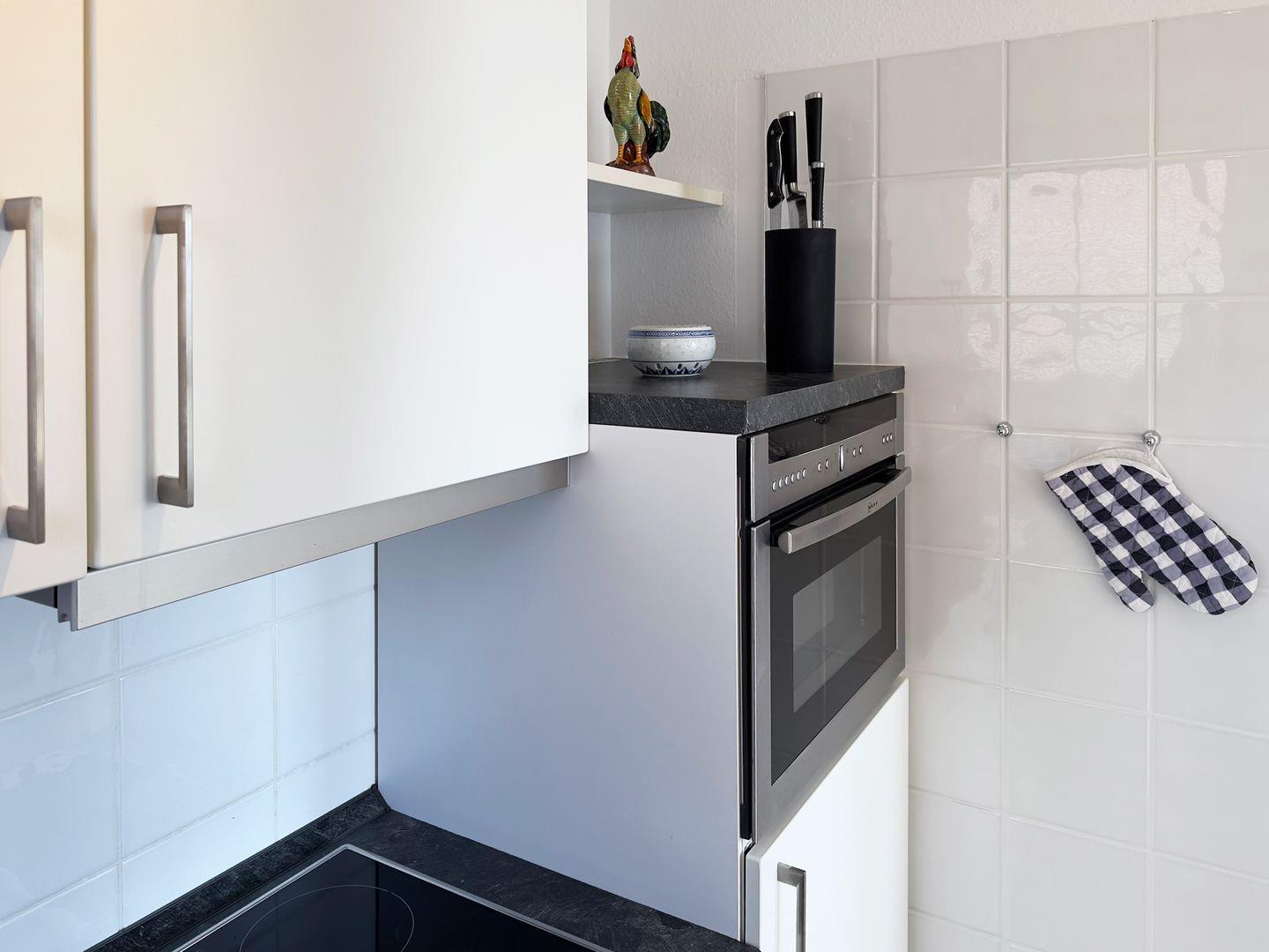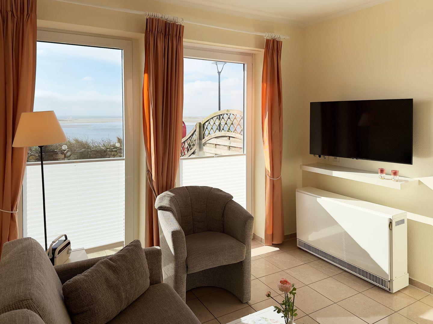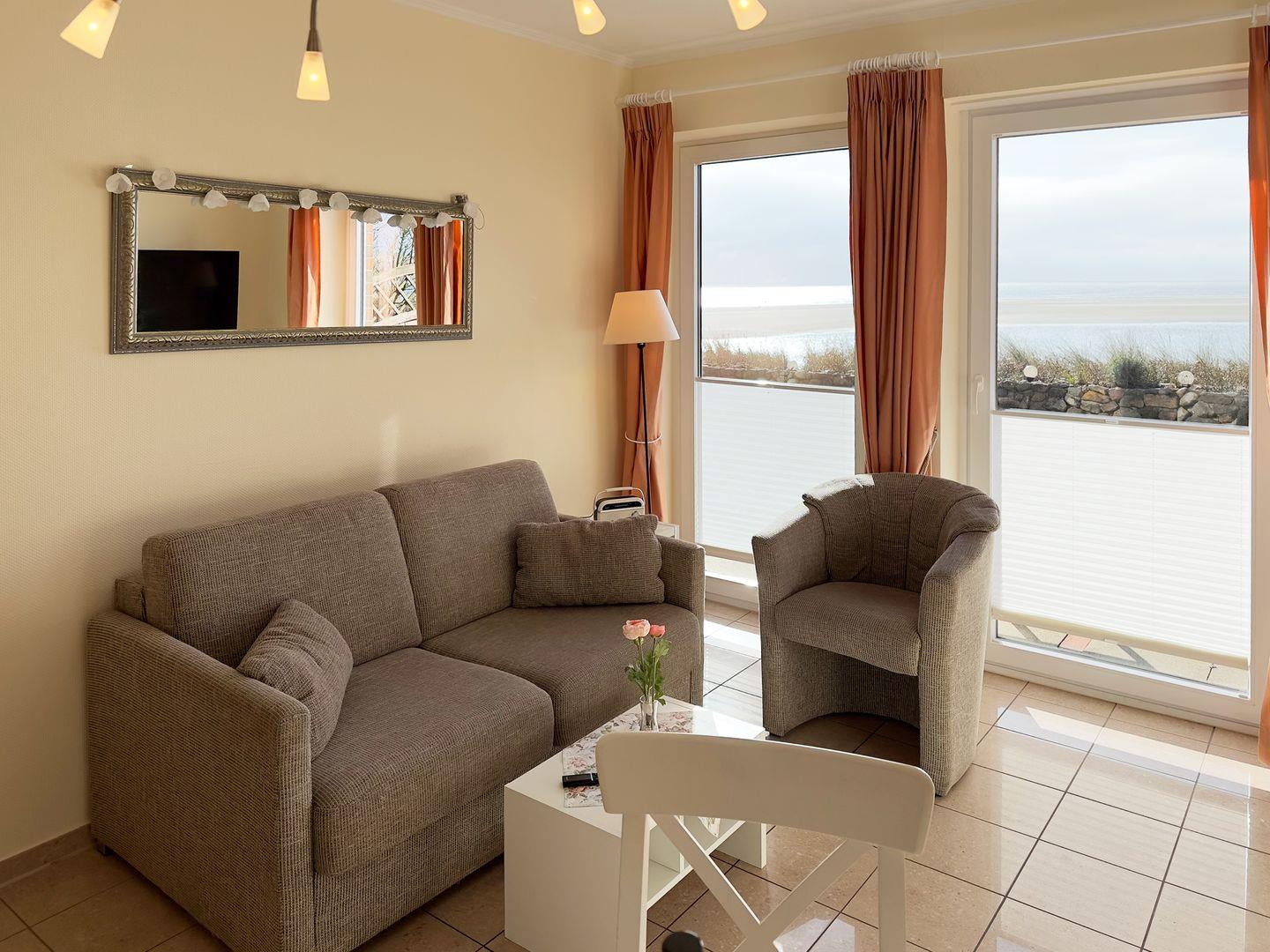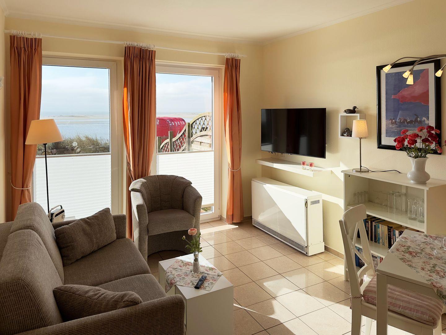 Die Wohnung verfügt über 1 Wohnraum mit WLAN, Sat-TV und offener Küche, 1 Schlafzimmer, 1 Badezimmer mit Dusche und WC; eine Süd-Terrasse mit Gartenmöbeln (April bis Oktober) und Meerblick, PKW-Stellplatz.
