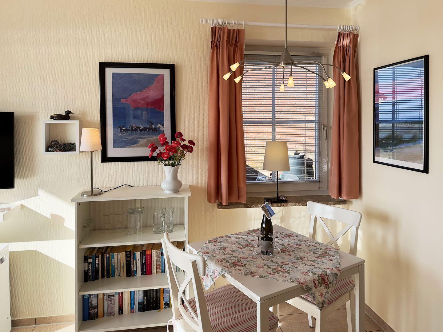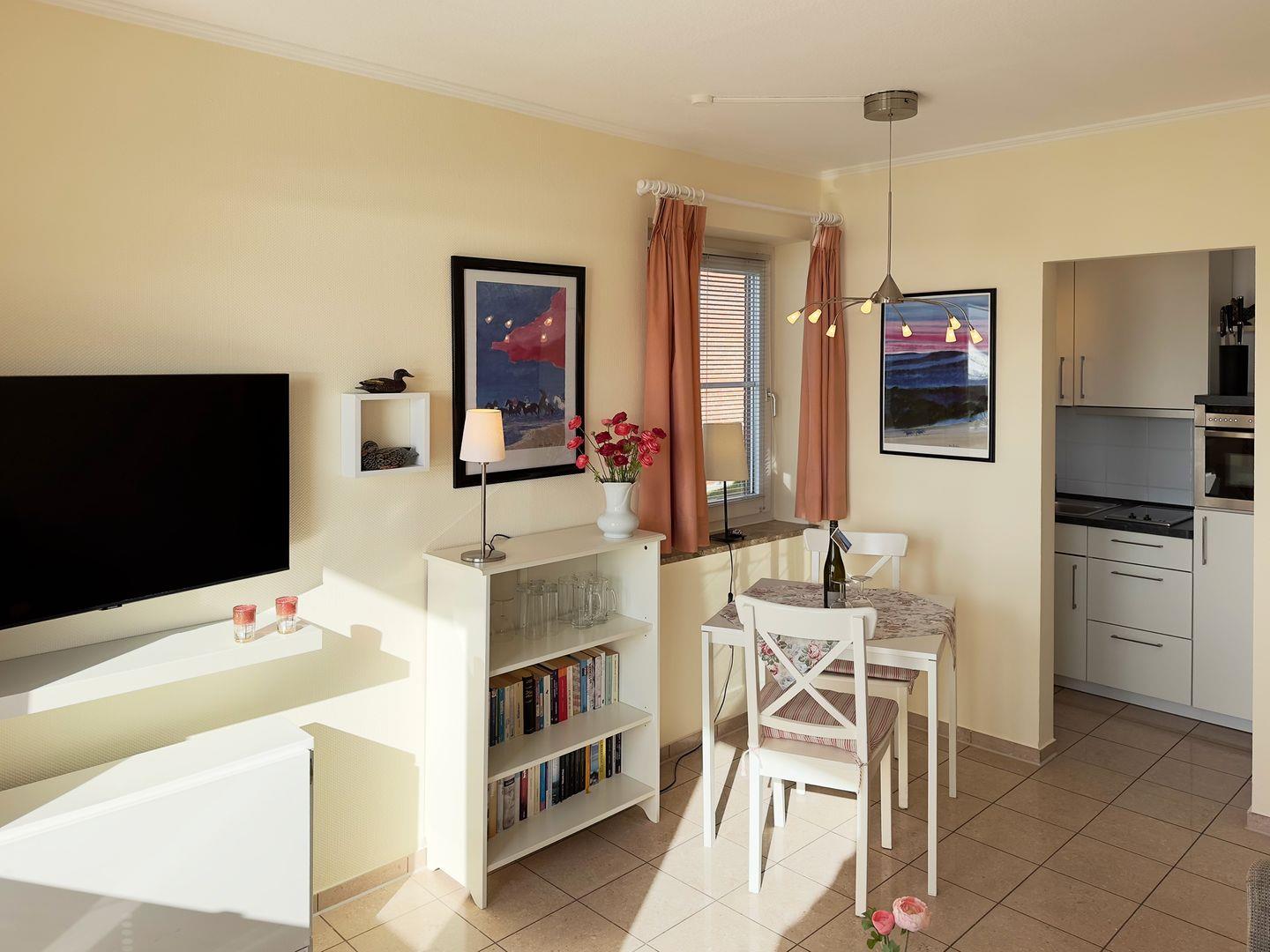 Die Ferienwohnung „Südspitze 34/24" im Erdgeschoss des Hauses in Wittdün auf Amrum ist eine 2-Zimmer-Ferienwohnung (ca. 32 qm Grundfläche) mit Schlafmöglichkeiten für 1 bis 2 Personen.