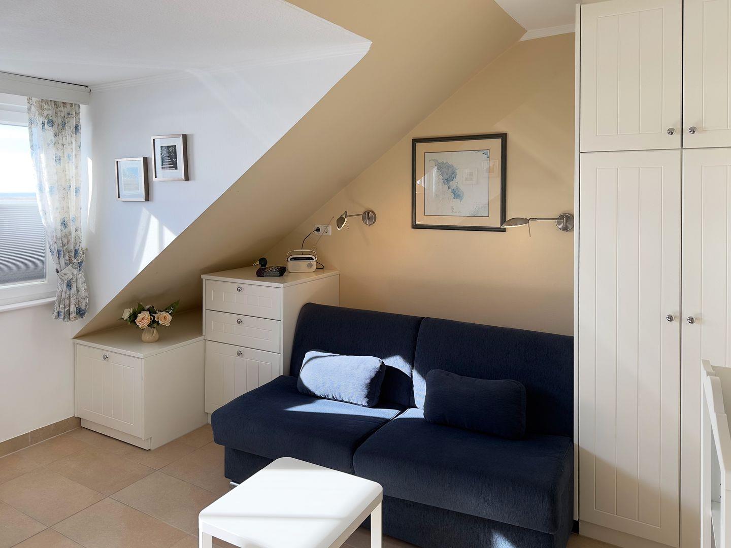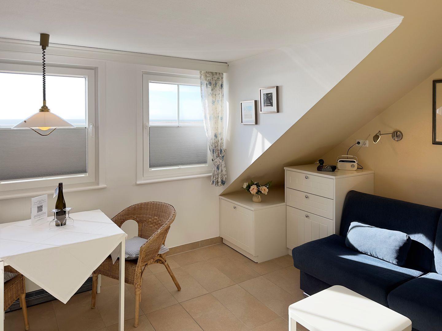 Die Ferienwohnung „Südspitze 34/26" im 1. Obergeschoss des Hauses in Wittdün auf Amrum ist eine 1-Zimmer-Ferienwohnung (ca. 23 qm Grundfläche) mit Schlafmöglichkeiten für 1 bis 2 Personen.