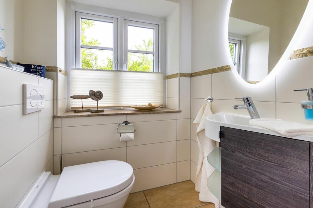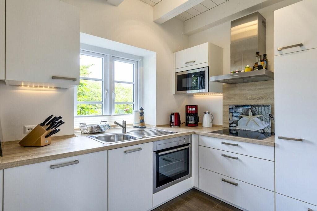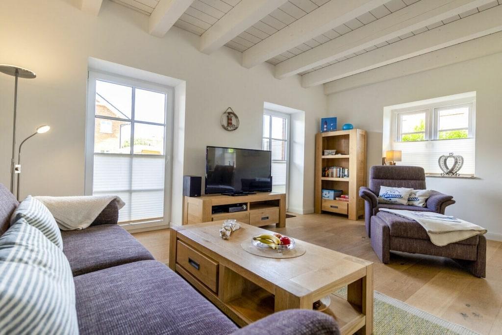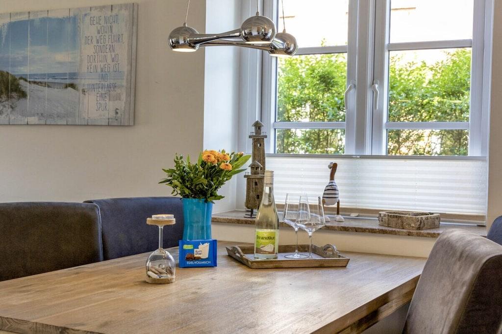Vores ferielejlighed "Kniepsand" er den yderste lejlighed til venstre i bygningen "Wind & Wellen". Lejligheden har et soveværelse med boxmadras, TV og adgang til balkonen. Det andet soveværelse er møbleret med to enkeltsenge. Der er et badeværelse med bruser og badekar. Et ekstra gæstetoilet er placeret i stueetagen. Køkkenet er fuldt udstyret med alt, hvad du behøver til din ferie: ovn, mikrobølgeovn, opvaskemaskine, køleskab med frostboks, SodaStream osv. Stuen har en hyggelig brændeovn, et stort LCD-TV, Blu-ray DVD-afspiller og Sony hi-fi-system. Gratis Wi-Fi og adgang til terrasse med havemøbler, strandstol og liggestol er også tilgængelig. Hunde er velkomne. Til vores yngre gæster er der en legeplads samt trampolin, basketballkurv og gokarts.