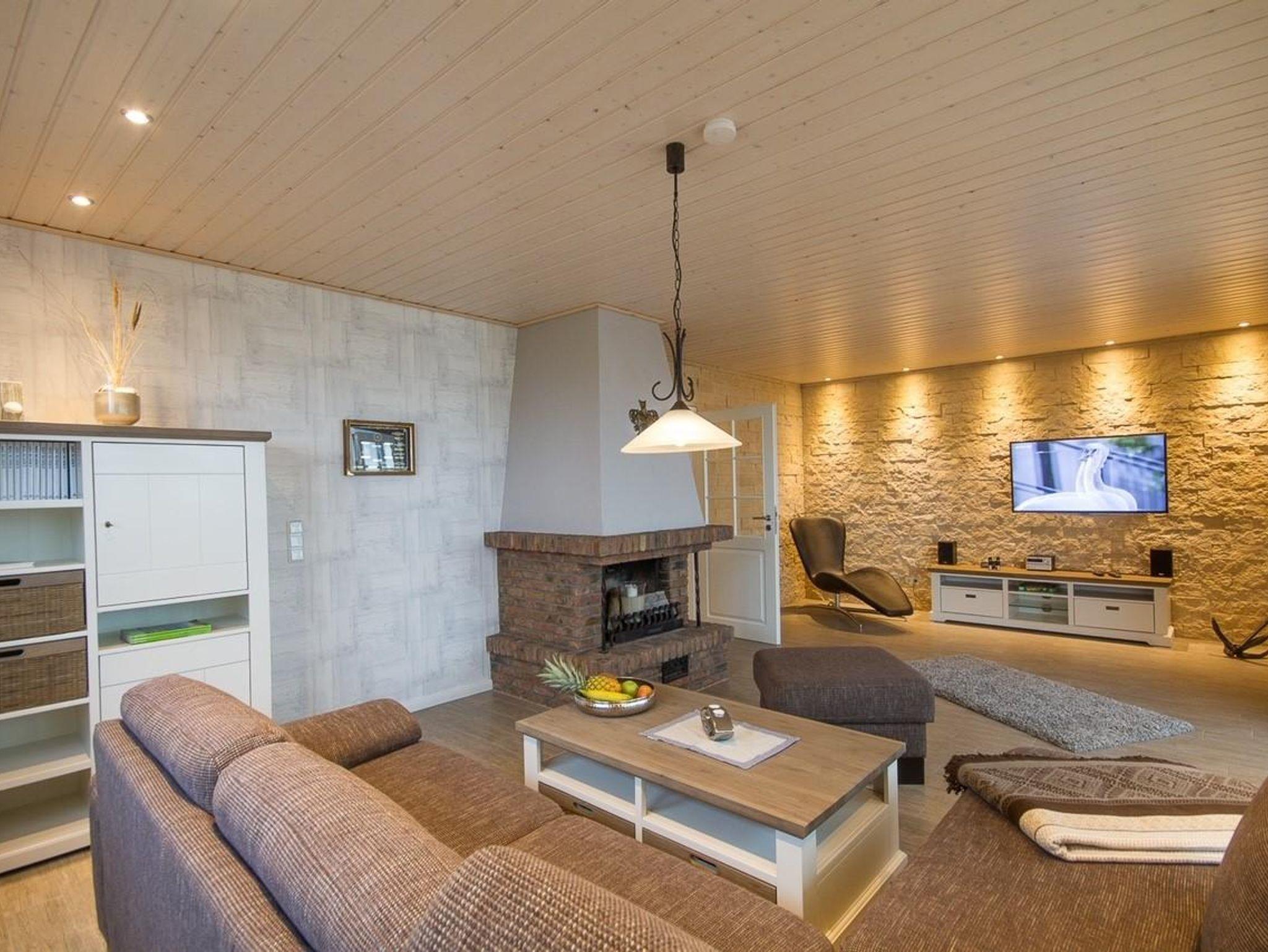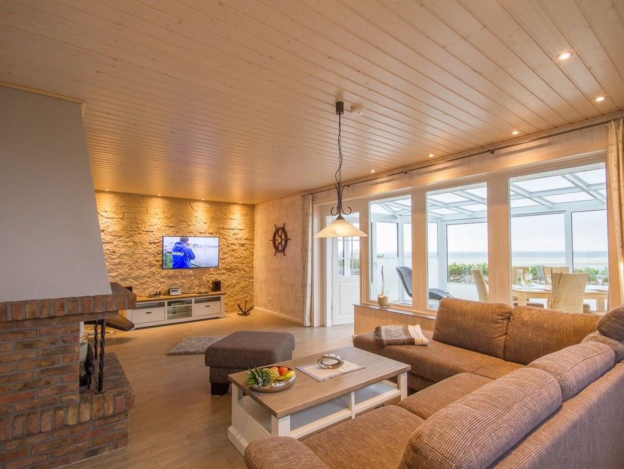 • großes, maritim eingerichtetes Wohnzimmer mit Flachbild TV, Kamin (nur zur Optik) und kleiner HIFI – Anlage mit Fernbedienung gefliester Wintergarten mit Fußbodenheizung