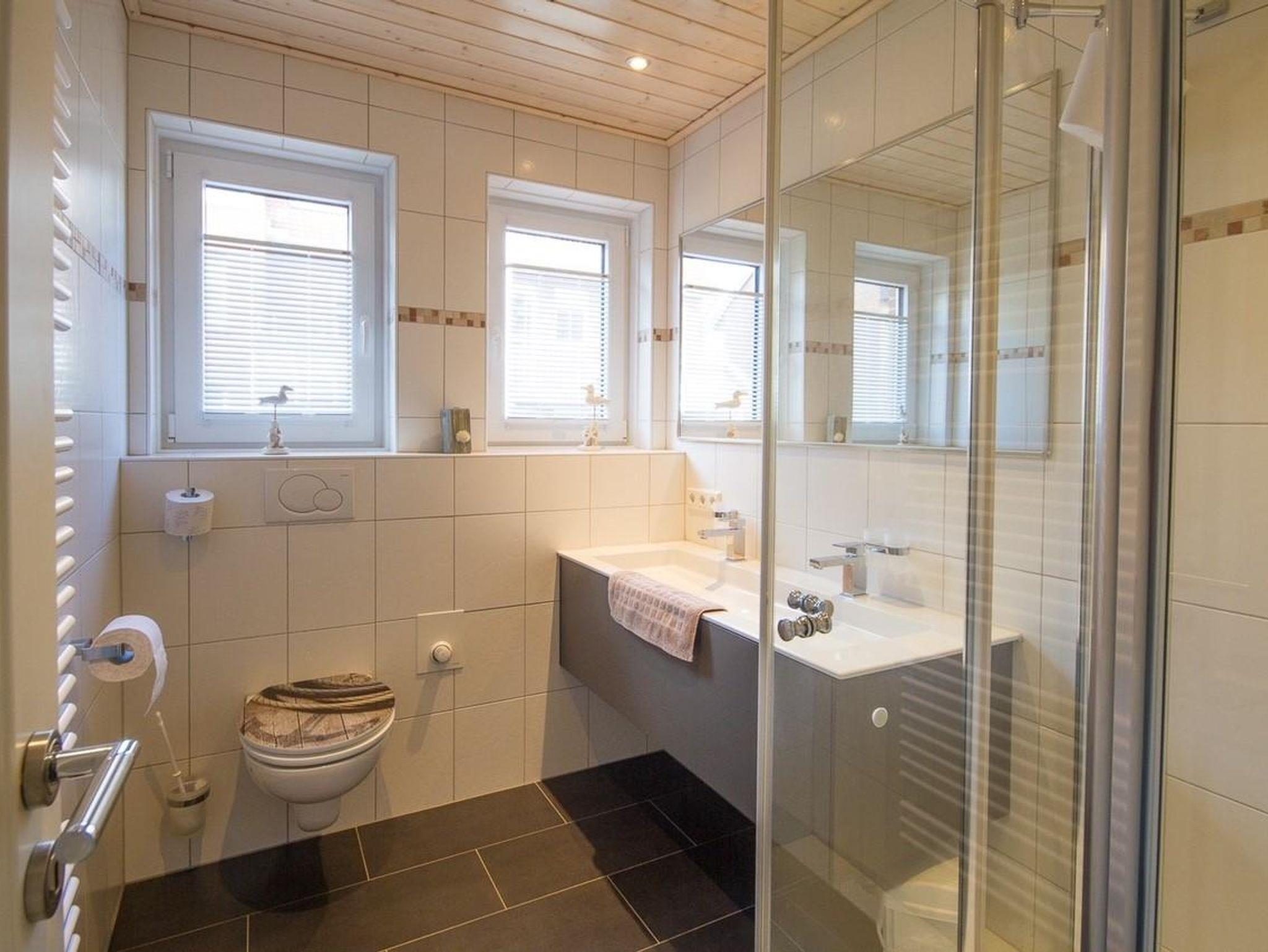 • modernes WC / Duschbad mit ebenerdigen Einstieg, Fußbodenheizung und Haartrockner