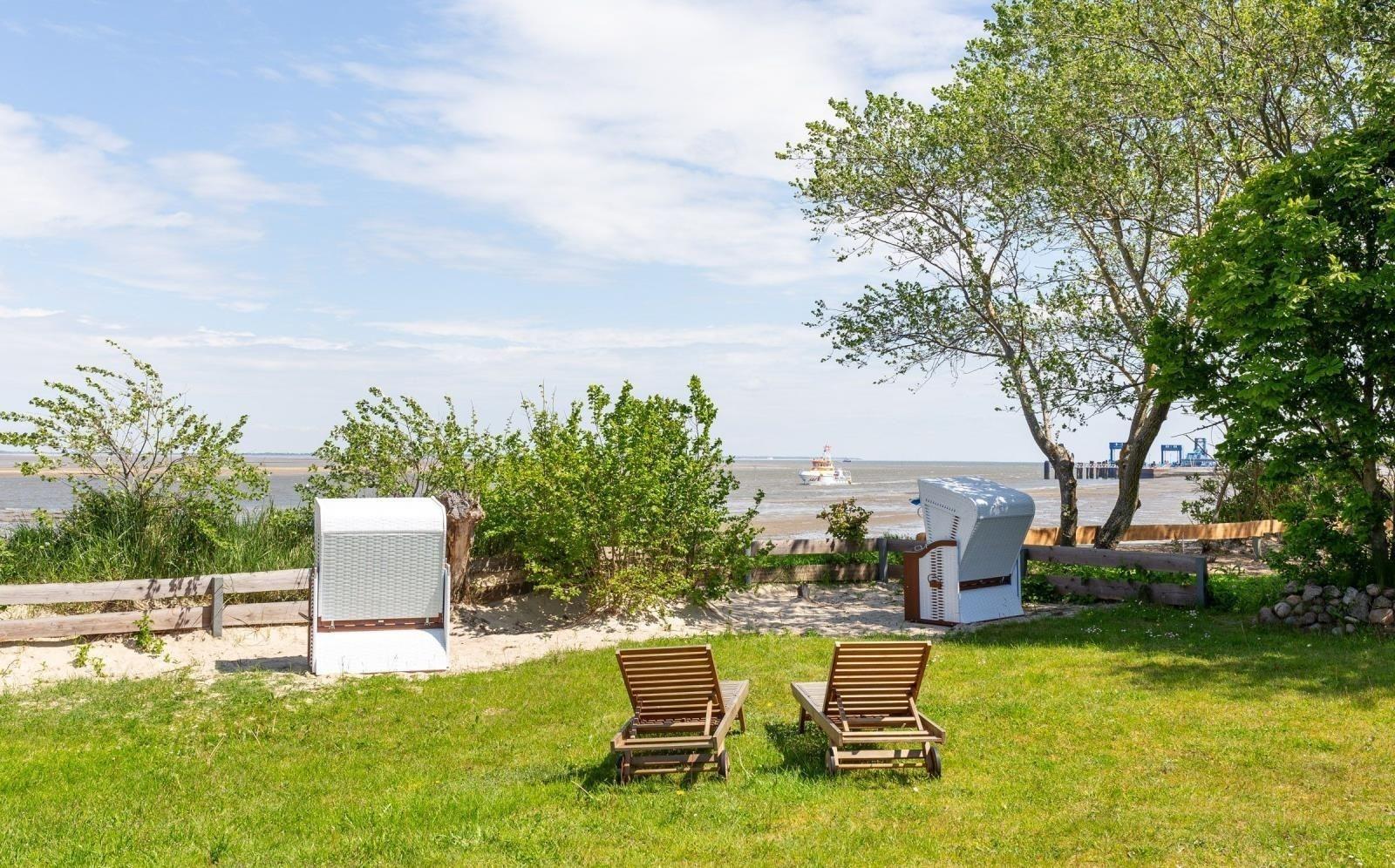Bei Sonnenschein (natürlich auch bei Regen) kann man traumhaften Blick auf das Wattenmeer sowie den zum Haus gehörigen gepflegten Garten genießen .