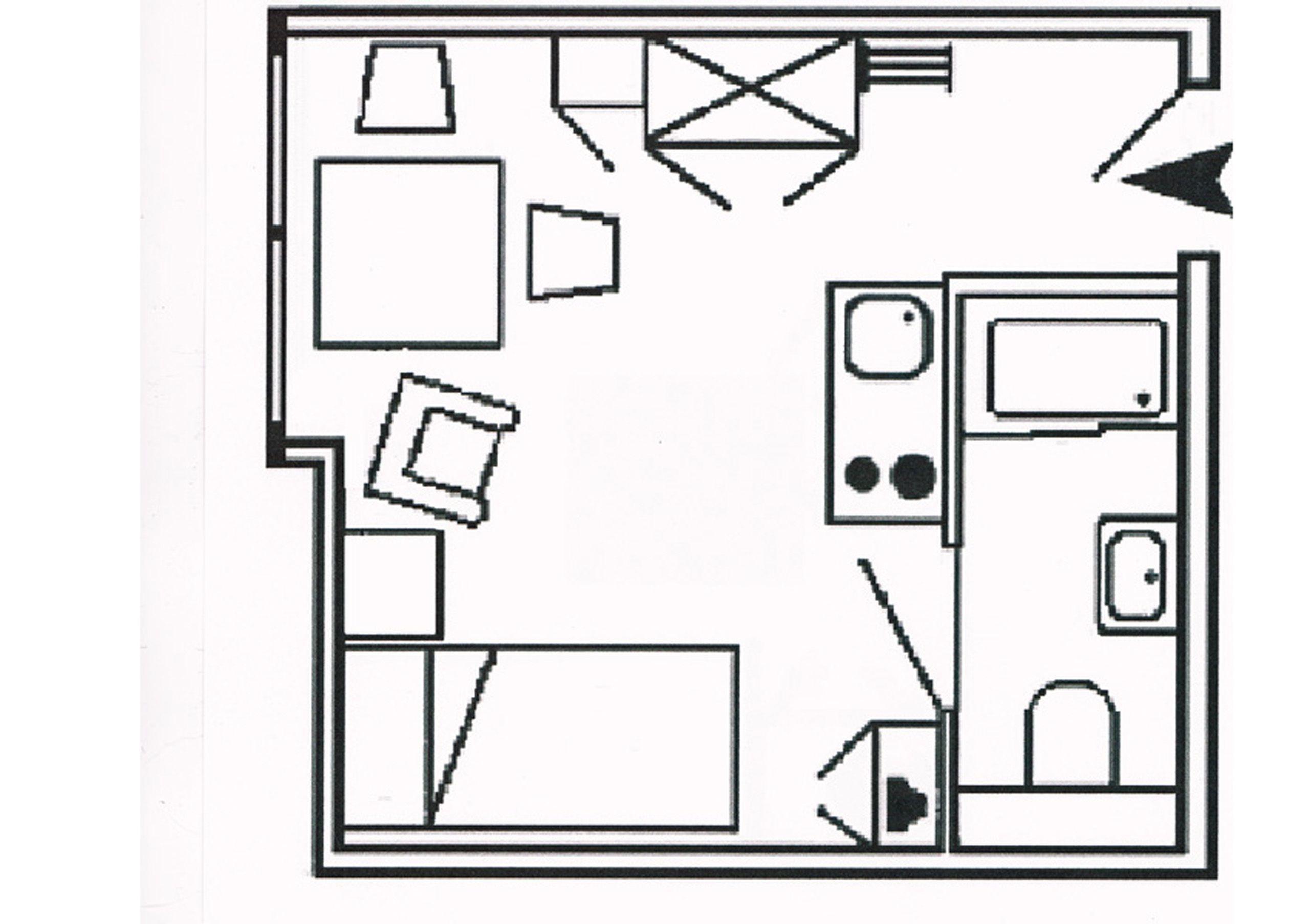 Unsere 18 m² große Ein-Zimmer-Ferienwohnung liegt im Obergeschoss und ist in hellen und freundlichen Farbtönen gehalten. Sie bietet für eine Person genügend Platz. Im Wohn-/Schlafraum befindet sich ein Einzelbett, ein Fernseher, ein Sessel, Essplatz und eine Küchelzeile, die mit 2- Platten-Herd, Kühlschrank mit 4Sterne Fach und verschiedenen Kochutensilien ausgestattet ist. Ihr Appartement verfügt über Duschbad/WC und einen Haartrockner.