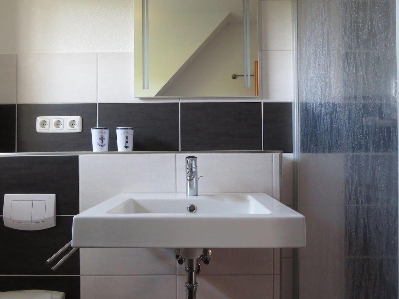 Bad mit Dusche /Duschtrennwand, WC, Waschbecken, Fön, Badezimmerschrank