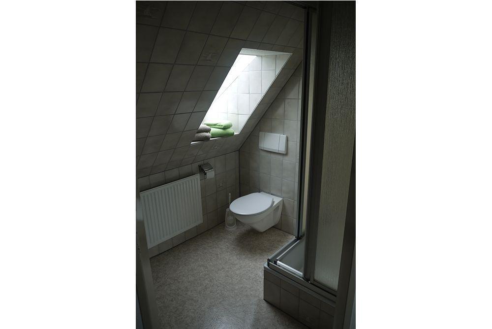 Das Badezimmer bietet eine praktische Duschbad-Lösung und sorgt für einen hohen Komfort. Die gesamte Gestaltung der Räume schafft eine harmonische Atmosphäre, in der sich Gäste sofort wohlfühlen.