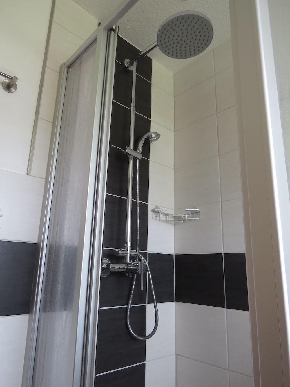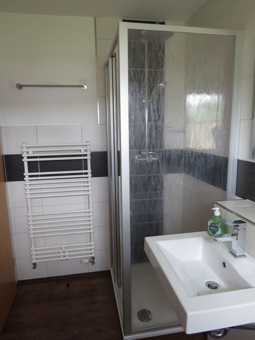 Die Nasszelle Dusche mit Duschtrennwand, WC, Waschbecken, Fön, Badezimmerschrank. Hand- und Duschtücher sind in der Kommode verstaut. Für den Landgang sind eigene mitzubringen.