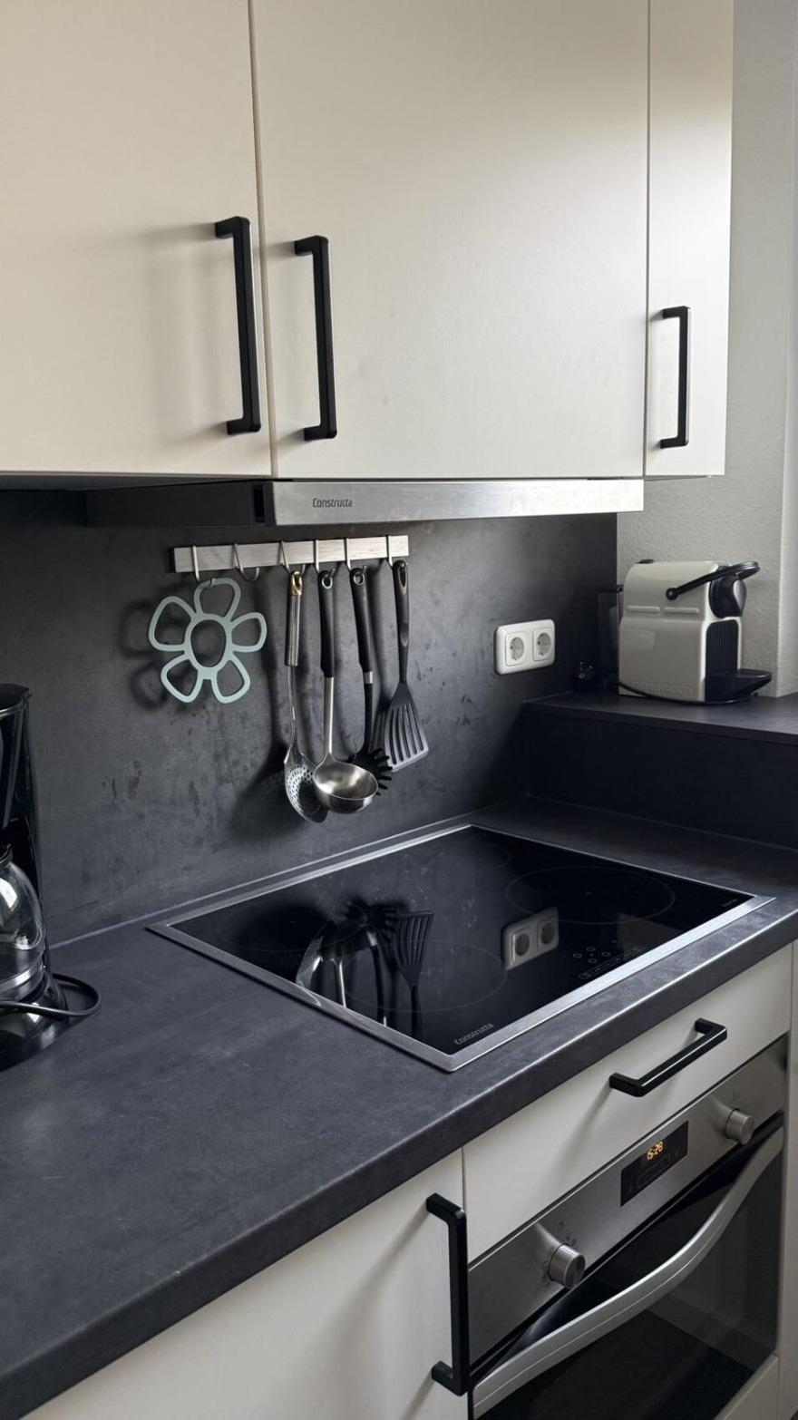 Komplett eingerichtete Küche (Geschirr, Gläser, Topfe...) 4-Platten Kochfeld, Backofen, Kühlschrank, Espresso-Maschine, Toaster, Kaffeemaschine, Mixer