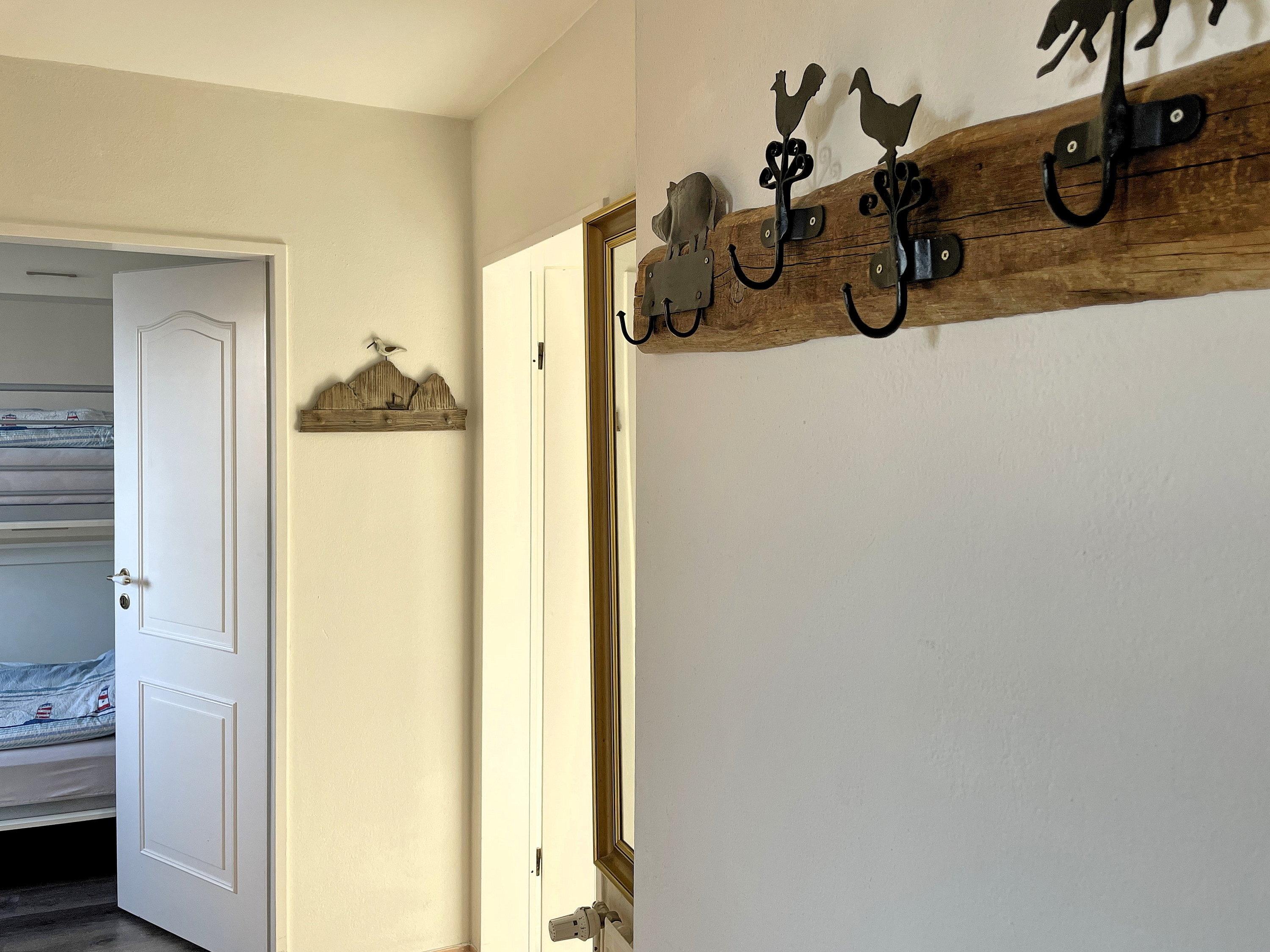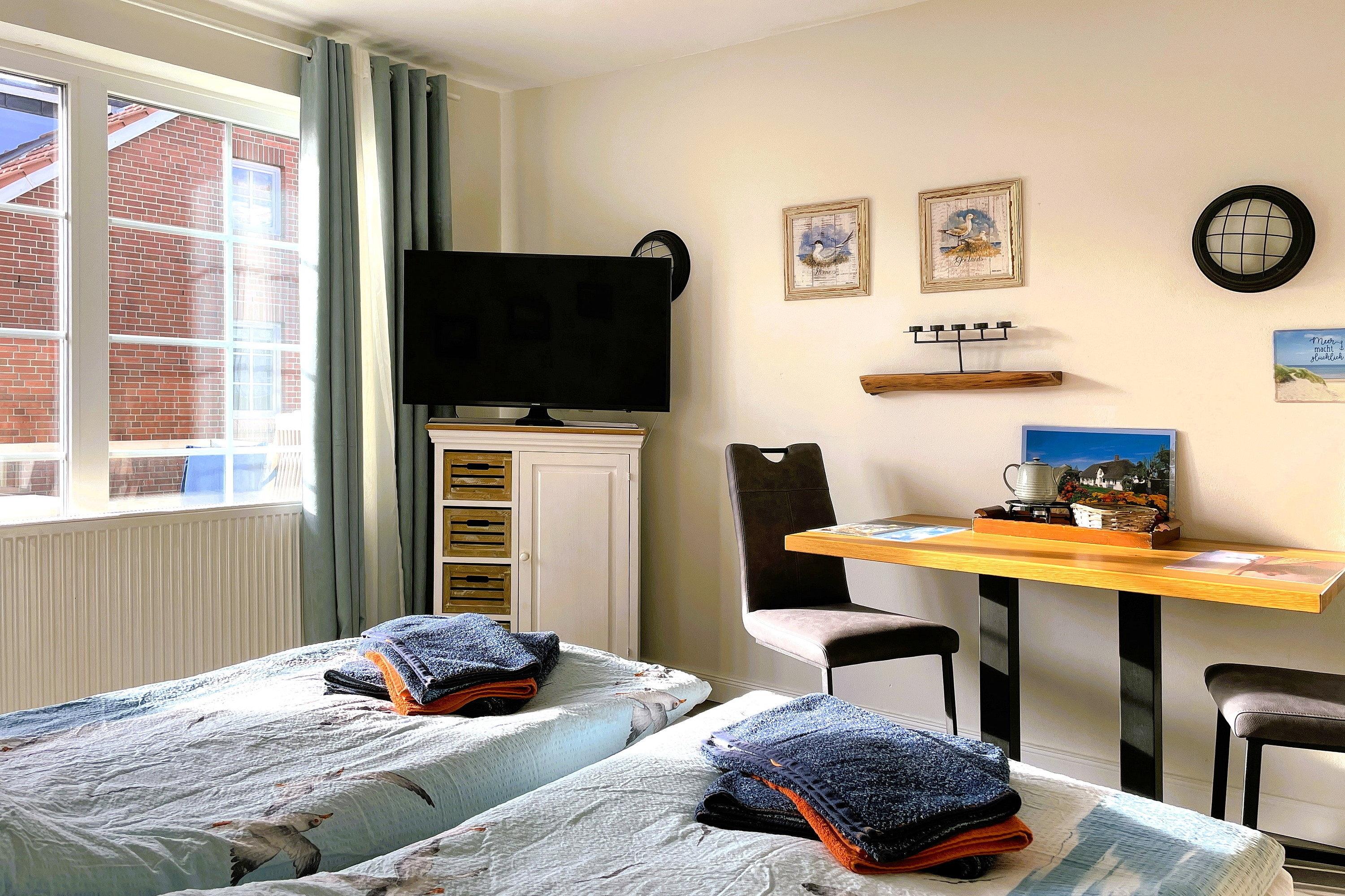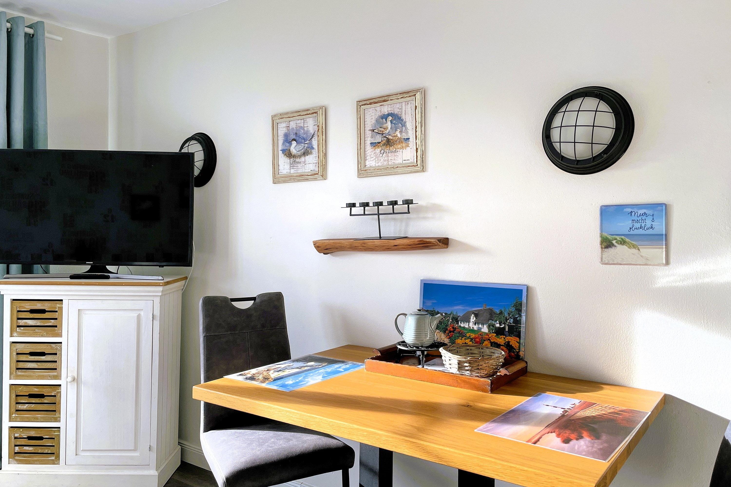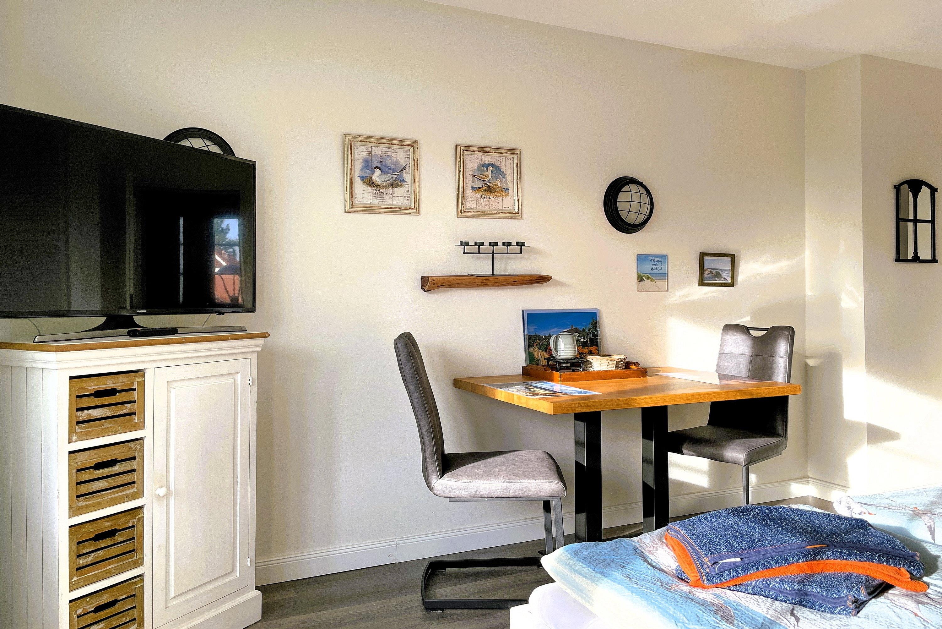 Willkommen in der charmanten Ferienwohnung Huus Waterkant 04. Diese kompakte, aber durchdachte Wohnung bietet alles, was Sie für einen erholsamen Aufenthalt benötigen. Das Herzstück der Wohnung ist das kombinierte Wohn- und Schlafzimmer. Hier finden Sie ein komfortables Doppelbett für zwei Personen, einen geräumigen Schrank für Ihre Kleidung sowie eine praktische Küchenzeile. Ein Esstisch mit Stühlen lädt zum gemeinsamen Essen oder gemütlichen Beisammensein ein. Für zusätzliche Schlafmöglichkeiten sorgt ein separates Schlafzimmer mit einem Etagenbett, das auch für Erwachsene geeignet ist - ideal für Familien oder kleine Gruppen. Das helle Badezimmer, ausgestattet mit Dusche und WC, grenzt an den Eingangsbereich und verfügt über ein Fenster für natürliche Belüftung. Ein besonderes Highlight der Wohnung ist der Balkon, der vom Wohn-/Schlafzimmer aus zugänglich ist. Hier können Sie auf den bereitgestellten Sitzgelegenheiten entspannen und Relaxen. Die Südwest-Ausrichtung verspricht sonnige Stunden und schöne Abende.
