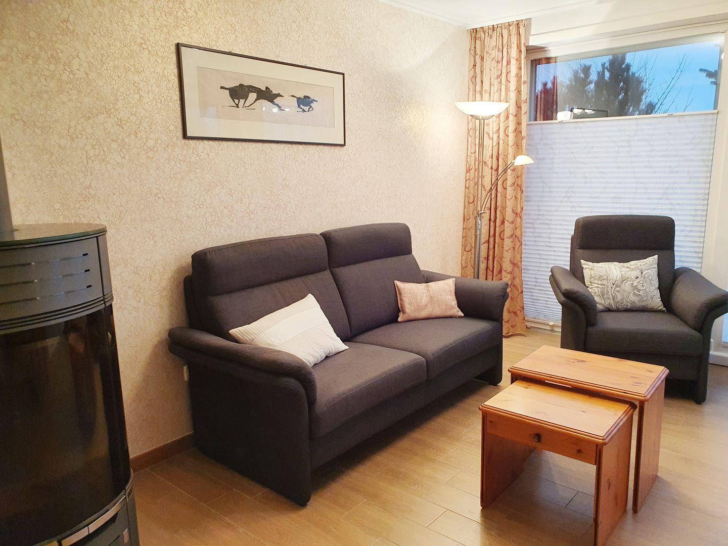 Die Wohnung verfügt über 1 Wohnraum mit WLAN und Sat-TV und offener Küche, 1 Schlafzimmer, 1 Badezimmer mit Dusche und WC, Waschmaschine und Trockner zur Gemeinschaftsnutzung mit einer weiteren Wohneinheit, teilüberdachte Süd-Terrasse mit Gartenmöbeln, Strandkorb (April bis Oktober) und Blick über den Kniepsand auf die Nordsee; windgeschützter Nordbalkon mit Gartenmöbeln (April bis Oktober) und Abendsonne im Sommer; PKW-Stellplatz am Haus. Umweltfreundliche Erdwärmeheizung.