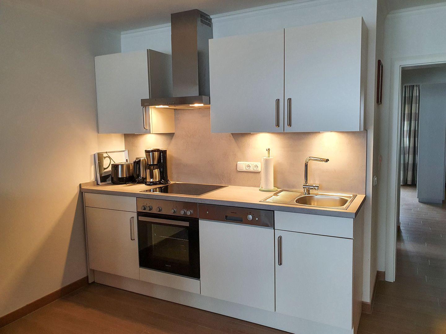 Die Wohnung verfügt über ein großes Schlafzimmer, das mit einem bequemen Echtholz-Bett mit hochwertigen Matratzen ausgestattet ist und durch große Fenster viel Tageslicht erhält. Der offene Wohnbereich mit großen Panoramafenstern zum weltberühmten Amrumer Kniep ist der ideale Ort zum Entspannen, ausgestattet mit einem komfortablen Sofa und einem gemütlichen Sessel, einem Essbereich sowie einem modernen Fernseher mit Satellitenanschluss. Die offene in den Wohnraum integrierte Küche lässt keine Wünsche offen – vom Ceranherd über den Backofen bis hin zu Geschirrspüler und Kühlschrank finden Sie hier alles, was Sie brauchen, um schmackhafte Mahlzeiten zuzubereiten. Eine hervorragende Ausstattung mit Geschirr, Gläsern und Kochutensilien ist selbstverständlich vorhanden. Auch eine Senseo-Maschine steht für die Zubereitung von Kaffeespezialitäten bereit.