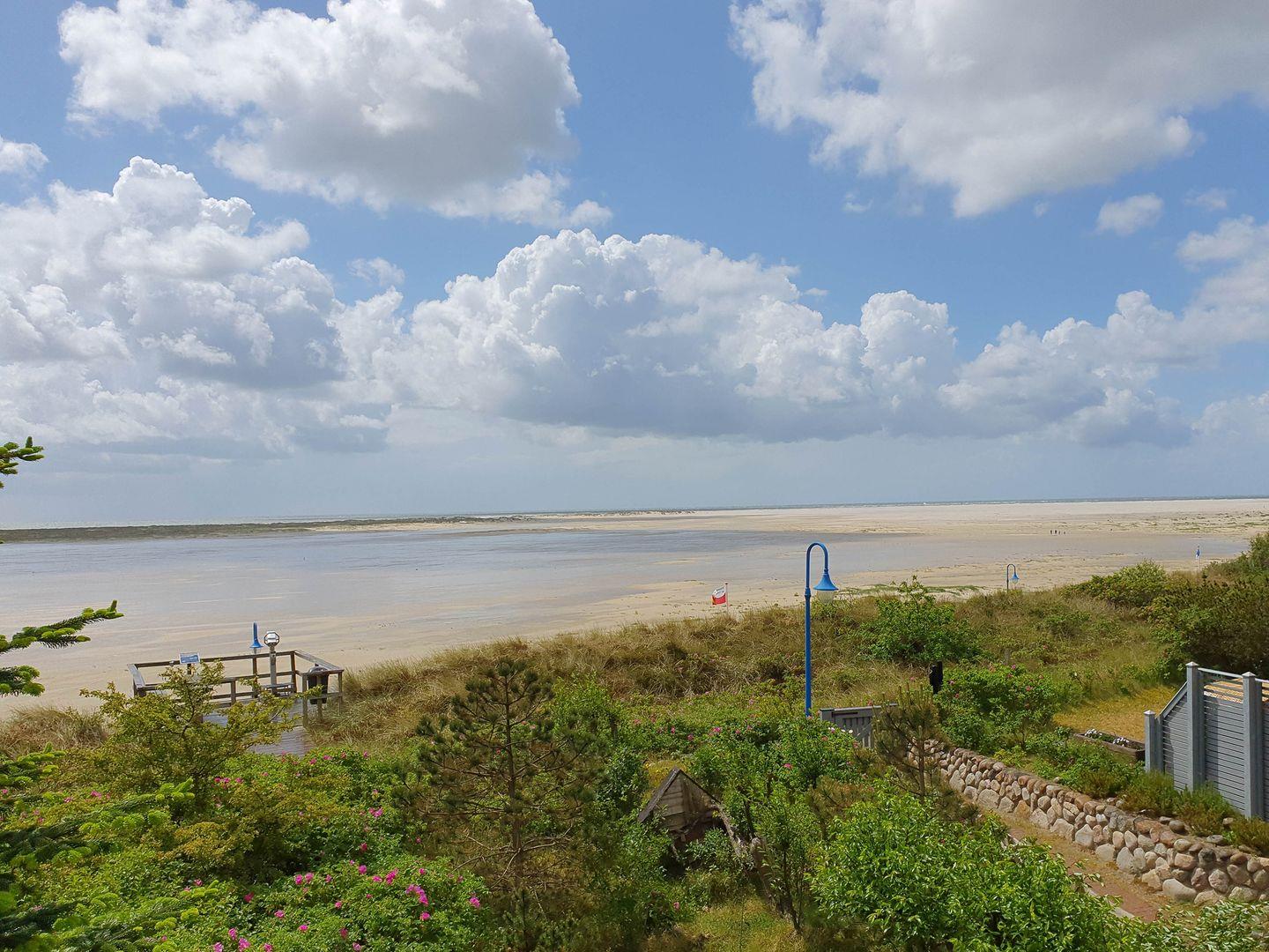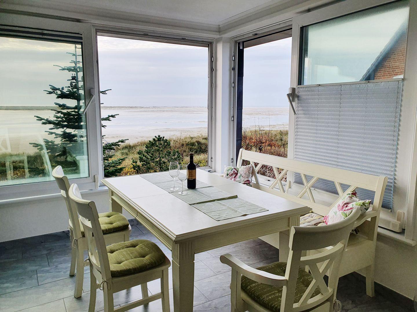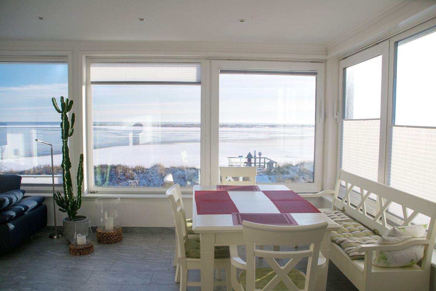 Die Wohnung verfügt WLAN, 1 Wohnraum mit Sat-TV, Kaminofen, Leder-Eckcouch, Essbereich mit Tisch, 4 Stühlen und 1 Bank, Panorama-Fensterfront mit Schiebeelementen im Stile eines Wintergartens; 1 Küche, 3 Schlafzimmer, Sauna, 2 Badezimmer mit Dusche und WC, Waschmaschine und Trockner zur Gemeinschaftsnutzung mit einer weiteren Wohneinheit, Sitzplatz im Garten mit Strandkorb und Blick über den Kniepsand auf die Nordsee; PKW-Stellplatz im Carport am Haus. Umweltfreundliche Erdwärmeheizung.