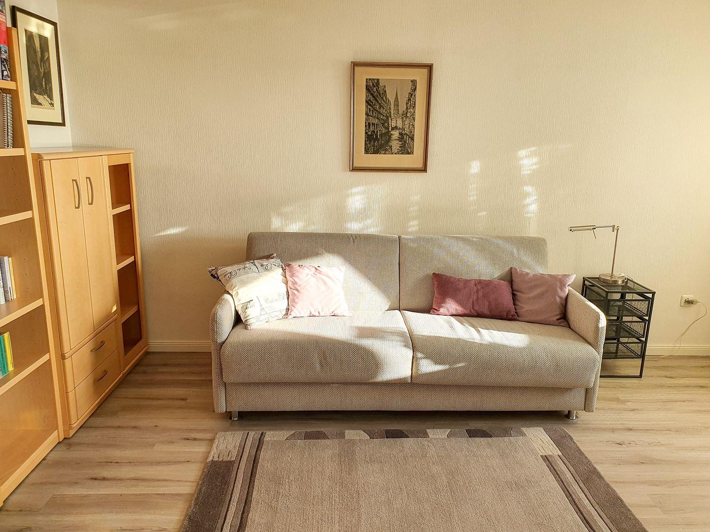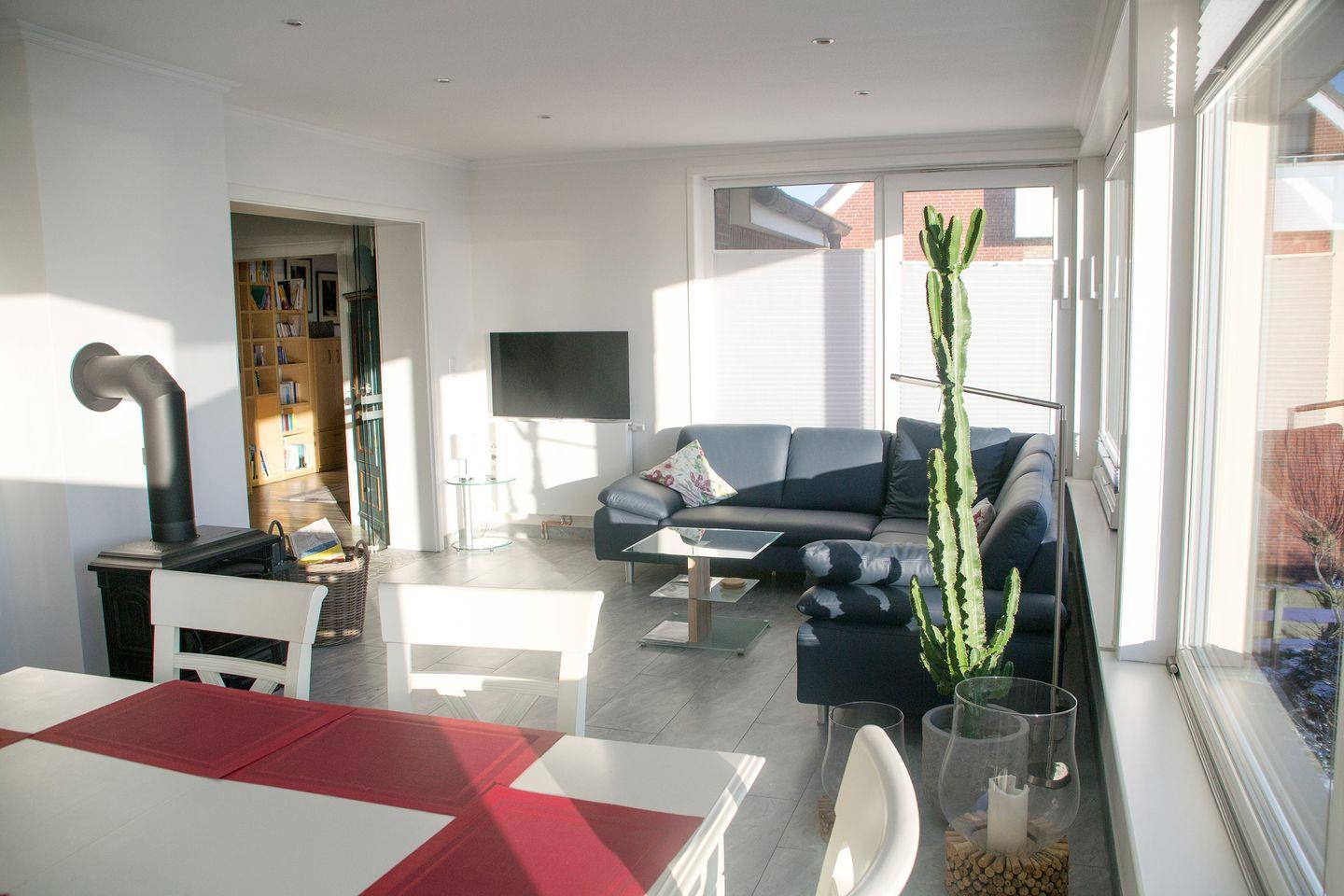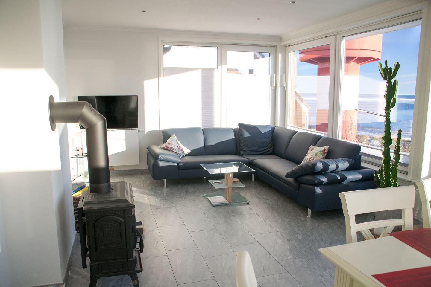 Die Wohnung verfügt über drei gemütliche Schlafzimmer mit hochwertigen Vinylböden und zwei moderne Badezimmer mit Regenduschen, Tageslicht und Fußbodenerwärmung. Eine private großzügige Sauna lädt nach einem erlebnisreichen Tag ein, den Körper und Geist zu entspannen. Die offene und helle Gestaltung des Wohnzimmers mit Fliesenboden lädt zu geselligen Abenden ein. Hier können Sie auf der Ledersofaecke entspannen, während der Kaminofen eine wohlige Atmosphäre schafft. Internet über W-Lan, Fernseher, Radio, Blue-Ray- und CD-Player mit einer Filmauswahl sowie eine Wii-Spielekonsole mit reichlich Spielen sorgen dafür, dass auch die Unterhaltung nicht zu kurz kommt. Auch Bücherwürmer dürfen sich durch unsere kleine Bibliothek wühlen. Ein Arbeitsplatz mit Monitor, die stabile Internetverbindung und dabei immer der Blick über den Kniepsand schafft die Möglichkeit von Homeoffice im Inselparadies.