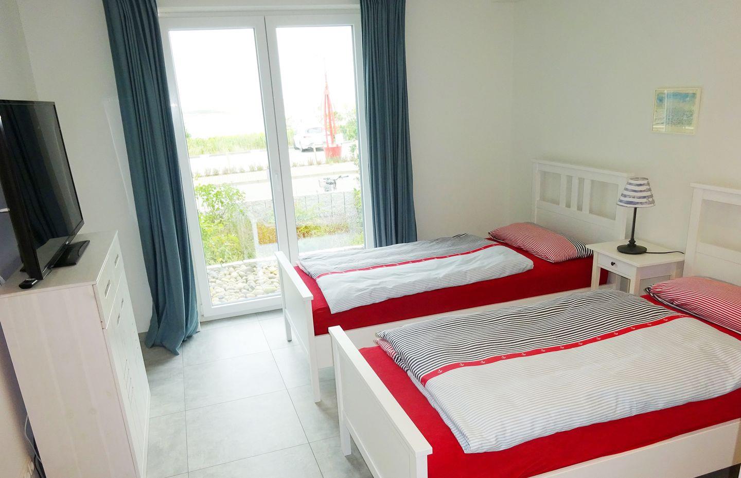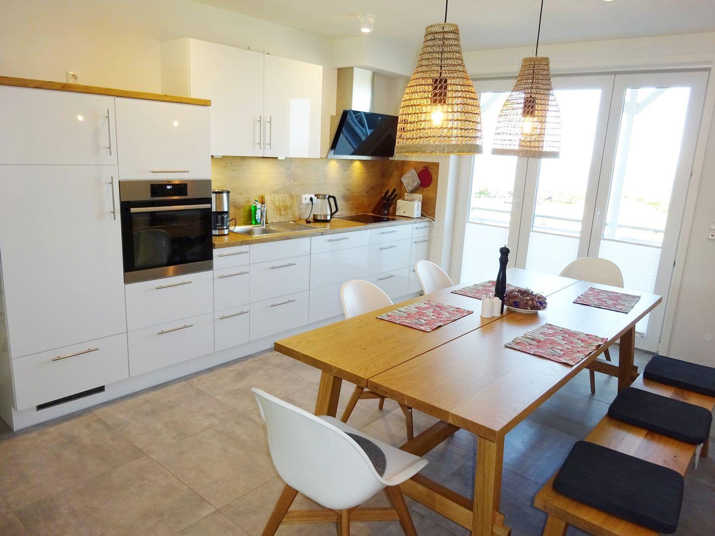 Die Wohnung verfügt über 1 Wohnraum mit WLAN, Sat-TV und offener Küche, 2 Schlafzimmer, 1 Badezimmer mit Dusche und WC, 1 Gäste-WC; 1 Süd-Balkon vom Wohnzimmer, 1 Nord-Balkon mit Meerblick vom Esszimmer, Balkonmöbel (April – Oktober). Im rechten Keller (1. Tür rechts) befinden sich eine Münz-Waschmaschine und ein Münz-Trockner zur Gemeinschaftsnutzung. Eigener PKW-Stellplatz in der Nähe des Hauses, Unterstellmöglichkeit für Fahrräder. Nur wenige Meter vom Meer entfernt.