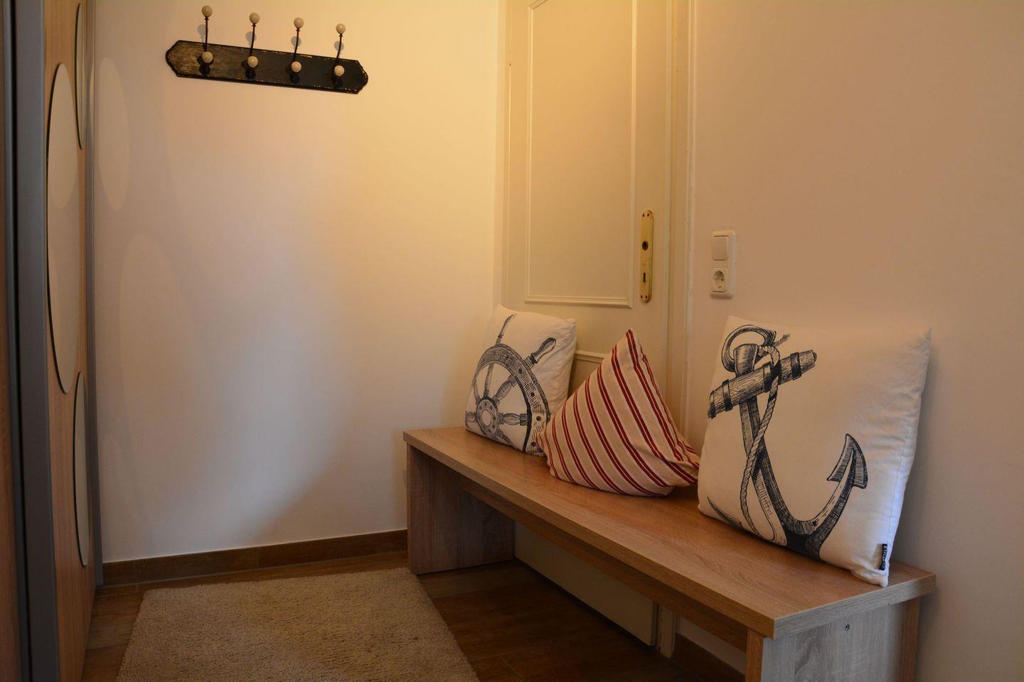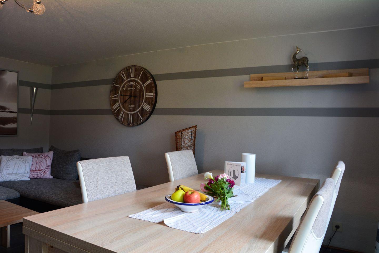 Das Schlafzimmer mit Doppelbett ist schön aufgeteilt und hat einen kleinen separaten Ankleidebereich. Vom Wohnzimmer aus gelangen sie direkt auf die kleine, schöne Terrasse mit Strandkorb, Gartenmöbeln und Grill. Für schlechte Tage finden Sie eine