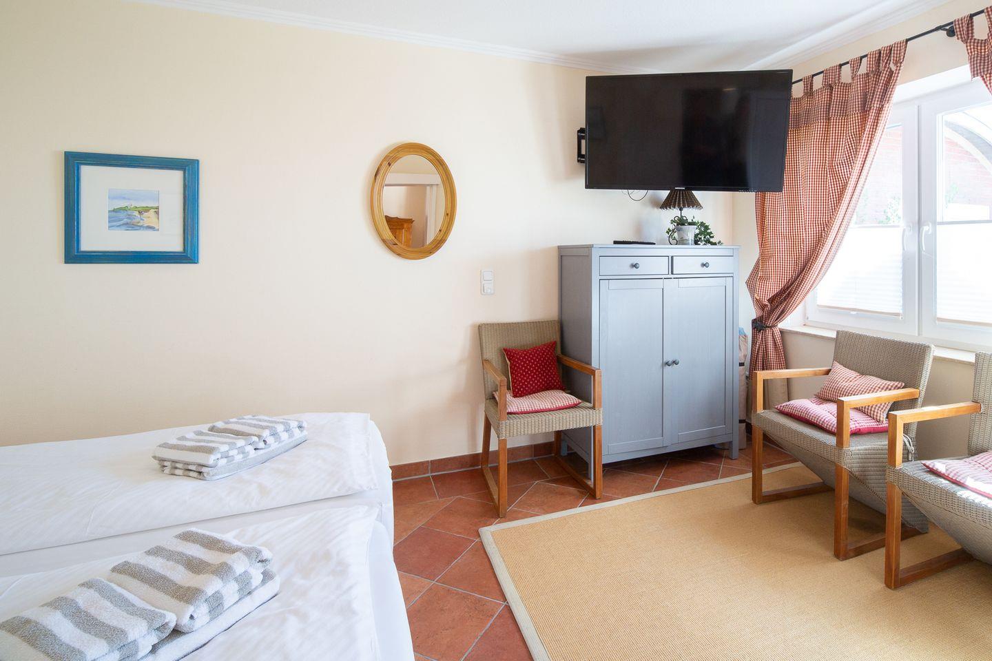 Die Wohnung verfügt über 1 Wohnraum und Sat-TV, 1 Küche, 2 Schlafzimmer, 1 Badezimmer mit Dusche und WC, Waschmaschine und Trockner zur Eigennutzung, Süd-Terrasse mit Gartenmöbeln, Strandkorb (April bis Oktober) und Blick über den Kniepsand auf die Nordsee; PKW-Stellplatz im Carport am Haus. Umweltfreundliche Erdwärmeheizung.