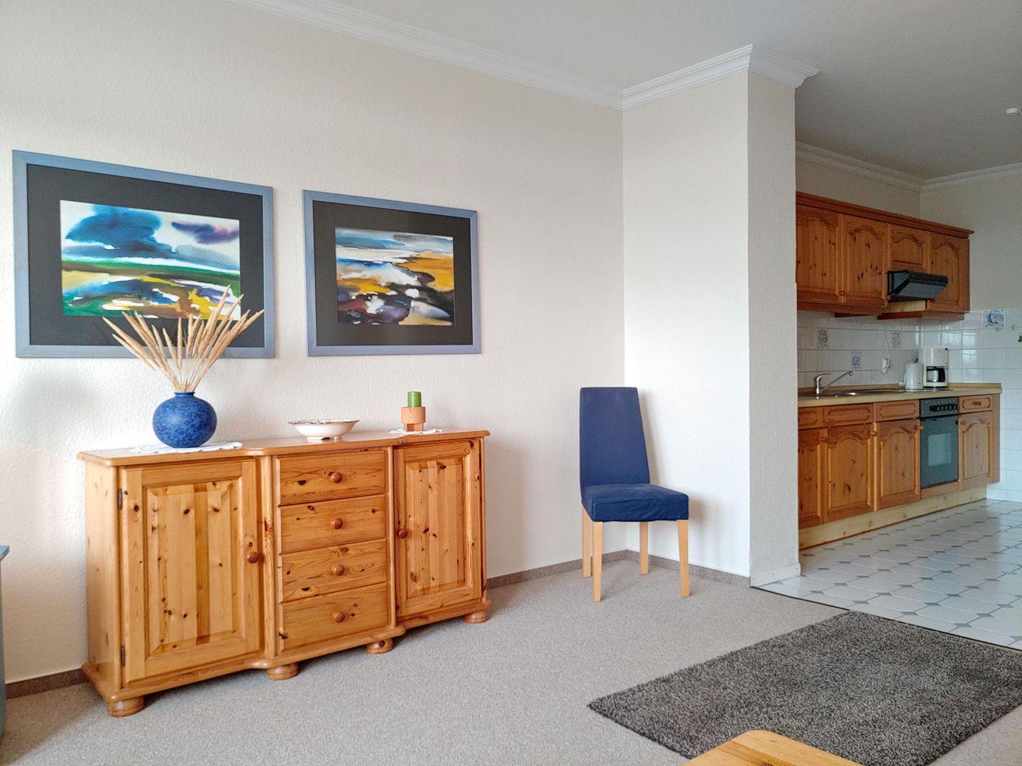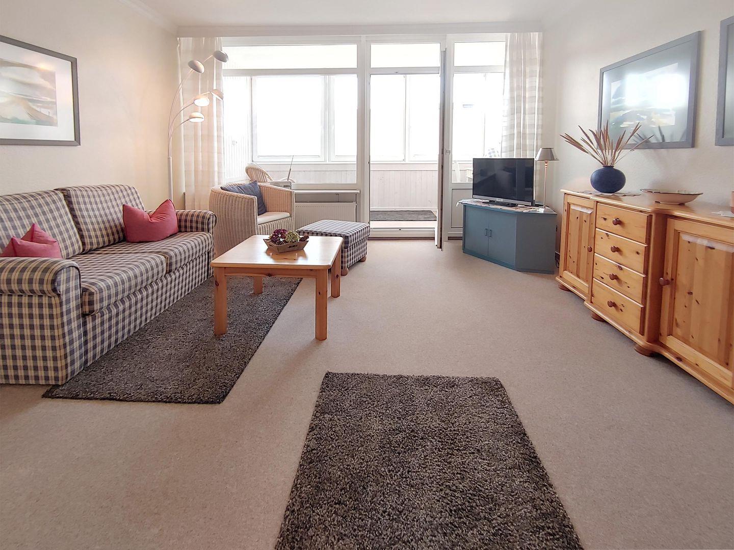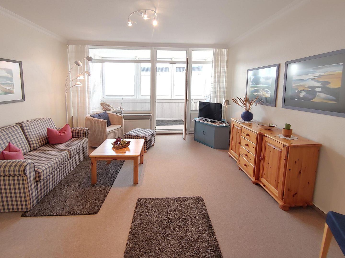 Die Wohnung verfügt über 1 Wohnraum mit Sat-TV und offener Küche, 1 Schlafzimmer, 1 Badezimmer mit Dusche und WC; geschlossener West-Balkon mit Blick zum Amrumer Yachthafen.
