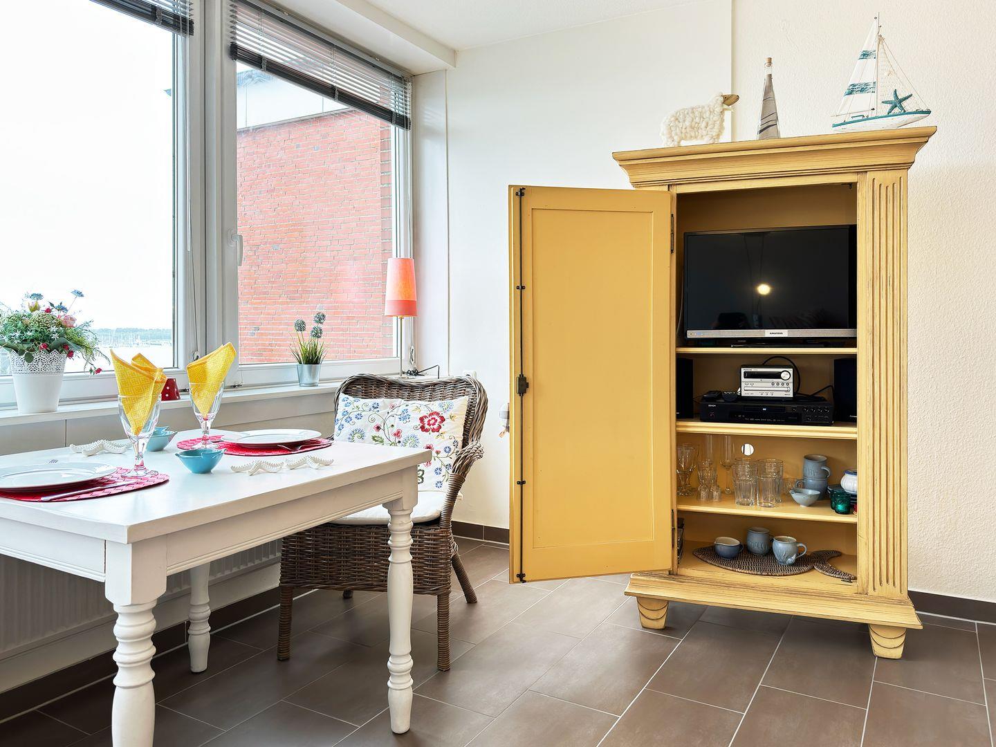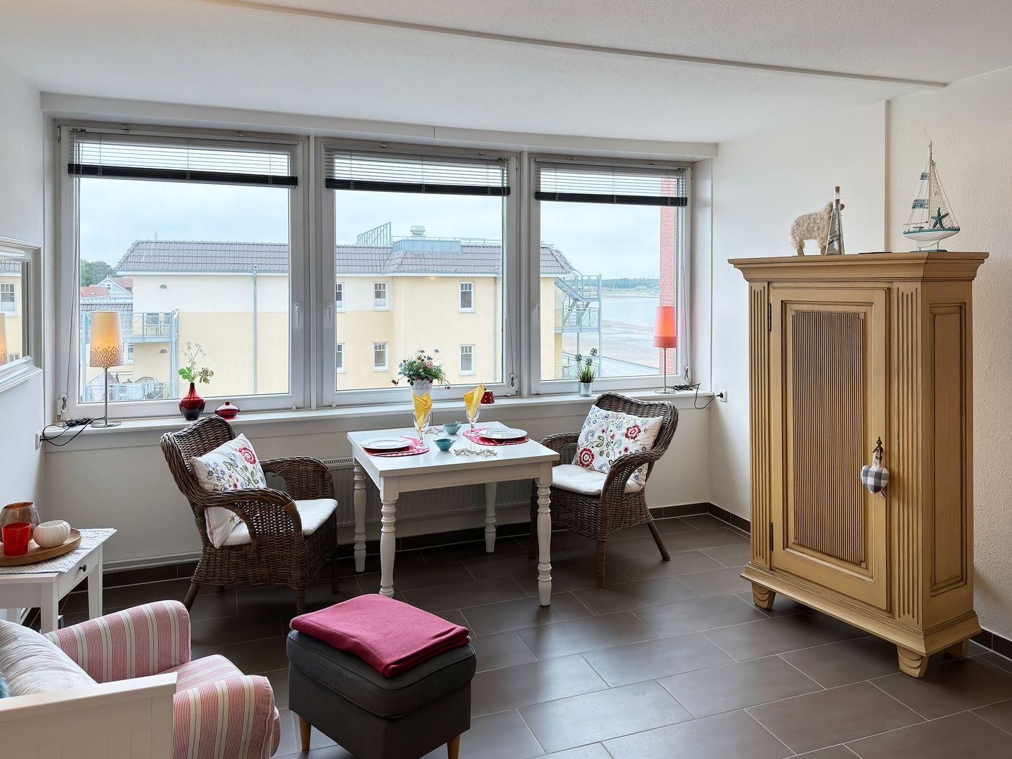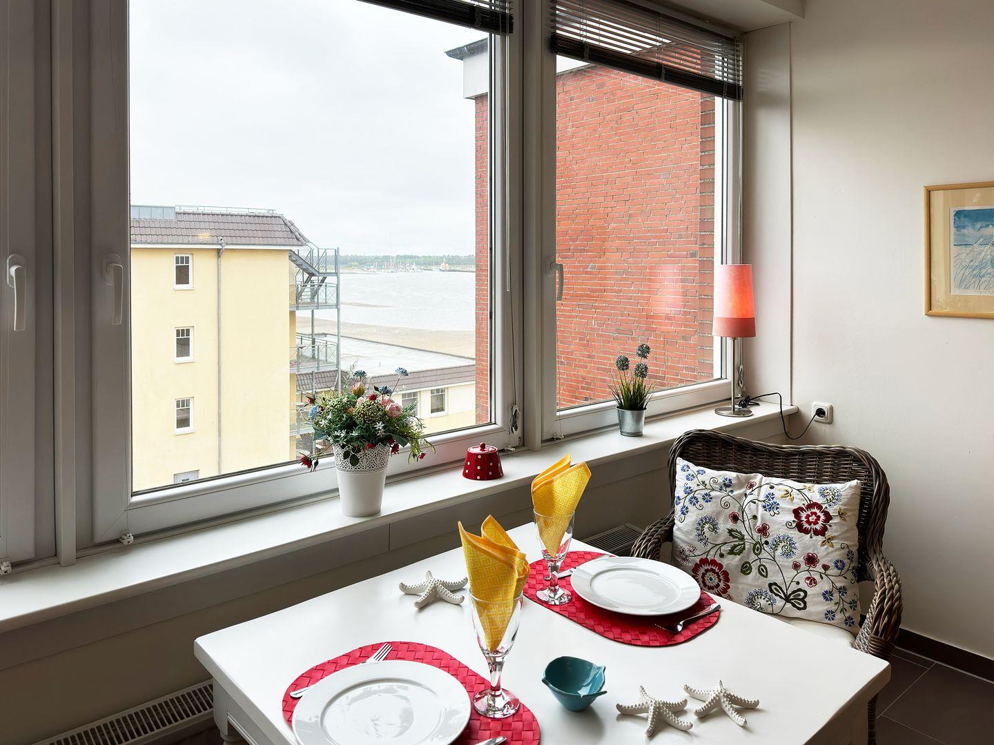 Die Wohnung verfügt über 1 Wohnraum mit Sat-TV und offener Küche, 1 Schlafzimmer, 1 Badezimmer mit Dusche und WC, seitlicher Blick zum Wattenmeer und dem Yachthafen.