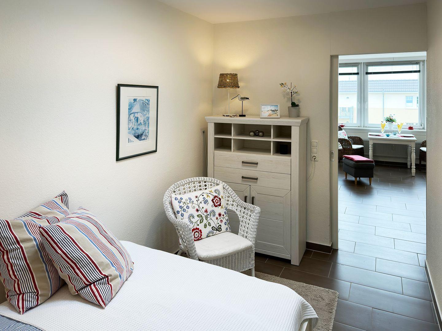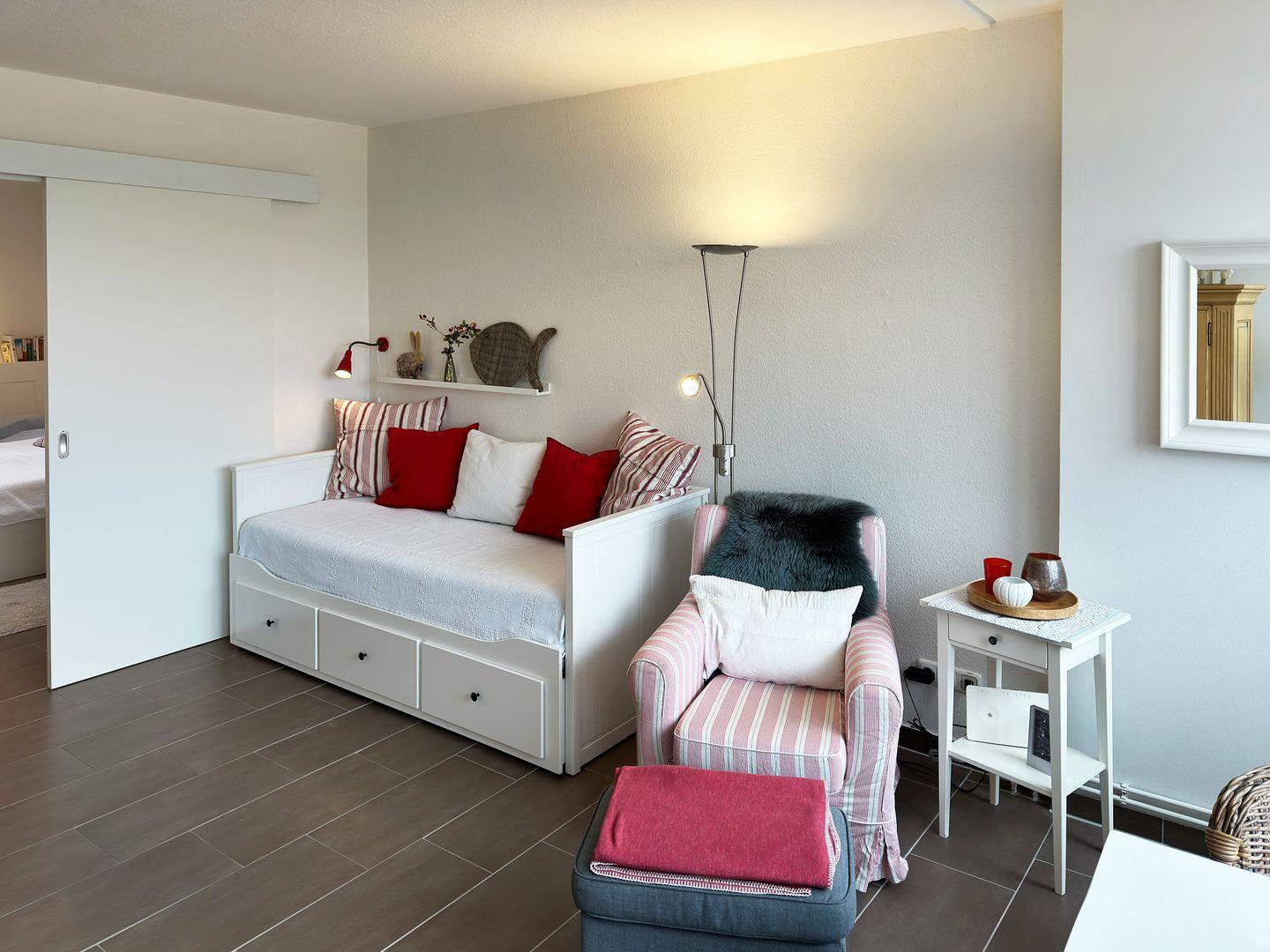 Die Ferienwohnung „Watt'n Blick" im 3. Obergeschoss des Hauses „Nordenlicht" in Wittdün auf Amrum ist eine 2-Zimmer-Ferienwohnung (ca. 38 qm Grundfläche) mit Schlafmöglichkeiten für 1 bis 2 Personen.