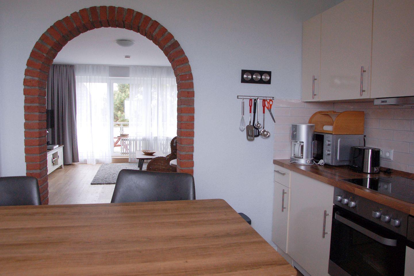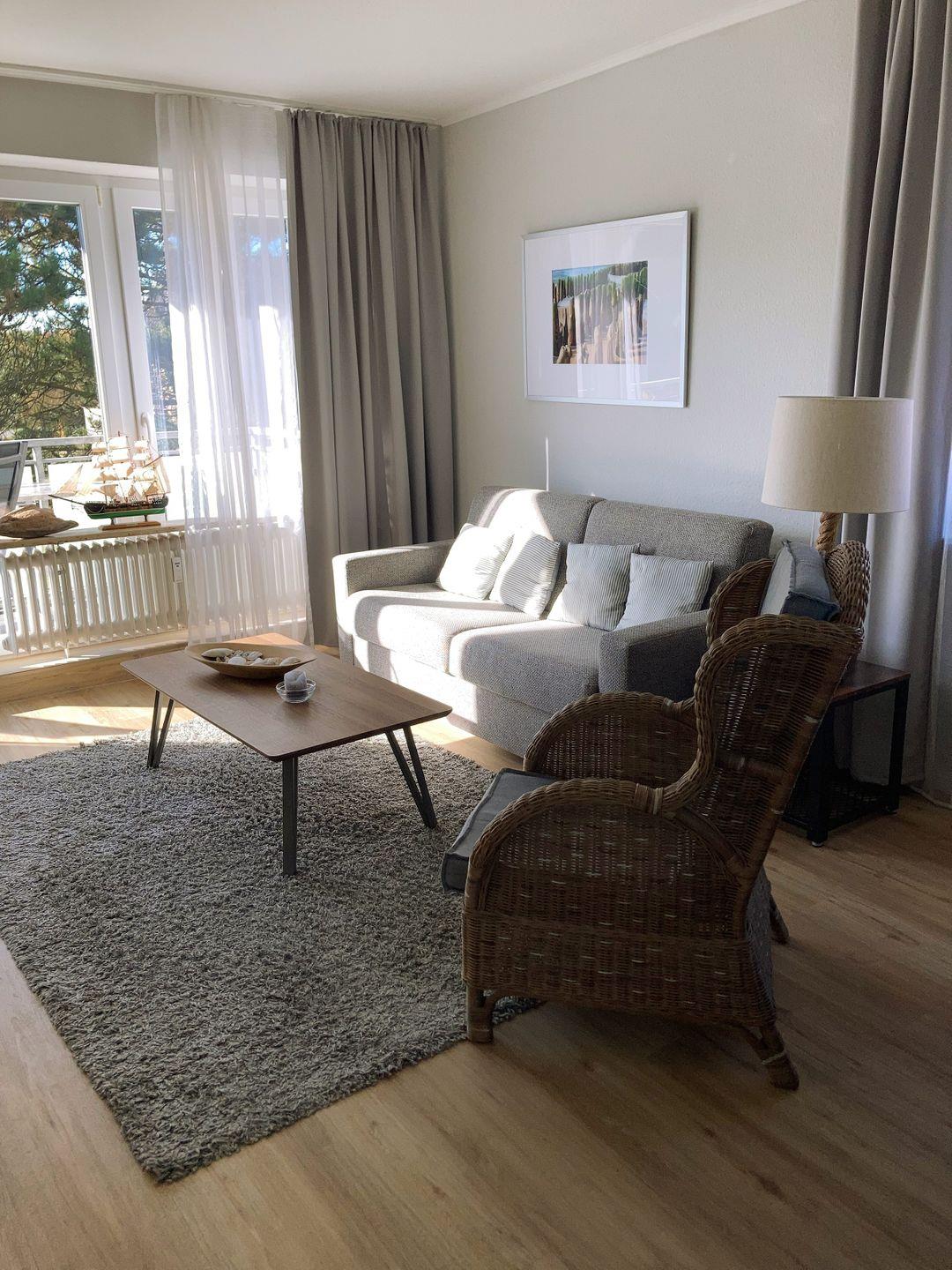Die Wohnung verfügt über 1 Wohnraum mit WLAN, Sat-TV und offener Küche mit Meerblick, 1 Schlafzimmer, 1 Badezimmer mit Dusche und WC; 1 offener Süd-West-Balkon mit 2 Stühlen und 1 Tisch (April bis Oktober).