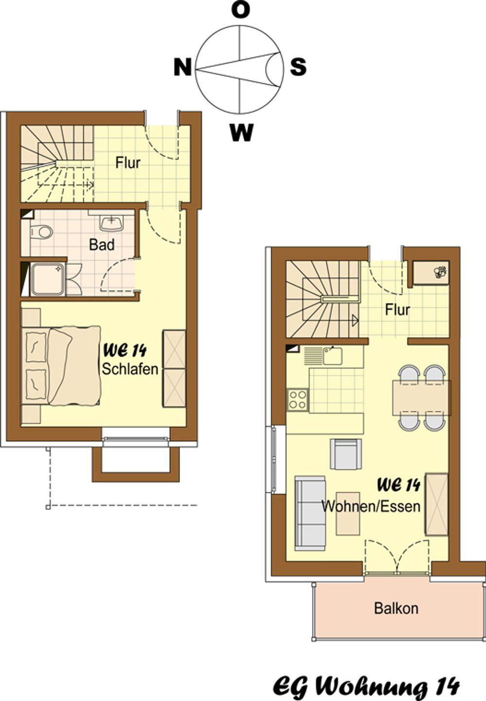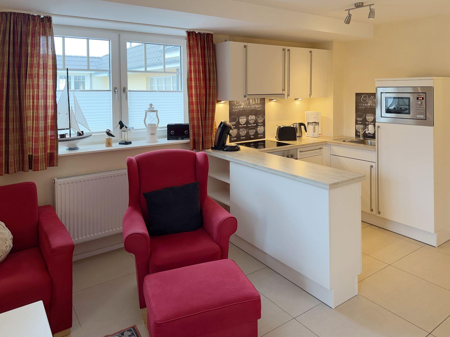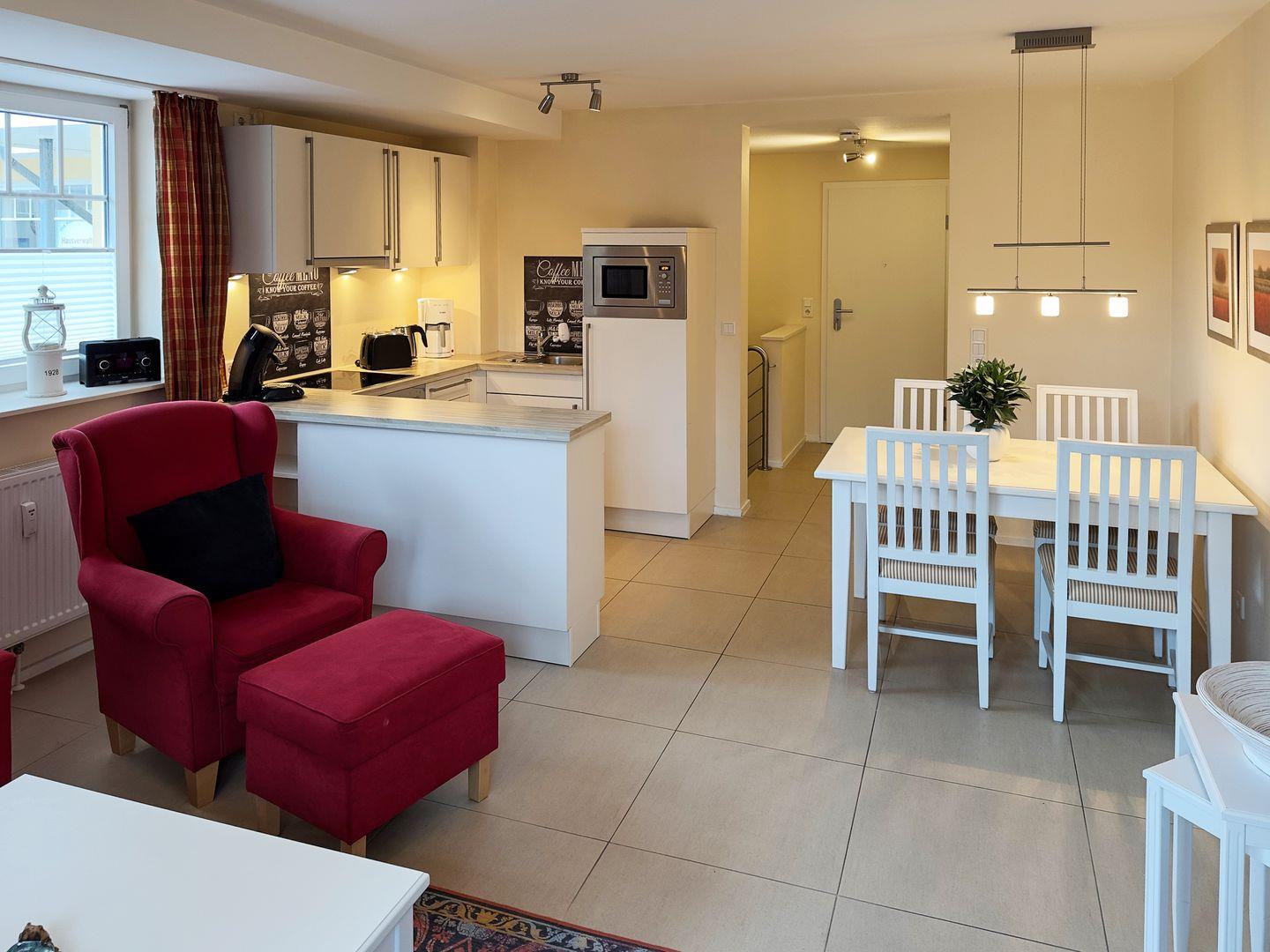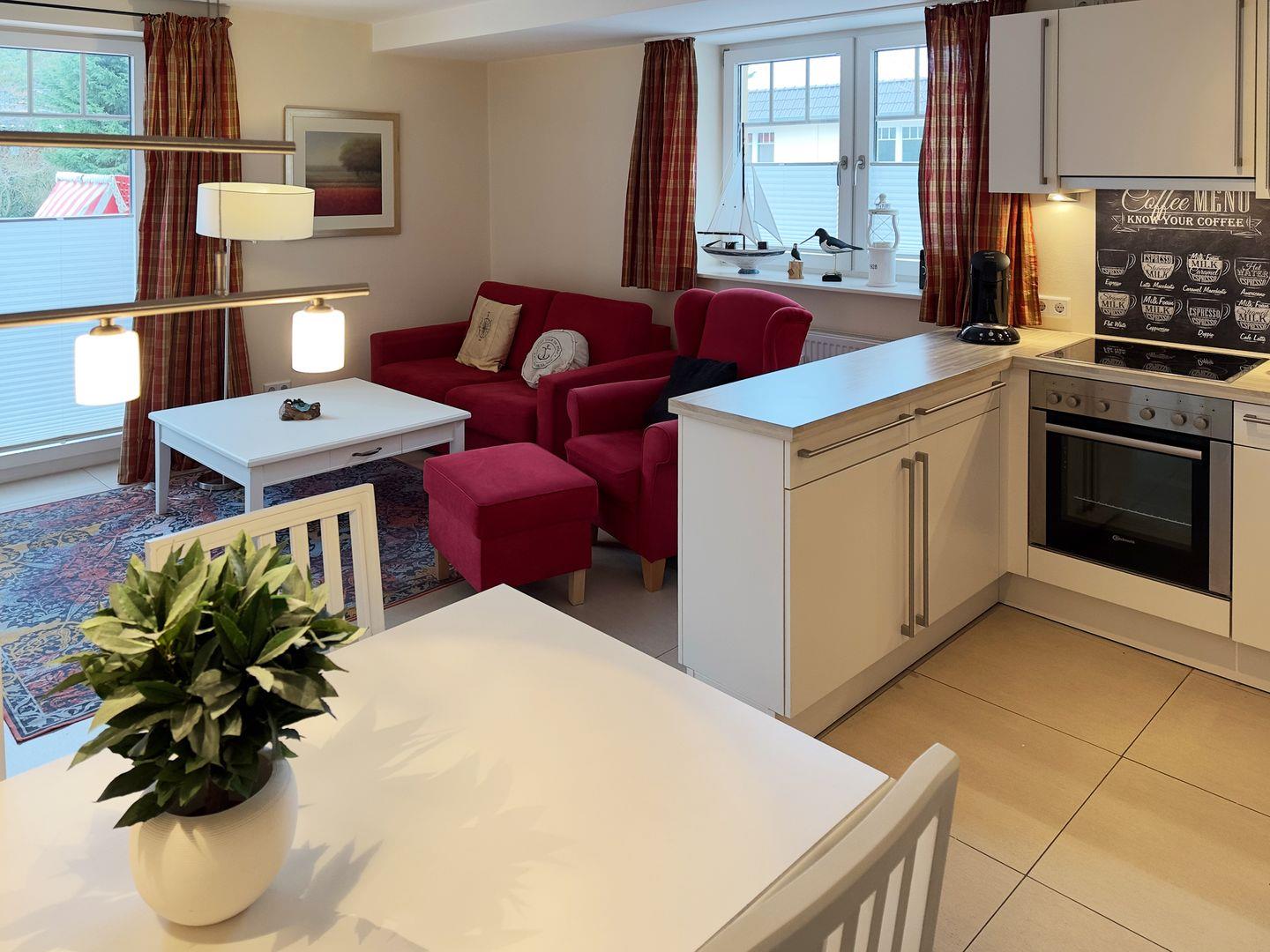 Die Wohnung verfügt über 1 Wohnraum mit WLAN, Sat-TV, Digitalradio und offener Küche, 1 Schlafzimmer, 1 Badezimmer mit Dusche und WC; Balkon mit Gartenmöbeln (April bis Oktober).