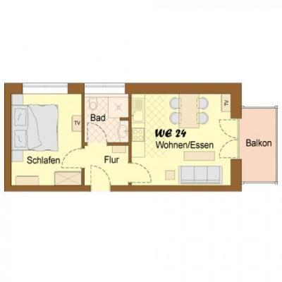 Die Wohnung verfügt über 1 Wohnraum mit WLAN, Sat-TV und offener Küche, 1 Schlafzimmer, 1 Badezimmer mit Dusche und WC; ein Süd-Balkon mit Gartenmöbeln (April bis Oktober).