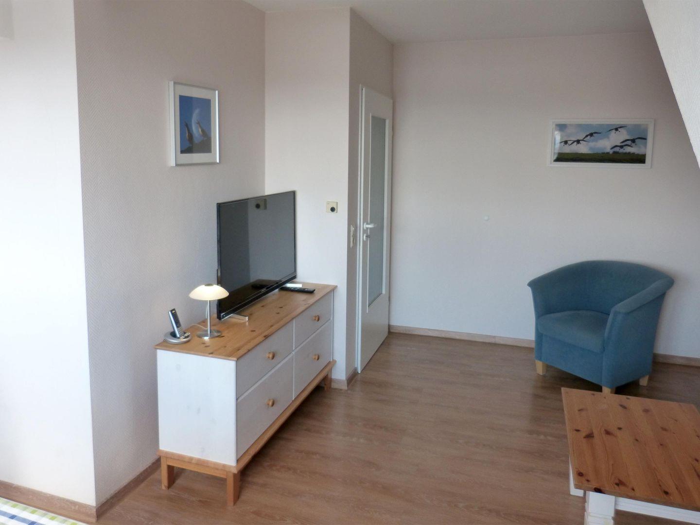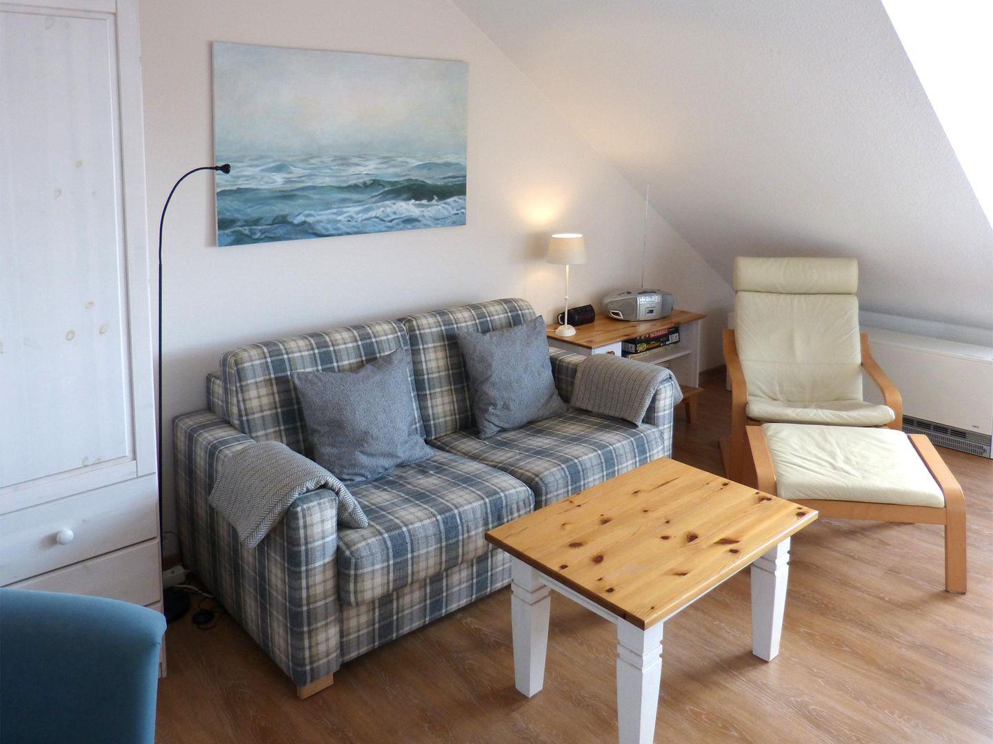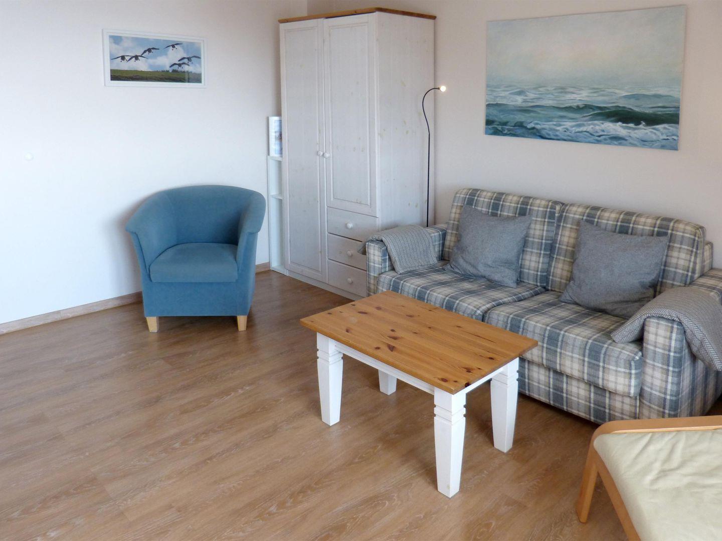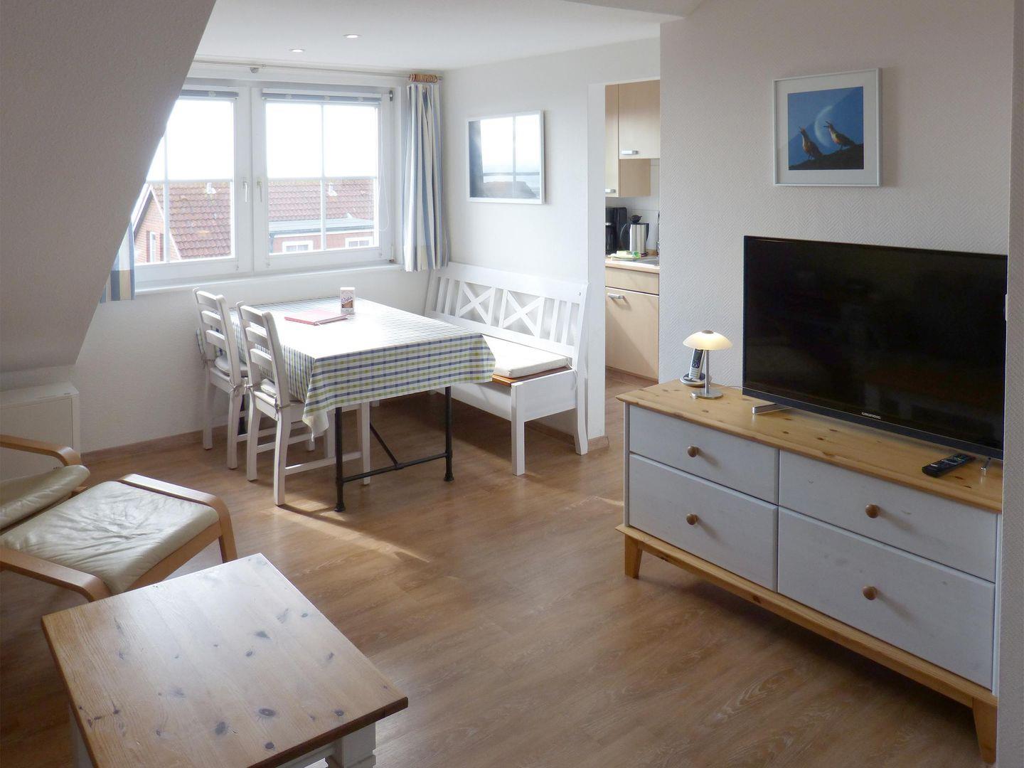 Mit einer Gesamtfläche von ca. 42 m² bietet die Wohnung Platz für bis zu vier Personen und ist ideal für Paare. Die helle und gemütliche Gestaltung der Ferienwohnung schafft eine einladende Atmosphäre, in der Sie sich rundum wohlfühlen können. Das Wohnzimmer, ausgestattet mit einem bequemen Sofa und einem TV, lädt zu gemeinsamen Fernsehabenden oder entspannenden Lesestunden ein. Zudem sorgt der Esstisch für gesellige Mahlzeiten, die Sie in der voll ausgestatteten Küche zubereiten können. Hier finden Sie alles, was Sie brauchen: Herd mit Ceranfeld, Backofen, Kühlschrank sowie Kaffeemaschine und Toaster – auch das Geschirr für ein schönes Dinner ist selbstverständlich vorhanden.