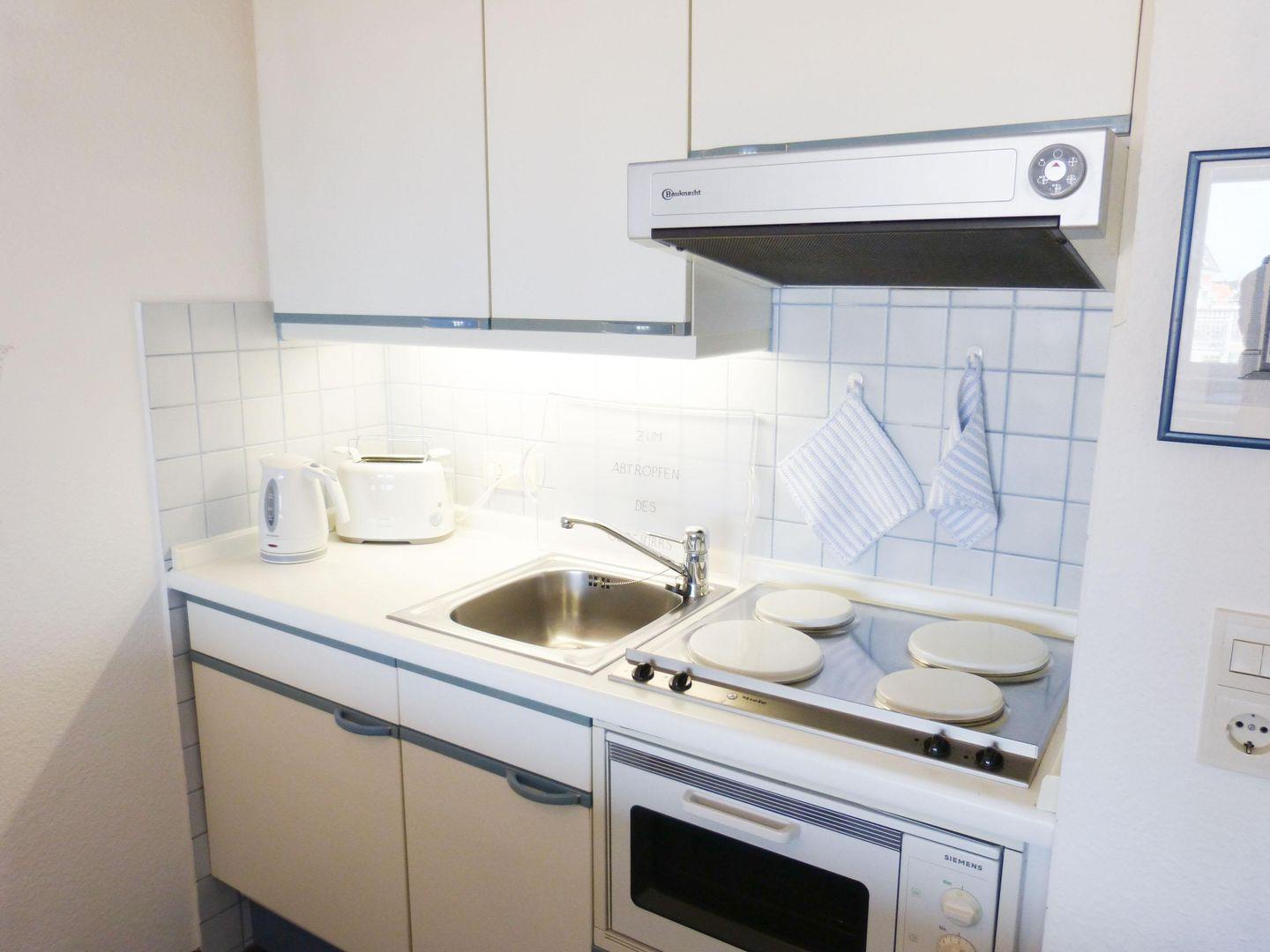 Die Wohnung verfügt über 1 Wohnraum mit WLAN, Sat-TV und offener Küche, 1 Schlafcouch, 1 Badezimmer mit Dusche und WC; 1 geschlossener West-Balkon mit Meerblick.