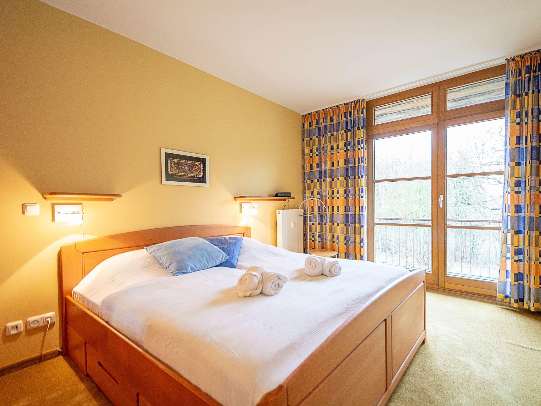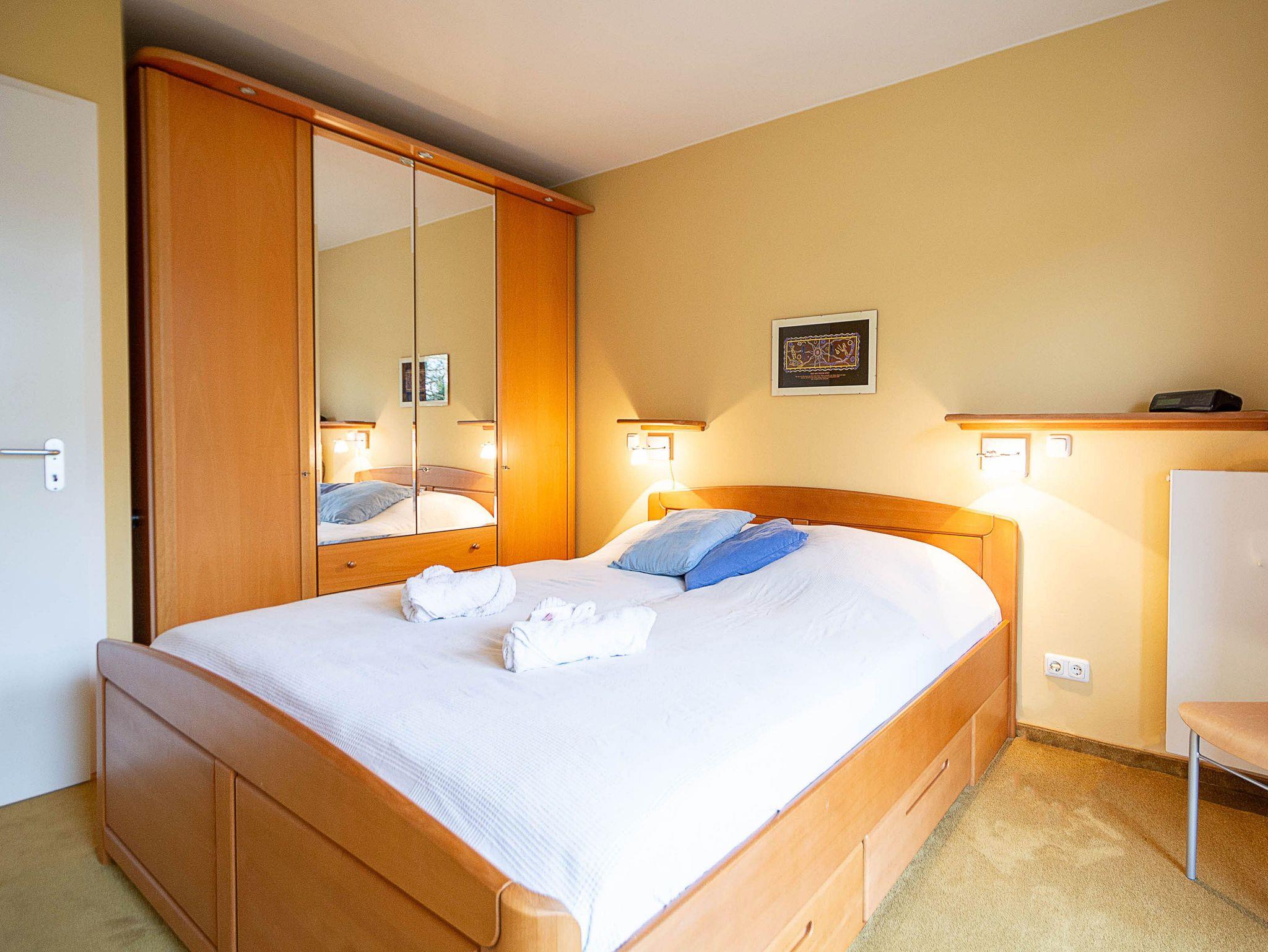 Im ersten Schlafzimmer finden Sie ein komfortables Doppelbett (180 x 200 cm), einen großen Kleiderschrank mit Ganzkörperspiegel und einen Herrendiener. Von hier aus gelangen Sie auf den nach Westen ausgerichteten Balkon, der sich ideal eignet, um die Abendsonne zu genießen. Das zweite Schlafzimmer ist mit einer ausziehbaren Schlafcouch (160 cm Breite) und einem weiteren Kleiderschrank ausgestattet. Flauschige Teppiche sorgen in beiden Schlafzimmern für ein behagliches Ambiente, während abdunkelbare Thermovorhänge Ihnen erholsame Nächte garantieren.