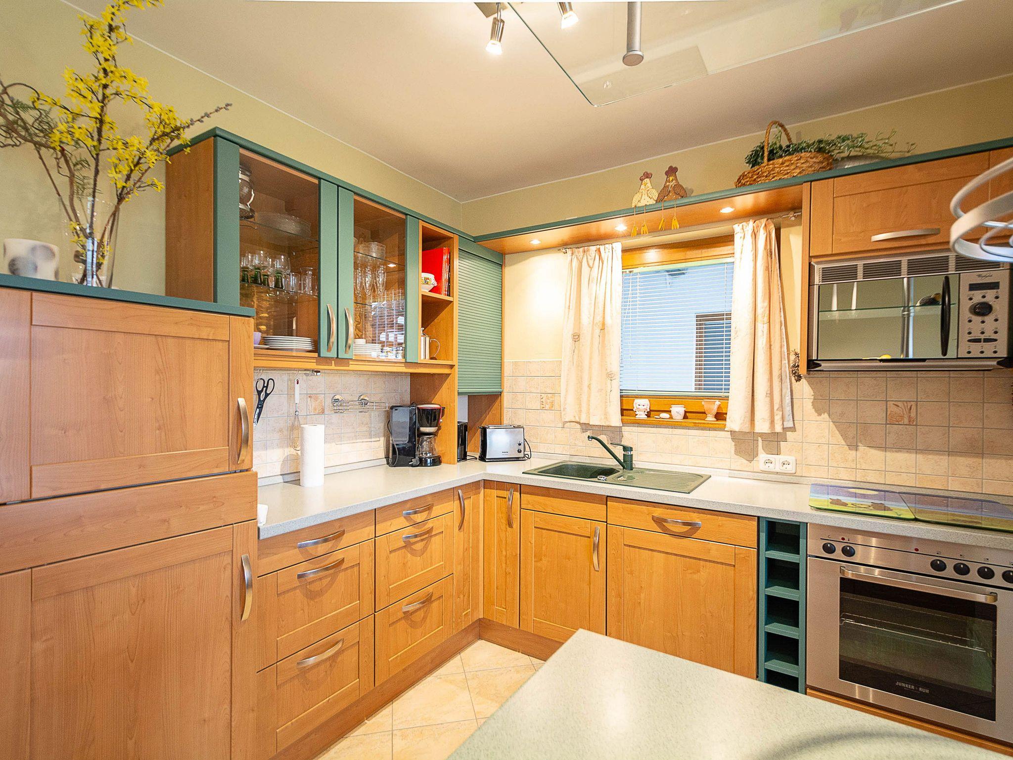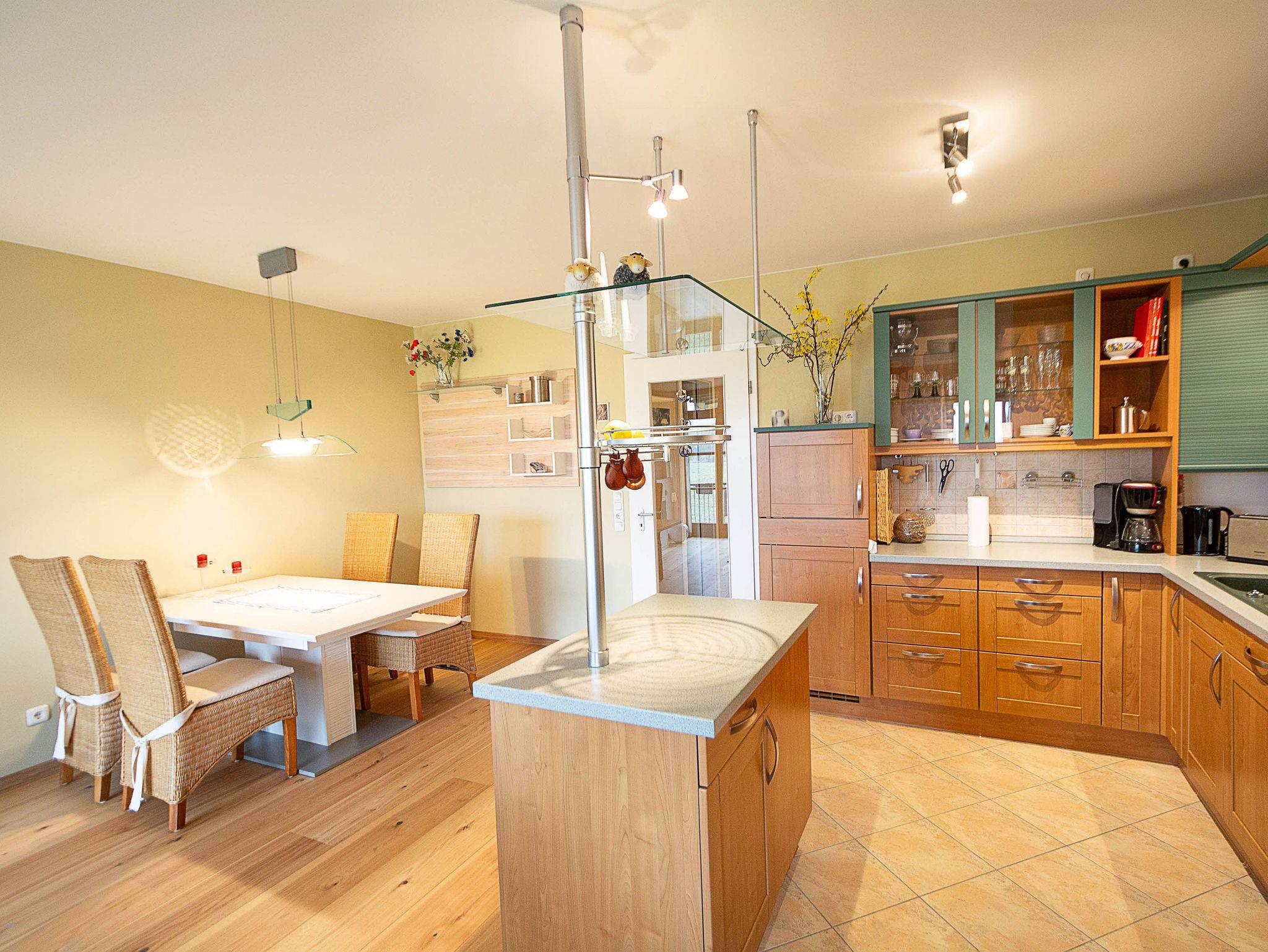 Die angrenzende, voll ausgestattete Wohnküche lässt keine Wünsche offen: Geschirrspüler, Backofen mit Ceranfeld, Kühlschrank, Gefrierschrank, Mikrowelle, Kaffeemaschine, Toaster, Wasserkocher und notwendige Küchenutensilien stehen Ihnen zur Verfügung - damit Sie sich während Ihres Urlaubs rundum wohlfühlen.