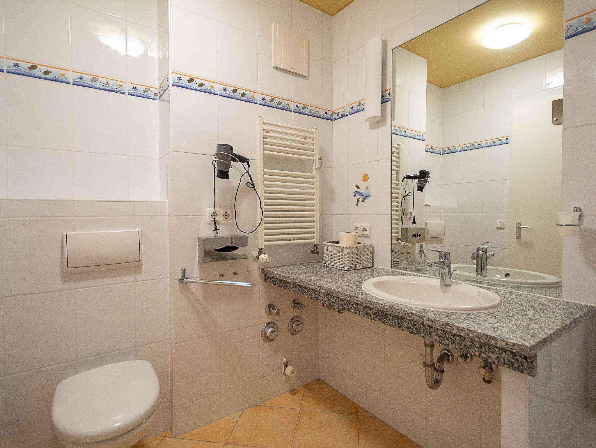 Das stilvolle Badezimmer mit Duschwanne bietet dank Fußbodenheizung und Handtuchheizkörper wohlige Wärme. Ein Haarföhn und ausreichend Ablageflächen runden die komfortable Ausstattung ab.