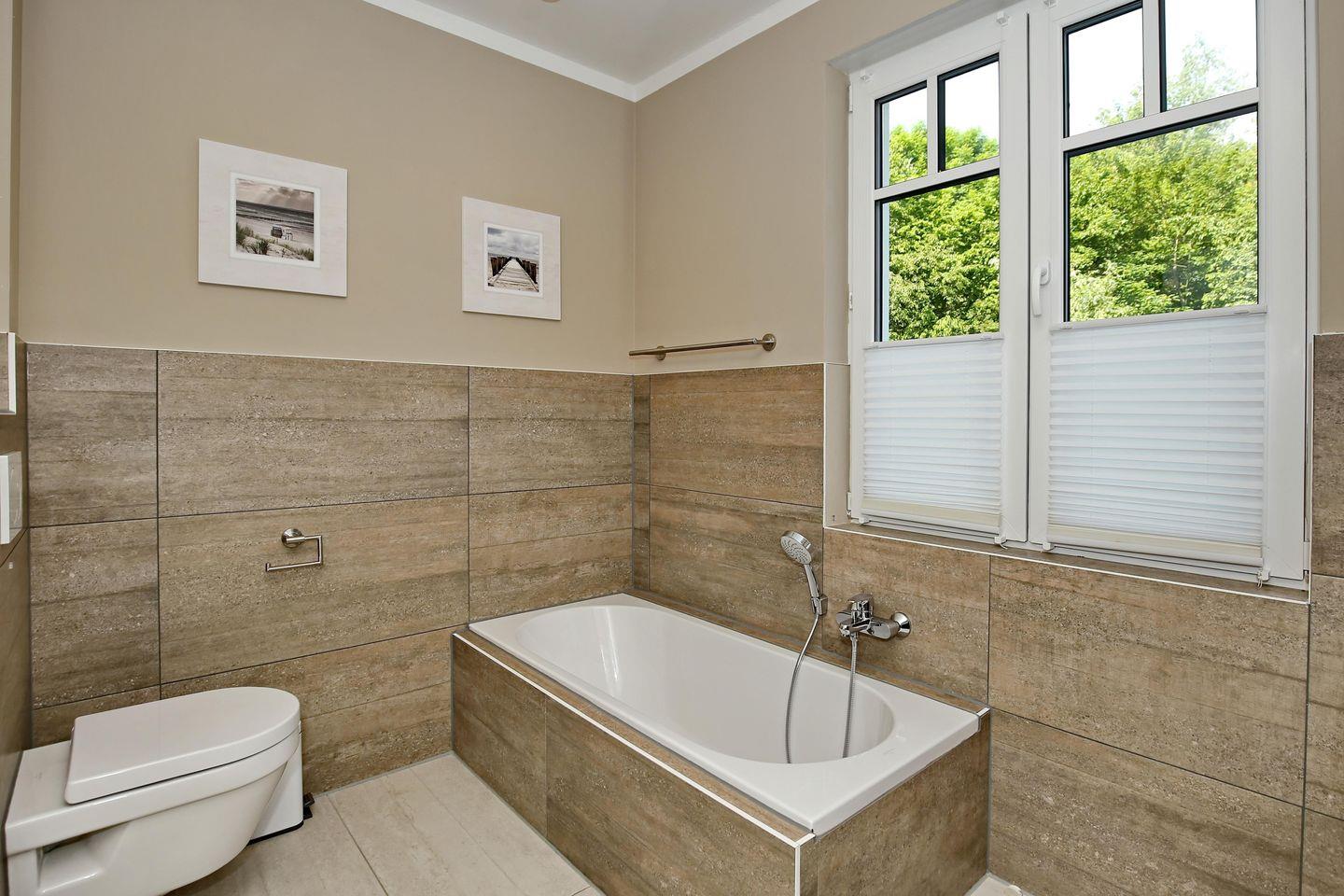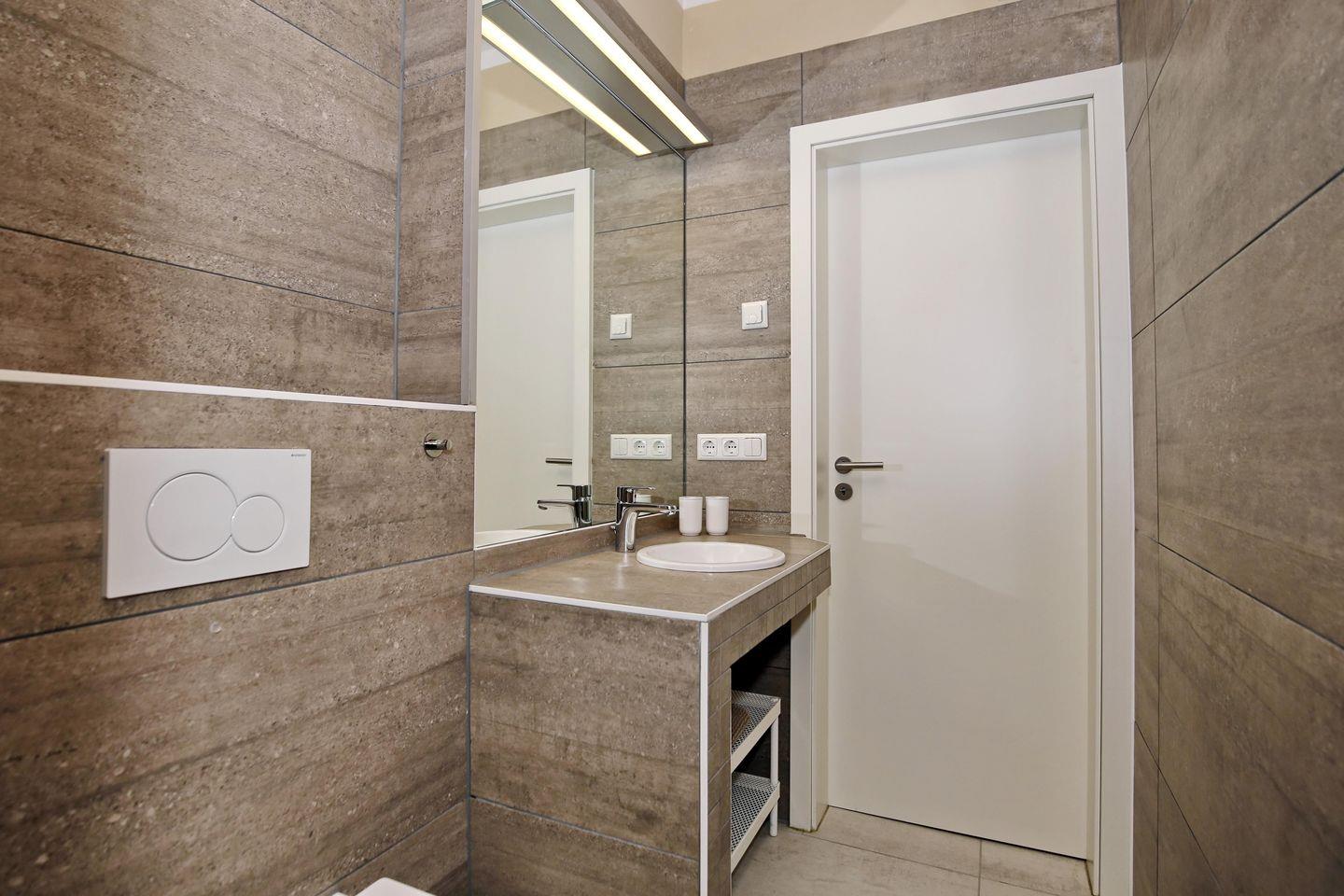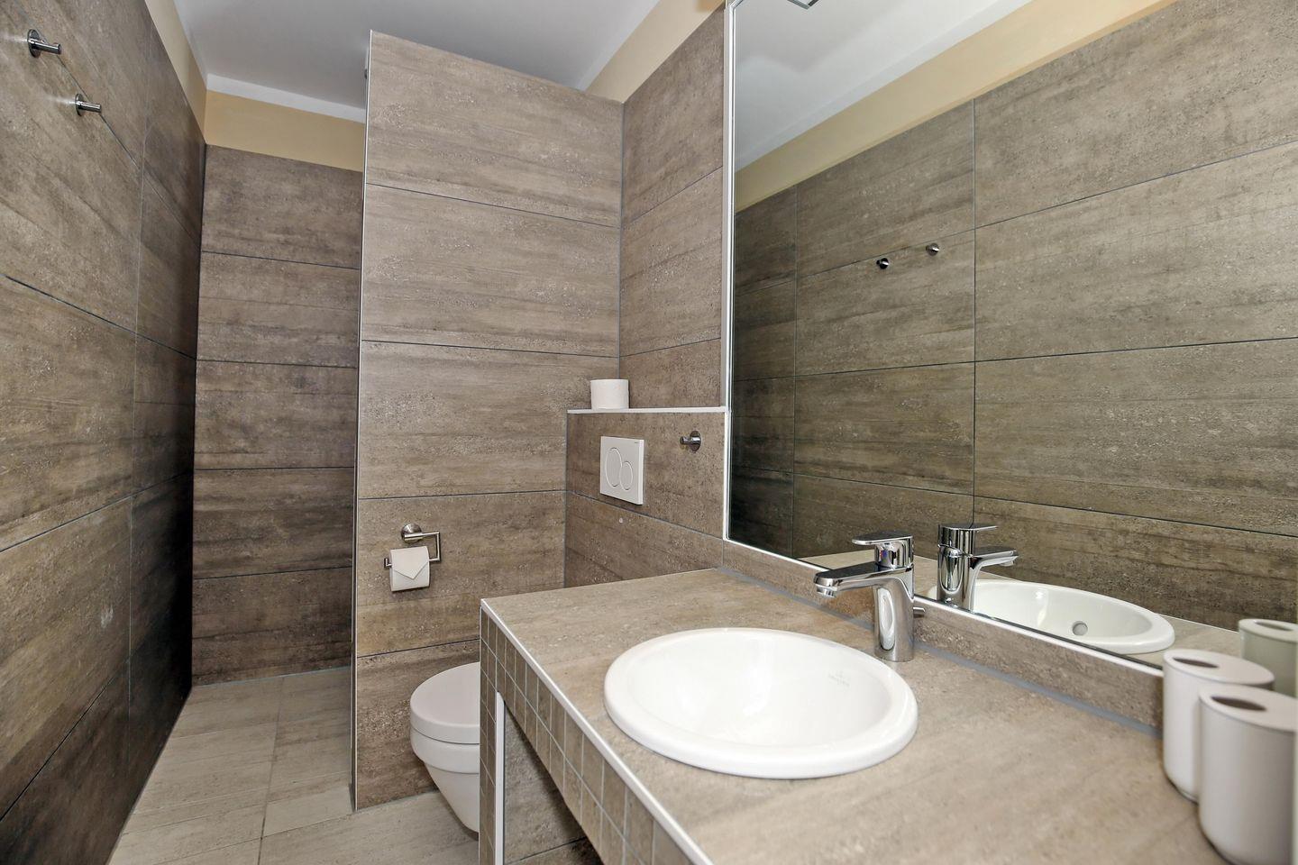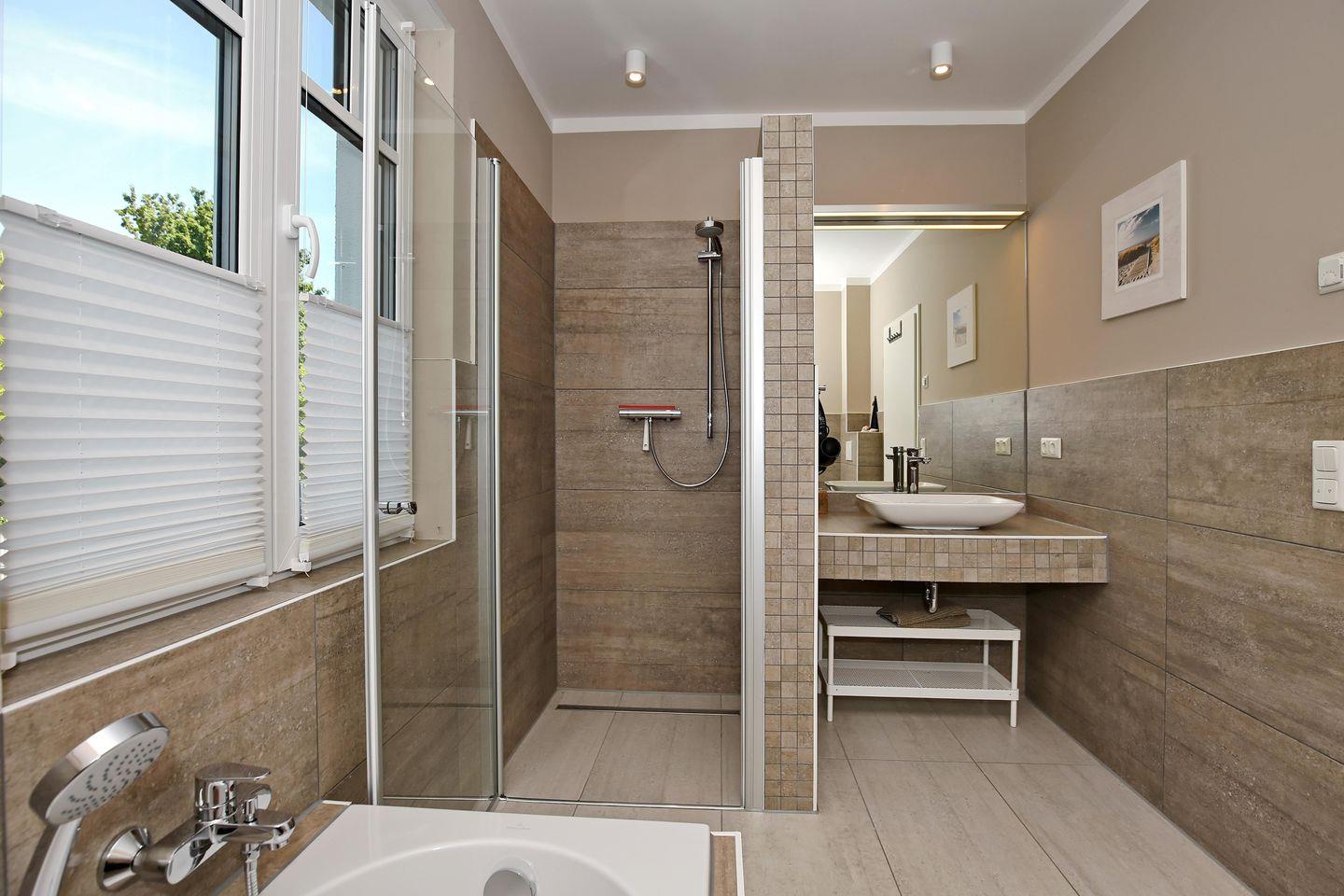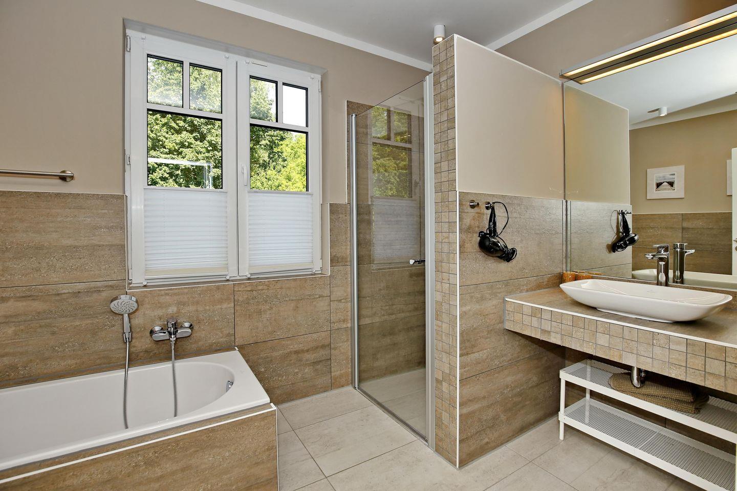 Das Tageslichtbad ist hell und gemütlich modern gestaltet und verfügt über eine ebenerdige Dusche, ein WC, eine Badewanne, einen Waschtisch mit Waschbecken, einen großen beleuchteten Spiegel sowie einen Kosmetikspiegel und einen Föhn. Das andere Badezimmer ist vom hinteren Doppelzimmer aus begehbar und ist mit einer ebenerdigen Dusche, einem WC und einem Waschtisch mit Waschbecken sowie einem großen beleuchteten Spiegel ausgestattet. Die Bäder sind gefliest.