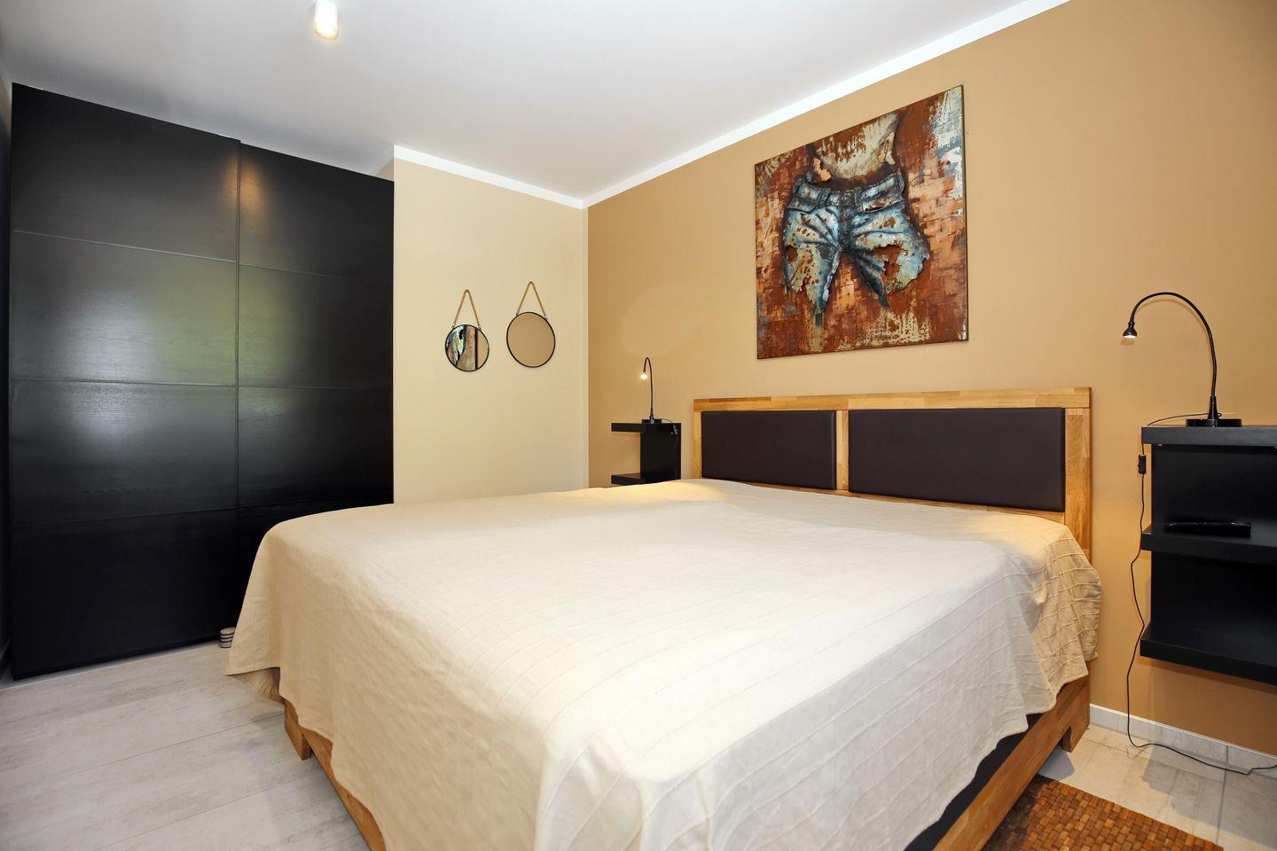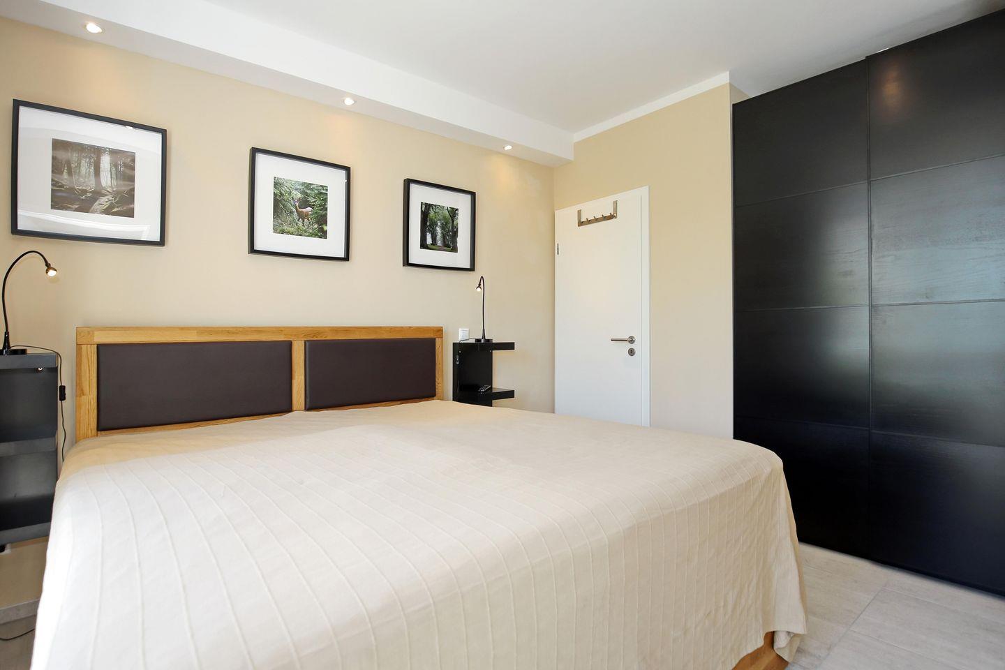 In den Doppelzimmern empfängt dich ein bequemes Boxspringbett mit einer Matratze (200 x 200 cm) zur erholsamen Nachtruhe. Ein großer Kleiderschrank und Nachttische bieten genügend Stauraum für dein Urlaubsgepäck. Ein Flatscreen-TV sorgt für spätabendliche Unterhaltung. Plissees dienen im Esszimmer und Badezimmer als Sichtschutz.
